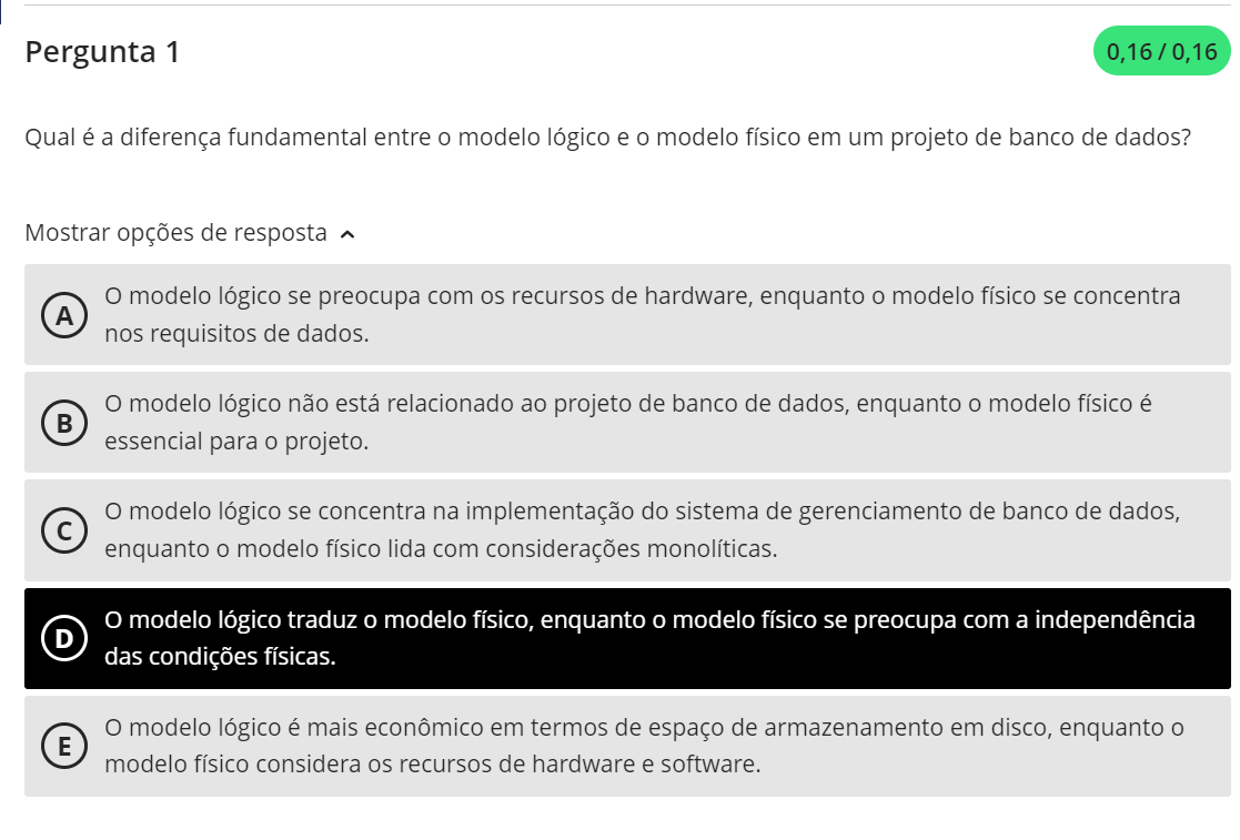 <p>Pergunta 1 0,16 / 0,16 Qual é a diferença fundamental entre o modelo lógico e o modelo físico em um projeto de banco de dados? Mostrar opções de resposta modelo lógico se preocupa com os recursos de hardware, enquanto o modelo físico se concentra A nos requisitos de dados. modelo lógico não está relacionado ao projeto de banco de dados, enquanto o modelo físico é B essencial para o projeto. modelo lógico se concentra na implementação do sistema de gerenciamento de banco de dados, C enquanto o modelo físico lida com considerações monolíticas. O modelo lógico traduz modelo físico, enquanto modelo físico se preocupa com a independência D das condições físicas. modelo lógico é mais econômico em termos de espaço de armazenamento em disco, enquanto o E modelo físico considera os recursos de hardware e software.</p>