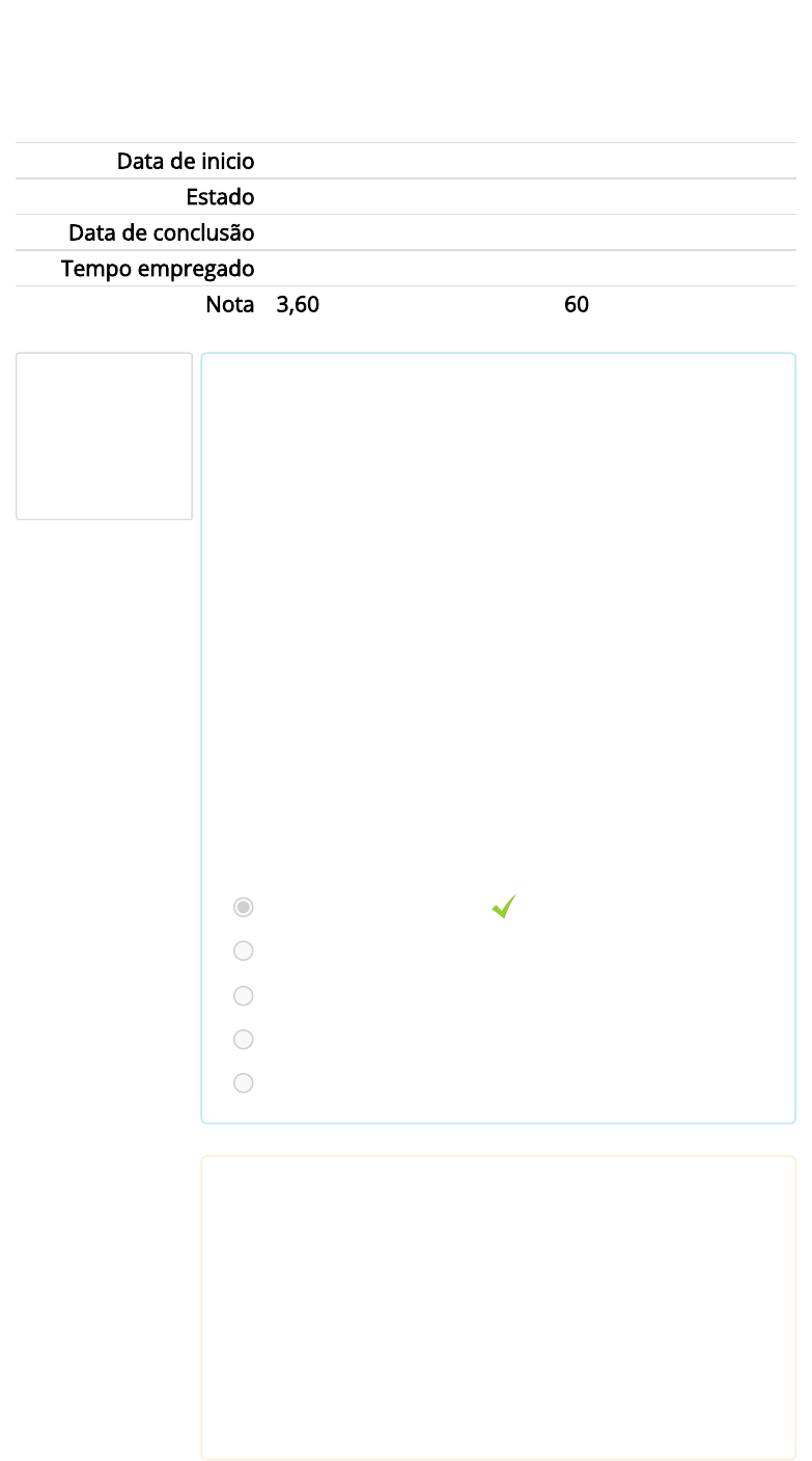 <p>Questão 1</p><p>Correto</p><p>Atingiu 0,60 de</p><p>0,60</p><p>Gestão Integrada da Qualidade (QSSMA) C. A. ► Avaliação ►</p><p>PROVA</p><p>Data de inicio sexta, 16 Ago 2024, 21:15</p><p>Estado Finalizada</p><p>Data de conclusão domingo, 18 Ago 2024, 19:06</p><p>Tempo empregado 1 dia 21 horas</p><p>Nota 3,60 de um máximo de 6,00(60%)</p><p>É uma ferramenta que tem em seu princípio</p><p>que 80% das dificuldades são oriundas de</p><p>20% dos problemas, ou seja, uma quantidade</p><p>pequena ou moderada de problemas levam a</p><p>inúmeras dificuldades, portanto é de vital</p><p>importância analisar o problema apresentado</p><p>para que não se transforme em um grande</p><p>pesadelo futuro.</p><p>Assinale a alternativa que corresponde a qual</p><p>ferramenta estamos tratando:</p><p>Escolha uma:</p><p>a. Gráfico de Pareto</p><p>b. Diagrama de Taguchi</p><p>c. Espinha de peixe</p><p>d. Estratificação</p><p>e. 5´S</p><p>Sua resposta está correta.</p><p>Diagrama de Pareto, ou diagrama 80/20 é</p><p>uma representação gráfica relacionada a uma</p><p>amostra de valores em relação a uma</p><p>classificação pré estabelecida.</p><p>A resposta correta é: Gráfico de Pareto.</p><p>https://moodle.universoead.com.br/course/view.php?id=1143</p><p>https://moodle.universoead.com.br/mod/quiz/view.php?id=25133</p><p>Questão 2</p><p>Incorreto</p><p>Atingiu 0,00 de</p><p>0,60</p><p>Os benefícios de uma ação eficaz para</p><p>melhoria do ambiente e das condições de</p><p>trabalho, quando aliados a um programa de e</p><p>Segurança no trabalho, permitem redução no</p><p>número de acidentes, de doenças</p><p>ocupacionais e de absenteísmo, aumento da</p><p>produtividade e dos resultados positivos da</p><p>empresa. Sobre a saúde ocupacional e</p><p>segurança no trabalho, assinale verdadeiro</p><p>(V) ou falso (F) nas afirmações a seguir:</p><p>( ) Tem como vantagens a qualidade no</p><p>trabalho e a melhoria na qualidade de vida</p><p>dos colaboradores.</p><p>( ) Tem-se os aspectos preventivos com a</p><p>saúde ocupacional e segurança no trabalho,</p><p>os quais buscam minimizar os riscos e as</p><p>condições inadequadas.</p><p>( ) Podemos afirmar que somente as</p><p>indústrias oferecem riscos relacionados à</p><p>saúde ocupacional e à segurança no trabalho.</p><p>( ) São exemplos de Equipamentos de</p><p>Proteção Individual (EPIs): capacetes, luvas,</p><p>máscaras, botas, dentre outros.</p><p>( ) A principal função da saúde ocupacional e</p><p>segurança no trabalho é o tratamento com as</p><p>emergências, atuando principalmente na</p><p>remediação de acidentes.</p><p>Escolha uma:</p><p>a. V, V, F, V, F.</p><p>b. F, F, F, V, V.</p><p>c. V, V, V, F, F.</p><p>d. V, F, V, V, F.</p><p>e. F, F, V, V, V.</p><p>Sua resposta está incorreta.</p><p>(V) Tem como vantagens a qualidade no</p><p>trabalho e a melhoria na qualidade de vida</p><p>dos colaboradores.</p><p>(V) Tem-se os aspectos preventivos com a</p><p>saúde ocupacional e segurança no trabalho,</p><p>os quais buscam minimizar os riscos e as</p><p>Questão 3</p><p>Correto</p><p>Atingiu 0,60 de</p><p>0,60</p><p>condições inadequadas.</p><p>(F) Podemos afirmar que somente as</p><p>indústrias oferecem riscos relacionados à</p><p>saúde ocupacional e à segurança no trabalho.</p><p>(V) São exemplos de Equipamentos de</p><p>Proteção Individual (EPIs): capacetes, luvas,</p><p>máscaras, botas, dentre outros.</p><p>(F) A principal função da saúde ocupacional e</p><p>segurança no trabalho é o tratamento com as</p><p>emergências, atuando principalmente na</p><p>remediação de acidentes.</p><p>A resposta correta é: V, V, F, V, F..</p><p>O PDCA é utilizado para o controle e melhoria</p><p>contínua de processos e produtos. Sobre o</p><p>significado do PDCA, assinale a afirmativa</p><p>correta.</p><p>Escolha uma:</p><p>a. Plan – Do – Check – Act</p><p>b. Plan – Deming – Check – Act</p><p>c. Planing – Deming – Checking – Acting</p><p>d. Plan – Dmaic – Check – Act</p><p>e. Definir – Medir – Analisar – Melhorar –</p><p>Controlar</p><p>Sua resposta está correta.</p><p>Planejamento, execução, checagem e ação</p><p>A resposta correta é: Plan – Do – Check – Act.</p><p>Questão 4</p><p>Correto</p><p>Atingiu 0,60 de</p><p>0,60</p><p>O diagrama de causa e efeito, ou diagrama de</p><p>Ishikawa tem por objetivo analisar as</p><p>operações dos processos produtivos. Sobre o</p><p>diagrama de causa e efeito, podemos afirmar</p><p>que:</p><p>Escolha uma:</p><p>a. Essa ferramenta tem como modelo</p><p>visual uma forma de uma folha ou planilha</p><p>determinada. Permite uma rápida</p><p>percepção de como o processo se</p><p>desenvolve e imediata interpretação da</p><p>situação atual em que ele se encontra.</p><p>b.</p><p>Essa ferramenta busca analisar os dados</p><p>gerados pelo processo, a fim de verificar</p><p>se estes estão adequados ao resultado</p><p>pretendido, caso não estejam, verificam-se</p><p>os desvios e se fazem propostas de</p><p>mudanças.</p><p>c.</p><p>Essa ferramenta tem por intuito facilitar</p><p>que a qualidade esteja presente na função</p><p>de gerenciamento organizacional, em uma</p><p>tentativa de ampliar seu foco, não se</p><p>limitando às atividades inerentes ao</p><p>controle.</p><p>d. Essa ferramenta procura facilitar a</p><p>identificação dos problemas que devem</p><p>ser sanados, ou, até mesmo, os fatores</p><p>que levam a determinado resultado que se</p><p>deseja obter por meio de uma</p><p>representação semelhante a de uma</p><p>espinha de peixe.</p><p>e. Nenhuma das alternativas anteriores</p><p>está correta.</p><p>Sua resposta está correta.</p><p>O diagrama de Ishikawa auxilia no processo</p><p>de identificação da causa-raiz de um</p><p>problema.</p><p>A resposta correta é: Essa ferramenta procura</p><p>facilitar a identificação dos problemas que</p><p>devem ser sanados, ou, até mesmo, os</p><p>fatores que