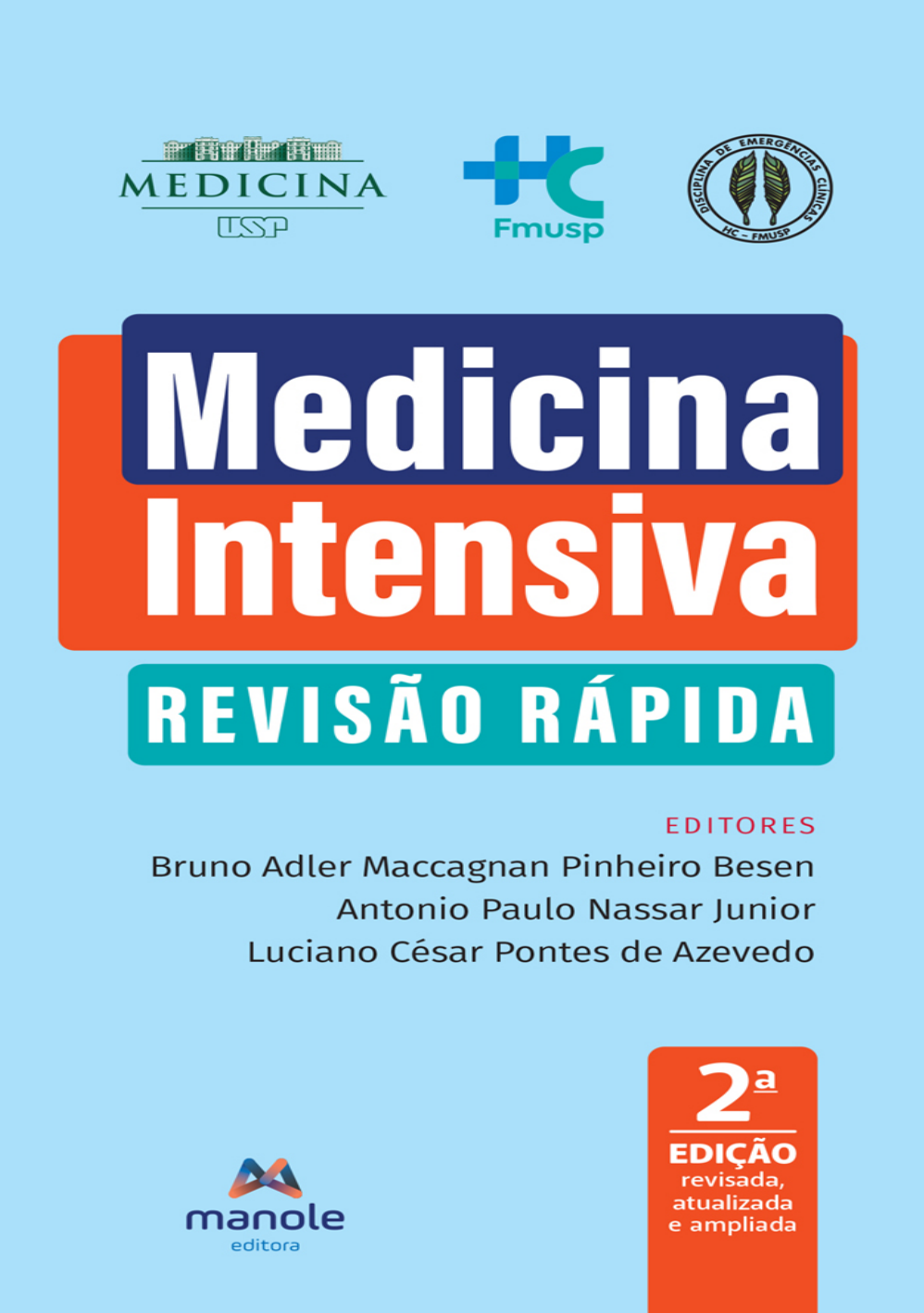 <p>Medicina</p><p>Intensiva</p><p>REVISÃO RÁPIDA</p><p>EDITORES</p><p>Bruno Adler Maccagnan Pinheiro Besen</p><p>Antonio Paulo Nassar Junior</p><p>Luciano César Pontes de Azevedo</p><p>© 2023 Editora Manole, por meio de contrato com os editores.</p><p>“A edição desta obra foi financiada com recursos da Editora Manole Ltda., um projeto de iniciativa da Fundação Faculdade de Medicina</p><p>em conjunto e com a anuência da Faculdade de Medicina da Universidade de São Paulo – FMUSP.”</p><p>Logotipo © Hospital das Clínicas – FMUSP</p><p>© Faculdade de Medicina da Universidade de São Paulo</p><p>© Disciplina de Emergências Clínicas – HCFMUSP</p><p>Editora: Eliane Usui</p><p>Projeto gráfico: Departamento de arte da Editora Manole</p><p>Editoração eletrônica: HiDesign Estúdio</p><p>Ilustrações: Alexandre Bueno, HiDesign Estúdio</p><p>Capa: Ricardo Yoshiaki Nitta Rodrigues</p><p>CIP-BRASIL. CATALOGAÇÃO NA PUBLICAÇÃO</p><p>SINDICATO NACIONAL DOS EDITORES DE LIVROS, RJ</p><p>M442</p><p>2. ed.</p><p>Medicina intensiva : revisão rápida / editores Bruno Adler Maccagnan Pinheiro Besen, Antonio Paulo Nassar Junior, Luciano César</p><p>Pontes de Azevedo. - 2. ed. - Santana de Parnaíba [SP] : Manole, 2023.</p><p>Inclui bibliografia e índice</p><p>ISBN 9788520465950</p><p>1. Medicina intensiva. 2. Tratamento intensivo. I. Besen, Bruno Adler Maccagnan Pinheiro. II. Nassar Junior, Antonio Paulo. III.</p><p>Azevedo, Luciano César Pontes de.</p><p>23-82053</p><p>CDD: 616.028</p><p>CDU: 616.07</p><p>Meri Gleice Rodrigues de Souza - Bibliotecária - CRB-7/6439</p><p>1a edição – 2018. 1a reimpressão – 2021. 2a reimpressão – 2021.</p><p>2a edição – 2023.</p><p>Editora Manole Ltda.</p><p>Alameda América, 876 – Tamboré</p><p>Santana de Parnaíba – SP</p><p>06543-315 – Brasil</p><p>Fone: (11) 4196-6000</p><p>manole.com.br | atendimento.manole.com.br</p><p>http://www.manole.com.br/</p><p>https://atendimento.manole.com.br/</p><p>Sobre os editores</p><p>Bruno Adler Maccagnan Pinheiro Besen</p><p>Residência em Medicina Intensiva pelo Hospital das Clínicas da Faculdade de Medicina da Universidade de São</p><p>Paulo (HCFMUSP). Titulado em Medicina Intensiva pela Associação de Medicina Intensiva Brasileira (AMIB).</p><p>Doutor em Ciências Médicas pela FMUSP. Médico Assistente da UTI da Disciplina de Emergências Clínicas do</p><p>HCFMUSP. Supervisor do Programa de Residência Médica em Medicina Intensiva do HCFMUSP.</p><p>Antonio Paulo Nassar Junior</p><p>Médico Intensivista do A.C. Camargo Cancer Center. Professor de Pós-graduação do A.C. Camargo Cancer</p><p>Center. Médico Pesquisador do Hospital Israelita Albert Einstein.</p><p>Luciano César Pontes de Azevedo</p><p>Professor Livre-docente da Disciplina de Emergências Clínicas do HCFMUSP. Especialista em Medicina</p><p>Intensiva pela AMIB. Médico Pesquisador e Coordenador da Pós-graduação Stricto Sensu do Hospital Israelita</p><p>Albert Einstein. Editor do livro Medicina Intensiva – Abordagem Prática.</p><p>A Medicina é uma área do conhecimento em constante evolução. Os protocolos de segurança devem ser seguidos,</p><p>porém novas pesquisas e testes clínicos podem merecer análises e revisões, inclusive de regulação, normas técnicas e</p><p>regras do órgão de classe, como códigos de ética, aplicáveis à matéria. Alterações em tratamentos medicamentosos ou</p><p>decorrentes de procedimentos tornam-se necessárias e adequadas. Os leitores, profissionais da saúde que se sirvam</p><p>desta obra como apoio ao conhecimento, são aconselhados a conferir as informações fornecidas pelo fabricante de</p><p>cada medicamento a ser administrado, verificando as condições clínicas e de saúde do paciente, dose recomendada, o</p><p>modo e a duração da administração, bem como as contraindicações e os efeitos adversos. Da mesma forma, são</p><p>aconselhados a verificar também as informações fornecidas sobre a utilização de equipamentos médicos e/ou a</p><p>interpretação de seus resultados em respectivos manuais do fabricante. É responsabilidade do médico, com base na</p><p>sua experiência e na avaliação clínica do paciente e de suas condições de saúde e de eventuais comorbidades,</p><p>determinar as dosagens e o melhor tratamento aplicável a cada situação. As linhas de pesquisa ou de argumentação</p><p>do autor, assim como suas opiniões, não são necessariamente as da Editora.</p><p>Esta obra serve apenas de apoio complementar a estudantes e à prática médica, mas não substitui a avaliação clínica</p><p>e de saúde de pacientes, sendo do leitor – estudante ou profissional da saúde – a responsabilidade pelo uso da obra</p><p>como instrumento complementar à sua experiência e ao seu conhecimento próprio e individual.</p><p>Do mesmo modo, foram empregados todos os esforços para garantir a proteção dos direitos de autor envolvidos na</p><p>obra, inclusive quanto às obras de terceiros e imagens e ilustrações aqui reproduzidas. Caso algum autor se sinta</p><p>prejudicado, favor entrar em contato com a Editora.</p><p>Finalmente, cabe orientar o leitor que a citação de passagens desta obra com o objetivo de debate ou exemplificação</p><p>ou ainda a reprodução de pequenos trechos desta obra para uso privado, sem intuito comercial e desde que não</p><p>prejudique a normal exploração da obra, são, por um lado, permitidas pela Lei de Direitos Autorais, art. 46, incisos II e</p><p>III. Por outro, a mesma Lei de Direitos Autorais, no art. 29, incisos I, VI e VII, proíbe a reprodução parcial ou integral</p><p>desta obra, sem prévia autorização, para uso coletivo, bem como o compartilhamento indiscriminado de cópias não</p><p>autorizadas, inclusive em grupos de grande audiência em redes sociais e aplicativos de mensagens instantâneas. Essa</p><p>prática prejudica a normal exploração da obra pelo seu autor, ameaçando a 