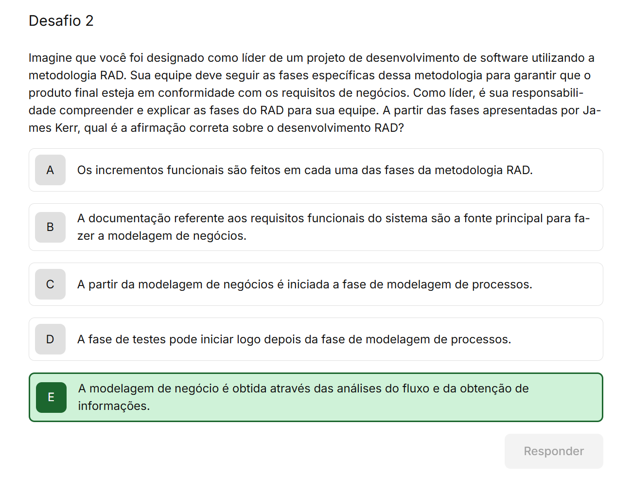 <p>Desafio 2 Imagine que você foi designado como líder de um projeto de desenvolvimento de software utilizando a metodologia RAD. Sua equipe deve seguir as fases específicas dessa metodologia para garantir que o produto final esteja em conformidade com os requisitos de negócios. Como líder, é sua responsabili- dade compreender e explicar as fases do RAD para sua equipe. A partir das fases apresentadas por Ja- mes Kerr, qual é a afirmação correta sobre o desenvolvimento RAD? A Os incrementos funcionais são feitos em cada uma das fases da metodologia RAD. A documentação referente aos requisitos funcionais do sistema são a fonte principal para fa- B zer a modelagem de negócios. C A partir da modelagem de negócios é iniciada a fase de modelagem de processos. D A fase de testes pode iniciar logo depois da fase de modelagem de processos. A modelagem de negócio é obtida através das análises do fluxo e da obtenção de E informações. Responder</p>