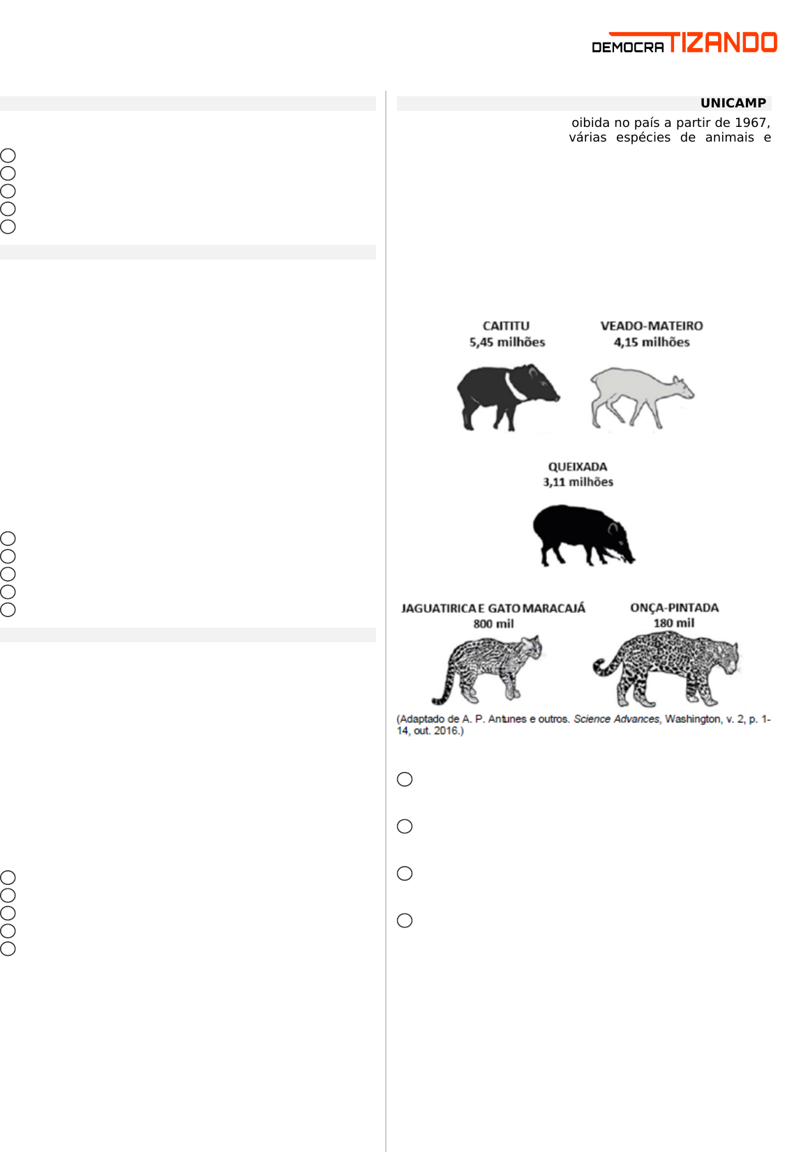 <p>Simulado 158 questões</p><p>IFSudMinas</p><p>a</p><p>b</p><p>c</p><p>d</p><p>e</p><p>Questão 1</p><p>Marque a alternativa que apresenta o exemplo CORRETO</p><p>das relações ecológicas e os respectivos seres vivos.</p><p>Predatismo - serpentes e ratos</p><p>Parasitismo - orquídeas e árvores</p><p>Protocooperação - lombrigas e seres humanos</p><p>Canibalismo - cães e gatos</p><p>Inquilinismo - árvores e erva de passarinho</p><p>FMJ</p><p>a</p><p>b</p><p>c</p><p>d</p><p>e</p><p>Questão 2</p><p>Quando uma cidade despeja lixo produzido no ambiente,</p><p>constitui-se uma das mais graves agressões ao meio.</p><p>Analise as frases relativas a esse assunto.</p><p>I. O lixo depositado a céu aberto acaba atraindo insetos e</p><p>servindo de fonte de alimento e esconderijo para roedores.</p><p>II. A decomposição do lixo orgânico leva à produção de</p><p>metano que, além de ligar-se de forma irreversível à</p><p>hemoglobina, também é um gás que contribui para o</p><p>efeito estufa.</p><p>III. O chorume líquido proveniente da compostagem pode</p><p>contaminar águas subterrâneas.</p><p>IV. A compostagem é um processo no qual restos orgânicos</p><p>sofrem ação de microorganismos anaeróbicos, uma vez</p><p>que macromoléculas devem ser quebradas na ausência</p><p>total de oxigênio.</p><p>Está correto o contido apenas em</p><p>I e II.</p><p>I e III.</p><p>I e IV.</p><p>II e III.</p><p>III e IV.</p><p>UFPR</p><p>a</p><p>b</p><p>c</p><p>d</p><p>e</p><p>Questão 3</p><p>Para atrair potenciais polinizadores, as plantas comumente</p><p>armazenam néctar nas suas flores em estruturas</p><p>específicas chamadas de nectários. Contudo, várias</p><p>espécies de plantas também podem apresentar nectários</p><p>longe das flores, os chamados “nectários extraflorais”.</p><p>Essas estruturas podem ser encontradas em vários locais,</p><p>como folhas e brotos. Durante a sua procura por alimento,</p><p>formigas se deparam com esses nectários, passam a se</p><p>alimentar do néctar produzido, a eles retornando</p><p>repetidamente. Durante essa atividade, as formigas</p><p>acabam patrulhando essas plantas e defendendo-as contra</p><p>potenciais herbívoros, como lagartas e percevejos.</p><p>Esse tipo de interação entre formigas e plantas com</p><p>nectários extraflorais pode ser categorizado como:</p><p>epifitismo.</p><p>mutualismo.</p><p>colonialismo.</p><p>predação.</p><p>parasitismo.</p><p>UNICAMP</p><p>a</p><p>b</p><p>c</p><p>d</p><p>Questão 4</p><p>A caça, que passou a ser proibida no país a partir de 1967,</p><p>reduziu a população de várias espécies de animais e</p><p>contribuiu para o risco de desequilíbrio ambiental. Entre</p><p>1904 e 1969, estima-se que foram mortos pelo menos 20</p><p>milhões de animais silvestres nos Estados de Rondônia,</p><p>Acre, Roraima e Amazonas. A caça ilegal de animais</p><p>silvestres e a falta de fiscalização efetiva em áreas de</p><p>proteção ambiental alertam para a necessidade de</p><p>conservação das espécies.</p><p>(Adaptado de A. Julião e R. Zorzetto. Pesquisa Fapesp, São</p><p>Paulo, v. 249, p. 46-51, nov. 2016.)</p><p>A figura a seguir indica o número total de animais</p><p>terrestres mortos no período de 1904 a 1969.</p><p>Considerando os conhecimentos sobre biologia e as</p><p>informações fornecidas, é possível concluir que</p><p>o impacto da caça dos mamíferos carnívoros na teia</p><p>alimentar é menor que o da caça dos mamíferos</p><p>herbívoros.</p><p>a função ecológica dos grandes mamíferos caçados é</p><p>substituída pela de animais endêmicos de pequeno porte,</p><p>mantendo-se o equilíbrio do ecossistema.</p><p>a caça proporcional dos mamíferos herbívoros e</p><p>carnívoros mantém o fluxo de energia estável na teia</p><p>alimentar.</p><p>a caça dos grandes mamíferos altera a renovação da</p><p>floresta, pois eles desempenham um papel fundamental na</p><p>dispersão de sementes grandes.</p><p>UNICENTRO</p><p>a</p><p>b</p><p>c</p><p>d</p><p>e</p><p>Questão 5</p><p>As bactérias do gênero Rhizobium associam-se às raízes</p><p>de algumas plantas. Tais organismos vivem normalmente</p><p>no solo, onde alcançam o sistema radicular de</p><p>leguminosas jovens e penetram, através dos pelos</p><p>absorventes, instalando-se finalmente nos tecidos corticais</p><p>das raízes.</p><p>Essas bactérias têm grande importância na natureza, pois</p><p>atuam de forma singular, na decomposição da matéria</p><p>orgânica morta presente no solo, além de consumir o</p><p>excesso de CO2 do solo.</p><p>são aquelas que ao converter nitrito em nitrato,</p><p>processo denominado de nitratação, libera nitratos para o</p><p>solo, que podem ser absorvidos pelas plantas.</p><p>fazem parte do grupo das bactérias anaeróbias que</p><p>utilizam nitratos em vez de oxigênio no processo</p><p>respiratório, eliminado o excesso desse composto no solo.</p><p>funciona como um verdadeiro adubo vivo, ao fixar N2</p><p>atmosférico, transformando-o em sais nitrogenados, que</p><p>serão utilizados pelas plantas.</p><p>absorvem os íons amônio em excesso do solo,</p><p>oxidando-os e, com a energia liberada, fabricam</p><p>compostos orgânicos por quimiossíntese, além de</p><p>consumir o excesso de CO2 do solo.</p><p>UERN</p><p>a</p><p>b</p><p>c</p><p>d</p><p>Questão 6</p><p>O esquema a seguir representa uma</p><p>teia alimentar, em que a serpente ocupa três níveis</p><p>tróficos.</p><p>cadeia alimentar, em que a coruja se apresenta como</p><p>consumidor secundário ao comer o lagarto.</p><p>teia alimentar, em que a serpente comporta-se</p><p>somente como consumidor terciário e quaternário.</p><p>cadeia alimentar, em que existem dois consumidores</p><p>primários e quatro consumidores secundários.</p><p>USS</p><p>a</p><p>b</p><p>c</p><p>d</p><p>Questão 7</p><p>Observe a teia alimentar terrestre representada abaixo.</p><p>Sabe-se que a perda de uma espécie provoca efeitos em</p><