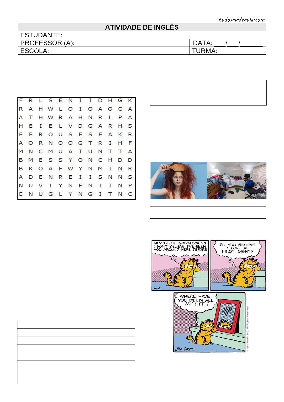 <p>1. Encontre no caça-palavras os adjetivos a</p><p>seguir:</p><p>GORGEOUS – HANDSOME – MESSY – PRETTY –</p><p>SKINNY – STUNNING – THIN – UGLY</p><p>2. Associe a 2° coluna de acordo com a 1°.</p><p>(A) Bald ( ) Deslumbrante</p><p>(B) Beautiful ( ) Acima do peso</p><p>(C) Chubby ( ) Arrumado(a)</p><p>(D) Cute ( ) Bagunçado(a)</p><p>(E) Fat ( ) Bonito</p><p>(F) Gorgeous ( ) Maravilhoso(a)</p><p>(G) Handsome ( ) Gordo(a)</p><p>(H) Messy ( ) Fofo(a)</p><p>(I) Neat ( ) Rechonchudo(a)</p><p>(J) Overweight ( ) Calvo</p><p>(K) Skinny ( ) Magrinho(a)</p><p>(L) Stunning ( ) Linda(o)</p><p>(M) Ugly ( ) Feio(a)</p><p>3. Escrever em inglês as seguintes palavras da</p><p>tabela:</p><p>ACIMA DO PESO</p><p>BAGUNÇADO(A)</p><p>CALVO</p><p>DESLUMBRANTE</p><p>FOFO(A)</p><p>GORDO(A)</p><p>LINDA</p><p>MAGRINHO(A)</p><p>4. Leia a descrição no espaço abaixo e selecione</p><p>o adjetivo correspondente.</p><p>a) Gorgeous.</p><p>b) Pretty.</p><p>c) Well-built.</p><p>d) Cute.</p><p>5. Observe as imagens e escreva em inglês o</p><p>adjetivo em comum que pode descrevê-las.</p><p>6. Leia a tirinha e responda:</p><p>Uma das expressões utilizadas por Garfield em</p><p>sua fala é "GOOD-LOOKING". A partir dessa</p><p>característica, infira corretamente o significado</p><p>escolhendo uma das opções disponíveis.</p><p>Esse termo pode ser usado para descrever</p><p>alguém que tem um corpo bem</p><p>desenvolvido, musculoso e saudável.</p><p>a) É frequentemente usado para descrever algo ou</p><p>alguém que é magro, esguio ou delgado.</p><p>b) É usado para descrever alguém ou algo que tem</p><p>uma aparência atraente, agradável ou bonita</p><p>c) É usado para descrever alguém ou algo que tem</p><p>um excesso de peso corporal ou uma quantidade</p><p>significativa de tecido adiposo.</p><p>d) Refere-se a algo que é arrumado, limpo,</p><p>ordenado e bem organizado.</p><p>7. Observe a imagem e responda:</p><p>Fonte: Cooper / Lit.com</p><p>Na fala da personagem, o adjetivo utilizado para</p><p>descrever a barba do outro personagem é</p><p>"Gorgeous". Em relação a esse adjetivo, assinale</p><p>a opção correta.</p><p>a) Significa que está bagunçada, desorganizada,</p><p>suja ou confusa.</p><p>b) Indica que é esteticamente desagradável ou</p><p>pouco atraente.</p><p>c) Indica que a barba é estreita e fina.</p><p>d) Refere a algo deslumbrante, esplêndido ou belo</p><p>em termos estéticos</p><p>8. Analise a imagem em conjunto com a descrição</p><p>e forneça sua resposta:</p><p>Refere-se a algo adorável, encantador ou</p><p>bonitinho. Esse adjetivo é usado para descrever</p><p>algo que evoca sentimentos de ternura, afeto e</p><p>simpatia. Pode ser aplicada a uma variedade de</p><p>coisas, como animais, crianças, objetos,</p><p>expressões faciais ou até mesmo ações.</p><p>A qual adjetivo pode ser atribuído a essa</p><p>característica? Escreva em inglês.</p><p>9. Analise a frase do quadro e responda:</p><p>Considerando o adjetivo de aparência presente na</p><p>frase, escreva o seu significado no espaço</p><p>fornecido.</p><p>10. Com suas palavras, faça uma descrição para</p><p>os seguintes adjetivos de aparência.</p><p>HANDSOME OVERWEIGHT</p><p>The orc in the fairy tale I was reading was</p><p>very ugly.</p>