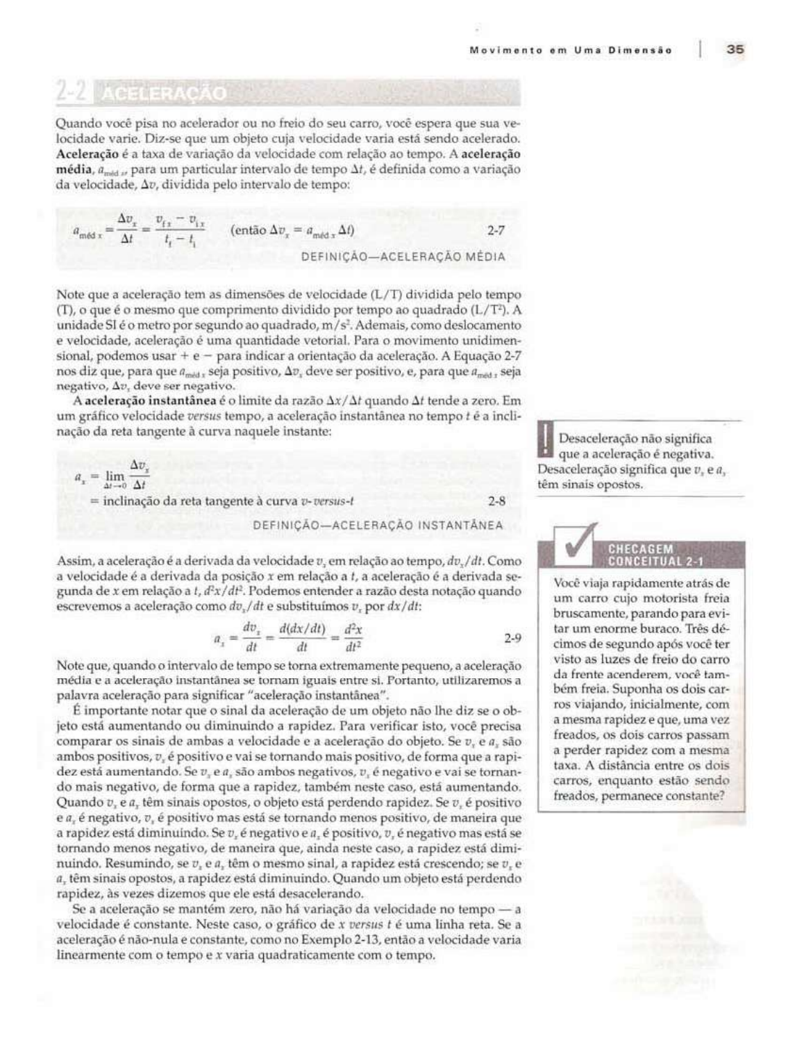 <p>em Uma 35 2-2 Quando você pisa no acelerador ou no freio do seu carro, você espera que sua ve- locidade varie. Diz-se que um objeto cuja velocidade varia está sendo acelerado. Aceleração é a taxa de variação da velocidade com relação ao tempo. A aceleração média, para um particular intervalo de tempo é definida como a variação da velocidade, dividida pelo intervalo de tempo: Av 2-7 At 4-4 Note que a aceleração tem as dimensões de velocidade (L/T) dividida pelo tempo (T), o que é o mesmo que comprimento dividido por tempo ao quadrado A unidade SI é o metro por segundo ao quadrado, Ademais, como deslocamento e velocidade, aceleração é uma quantidade vetorial. Para o movimento unidimen- sional, podemos usar + e para indicar a orientação da aceleração. A Equação 2-7 nos diz que, para que seja positivo, Av, deve ser positivo, e, para que seja negativo, Av. deve ser negativo. A aceleração instantânea é o limite da razão Ax/A quando At tende a zero. Em um gráfico velocidade versus tempo, a aceleração instantânea no tempo é a incli- nação da reta tangente à curva naquele instante: ! Desaceleração não significa que a aceleração é negativa. lim Desaceleração significa que At têm sinais opostos. = inclinação da reta tangente à curva 2-8 CHECAGEM a aceleração é a derivada da velocidade em relação ao tempo, Como CONCEITUAL 2-1 a velocidade é a derivada da posição em relação a a aceleração é a derivada se- Você viaja rapidamente atrás de gunda de x em relação a Podemos entender a razão desta notação quando um carro cujo motorista freia escrevemos a aceleração como e substituímos por dx/dt: bruscamente, parando para evi- a, di = d(dx/dt) di = tar um enorme Três dé- 2-9 cimos de segundo após você ter visto as luzes de freio do carro Note que, quando o intervalo de tempo se torna extremamente pequeno, a aceleração média e a aceleração instantânea se tornam iguais entre Portanto, utilizaremos a da frente acenderem, você tam- palavra aceleração para significar "aceleração bém Suponha os dois car- É importante notar que o sinal da aceleração de um objeto não lhe diz se o ob- ros viajando, inicialmente, com jeto está aumentando ou diminuindo a Para verificar isto, você precisa a mesma rapidez e que, uma vez comparar os sinais de ambas a velocidade e a aceleração do objeto. Se e são freados, os dois carros passam ambos positivos, v. é positivo e vai se tornando mais positivo, de forma que a rapi- a perder rapidez com a mesma A distância entre os dois dez está aumentando. Se são ambos negativos, é negativo e vai se tornan- do mais de forma que a também neste caso, está aumentando. carros, enquanto estão sendo Quando e têm sinais opostos, o objeto está perdendo Se é positivo freados, permanece constante? e a, é negativo, é positivo mas está se tornando menos positivo, de maneira que a rapidez está Se é negativo é positivo, é negativo mas está se tornando menos negativo, de maneira que, ainda neste caso, a rapidez está dimi- Resumindo, se e têm o mesmo sinal, a rapidez está se e a, têm sinais opostos, a rapidez está Quando um objeto está perdendo rapidez, às vezes dizemos que ele está Se a aceleração se mantém zero, não há variação da velocidade no tempo a velocidade é constante. Neste caso, o gráfico de persus é uma linha reta. Se a aceleração é não-nula e constante, como no Exemplo 2-13, então a velocidade varia linearmente com o tempo e x varia quadraticamente com o tempo.</p><p>36 CAPÍTULO 2 Exemplo 2-7 Um Gato Rápido Um guepardo pode acelerar de 0 a 96 km/h (60 mi/h) em 2,0 enquanto um automóvel co- mum requer 4,5 Calcule as acelerações médias do guepardo e do automóvel e compare-as com a aceleração de queda livre, = SITUAÇÃO Como nos são dadas as velocidades inicial e final, assim como a variação no tempo para ambos o felino e o podemos simplesmente usar a Equação 2-7 pra encontrar a aceleração de cada objeto. SOLUÇÃO 1. Converta 96 km/h para uma velocidade em m/s: 96 = 2. Encontre a aceleração média a partir das informações fornecidas: felino 13,3 m/s2 = = 3. Para comparar o resultado com a aceleração da gravidade, multi- felino plique cada um pelo fator de conversão automóvel 0,60g CHECAGEM Como o automóvel leva um pouco mais que duas vezes o tempo do guepardo para acelerar até a mesma velocidade, faz sentido que a aceleração do automóvel seja um pou- menor que a metade da do felino. INDO ALÉM Para reduzir erros de arredondamento, os cálculos são realizados usando-se va- lores com pelo menos algarismos, mesmo que as respostas sejam dadas usando-se apenas dois algarismos significativos. Estes algarismos extras usados nos cálculos são chamados de algarismos de guarda. PROBLEMA PRÁTICO 2-2 Um automóvel está viajando a 45 km/h no tempo - Ele acele- ra a uma taxa constante de 10 km/(h (a) Qual sua rapidez em = (b) Em que tempo o automóvel está viajando a 70 km/h? Exemplo 2-8 Velocidade e Aceleração como Funções do Tempo A posição de uma é dada é uma Encontre as dimensões do Além disso, encontre a velocidade e a aceleração como funções do tempo, SITUAÇÃO Podemos encontrar a velocidade aplicando dx/dt = (Equação 2-6) à posi- ção da onde neste caso, é igual a 3. Então, repetimos o processo para encontrar a derivada temporal da SOLUÇÃO [x] 1. As dimensões de e são Le respectivamente: 2. Encontramos a velocidade aplicando dx/dl (Equação 2-6): 3CF 3. A derivada temporal da velocidade fornece a aceleração: = CHECAGEM Podemos checar as dimensões de nossos resultados. Para a velocidade, = L/T. Para a aceleração, = PROBLEMA PRÁTICO 2-3 Se um automóvel parte do repouso em = com aceleração constante sua velocidade depende de e da distância percorrida Qual das seguin- tes equações tem a dimensão correta e, portanto, tem a possibilidade de ser uma equação que</p><p>Movimento em Uma Dimensão