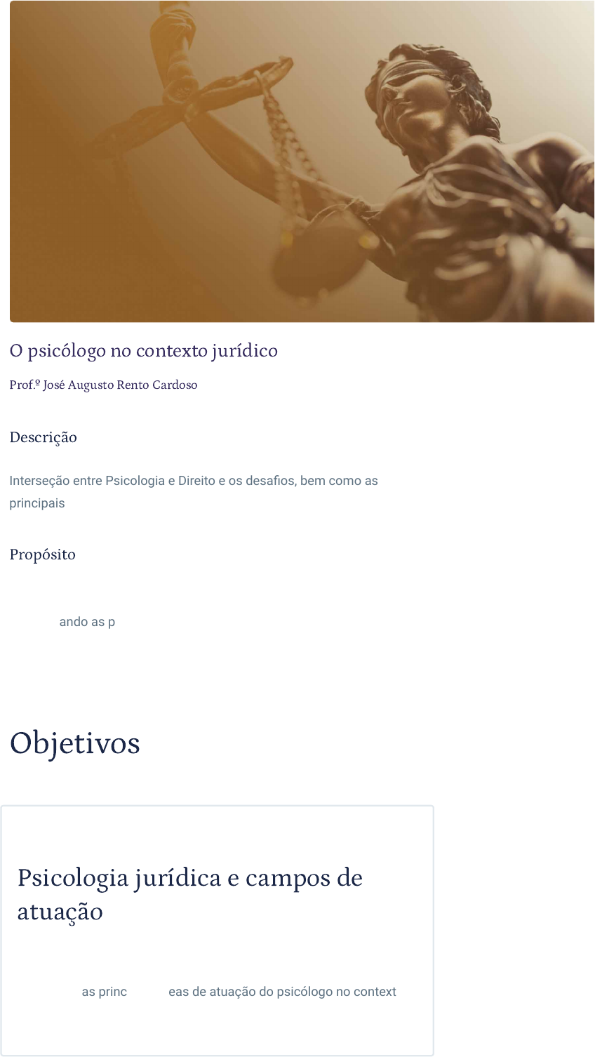 <p>O psicólogo no contexto jurídico</p><p>Prof.º José Augusto Rento Cardoso</p><p>Descrição</p><p>Interseção entre Psicologia e Direito e os desafios, bem como as</p><p>principais áreas de atuação do psicólogo no contexto jurídico.</p><p>Propósito</p><p>O aprendizado e o conhecimento da Psicologia no contexto jurídico,</p><p>apresentando as principais áreas de atuação, permitem que os futuros</p><p>profissionais consigam lidar com expectativas e desafios no cuidado de</p><p>casos específicos na prática profissional.</p><p>Objetivos</p><p>Módulo 1</p><p>Psicologia jurídica e campos de</p><p>atuação</p><p>Reconhecer as diferentes definições relativas à psicologia jurídica,</p><p>bem como as principais áreas de atuação do psicólogo no contexto</p><p>jurídico.</p><p>08/08/2024, 15:16 O psicólogo no contexto jurídico</p><p>https://stecine.azureedge.net/repositorio/00212sa/03268/index.html?brand=estacio#imprimir 1/43</p><p>Módulo 2</p><p>Psicologia e Direito: origens da</p><p>parceria</p><p>Identificar os desafios da interseção entre Psicologia e Direito.</p><p>Pode ser que você já tenha assistido a séries ou filmes em que um</p><p>personagem busca conhecer a mente e o comportamento de um</p><p>assassino, tentando descobrir quais serão seus próximos passos.</p><p>Se você é fã do gênero, deve ter uma lista enorme passando pela</p><p>sua cabeça.</p><p>Essa pode ser uma representação que muitos, inicialmente, tenham</p><p>de como atua um psicólogo no campo jurídico, ou seja, um</p><p>especialista em caçar criminosos ou assassinos em série.</p><p>No entanto, ainda que a criação de perfis de criminosos possa ser</p><p>um trabalho a que um psicólogo se dedique (mesmo que seja uma</p><p>prática polêmica e pouco desenvolvida no Brasil), o campo jurídico</p><p>apresenta uma enorme quantidade de espaços que envolvem o</p><p>estudo do comportamento e da mente humana.</p><p>A partir de agora vamos embarcar na jornada para conhecer esse</p><p>campo ainda em pleno desenvolvimento, algumas vezes chamado</p><p>de psicologia jurídica, outras de psicologia forense, mas que</p><p>sempre será permeado por estas duas disciplinas – Psicologia e</p><p>Direito –, e os desafios que nascem desse complexo encontro.</p><p>Introdução</p><p>08/08/2024, 15:16 O psicólogo no contexto jurídico</p><p>https://stecine.azureedge.net/repositorio/00212sa/03268/index.html?brand=estacio#imprimir 2/43</p><p>1 - Psicologia jurídica e campos de atuação</p><p>Ao �nal deste módulo, você será capaz de reconhecer as diferentes</p><p>de�nições relativas à psicologia jurídica, bem como as principais áreas de</p><p>atuação do psicólogo no contexto jurídico.</p><p>Conceitos básicos</p><p>De�nindo psicologia jurídica</p><p>É muito provável que em seus estudos no campo da Psicologia no</p><p>contexto jurídico você se depare com diferentes definições que podem</p><p>causar certa confusão.</p><p>Por exemplo, é comum que essa área da Psicologia seja apresentada</p><p>como psicologia forense, psicologia judiciária, psicologia na prática</p><p>jurídica e, algumas vezes, definida por apenas um dos campos de</p><p>atuação no contexto da interseção entre Psicologia e Direito, como</p><p>psicologia criminal.</p><p>Essas diferentes definições parecem delimitar um mesmo campo de</p><p>atuação, sendo certo que, de alguma maneira, podemos até considerá-</p><p>las como sinônimos. No entanto, é importante que você possa</p><p>compreender o motivo da escolha de psicologia jurídica como melhor</p><p>forma de definir a atuação do psicólogo no campo de interseção entre</p><p>Direito e Psicologia.</p><p>Conforme Jorge Trindade (2012) destaca, a psicologia</p><p>jurídica é um campo em construção.</p><p>Devemos observar que a Psicologia, entendida como ciência moderna,</p><p>tem pouco mais de cem anos, sendo uma área em pleno</p><p>08/08/2024, 15:16 O psicólogo no contexto jurídico</p><p>https://stecine.azureedge.net/repositorio/00212sa/03268/index.html?brand=estacio#imprimir 3/43</p><p>desenvolvimento, com a psicologia jurídica integrando uma subárea</p><p>dentro desse campo maior que é a Psicologia.</p><p>Trindade (2012) traz uma importante contribuição que pode nos ajudar a</p><p>melhor compreender esse campo, esclarecendo um pouco as distinções</p><p>entre psicologia jurídica e forense. O autor pontua que a palavra forense</p><p>provém do latim forensis que aponta para um espaço físico, o Fórum,</p><p>onde a assembleia romana se reunia para tratar de assuntos</p><p>importantes.</p><p>Antigo Fórum romano, em Roma, Itália.</p><p>Nesse sentido, ao utilizar o termo psicologia forense, podemos nos</p><p>encaminhar para pensar que esse campo se limita a somente aquilo que</p><p>ocorre nos Tribunais, caindo em uma pequena limitação do que seja</p><p>todo o âmbito da Psicologia em sua relação com o Direito.</p><p>No entanto, em língua inglesa, geralmente vamos encontrar o termo</p><p>Forensic Psychology, que abarca muitas das atividades e atuações que</p><p>se enquadram no nosso entendimento do que seja psicologia jurídica.</p><p>Além disso, aqui deve-se considerar as diferenças entre as legislações</p><p>dos diversos países, sendo que se a psicologia jurídica está em íntima</p><p>relação com o Direito, mudanças nas leis implicam mudanças em</p><p>algumas das atividades desse profissional.</p><p>Outra aproximação com a qual podemos ter algum</p><p>cuidado é a de Huss (2011, p. 23) que entende a</p><p>psicologia jurídica como: “a aplicação da psicologia</p><p>clínica ao Poder Judiciário”.</p><p>Aqui podemos cair em outro reducionismo. De certa forma, alguns</p><p>aspectos da psicologia clínica podem contribuir para a atuação do</p><p>psicólogo jurídico, mas existe uma gama muito maior de diferenças que,</p><p>em síntese, delimitam esse campo como uma especialidade diversa da</p><p>psicolog