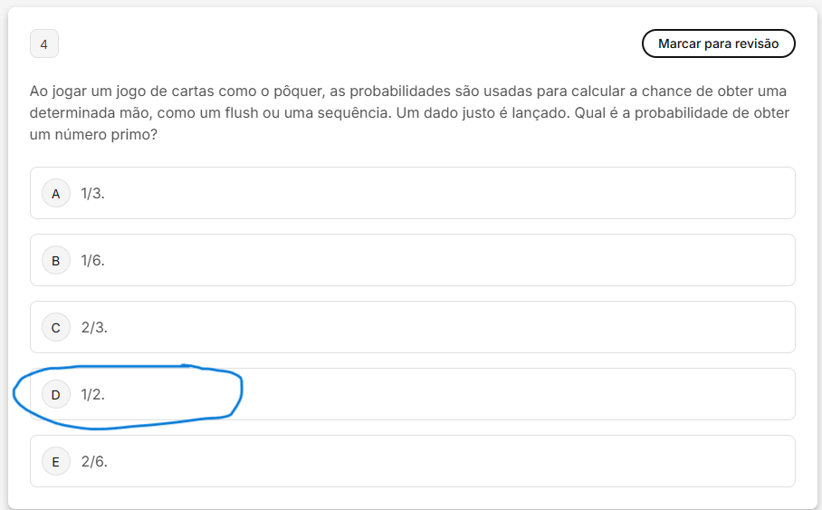 <p>4 Marcar para revisão Ao jogar um jogo de cartas como o pôquer, as probabilidades são usadas para calcular a chance de obter uma determinada mão, como um flush ou uma sequência. Um dado justo é lançado. Qual é a probabilidade de obter um número primo? A 1/3. B 1/6. C D 1/2. E 2/6.</p>