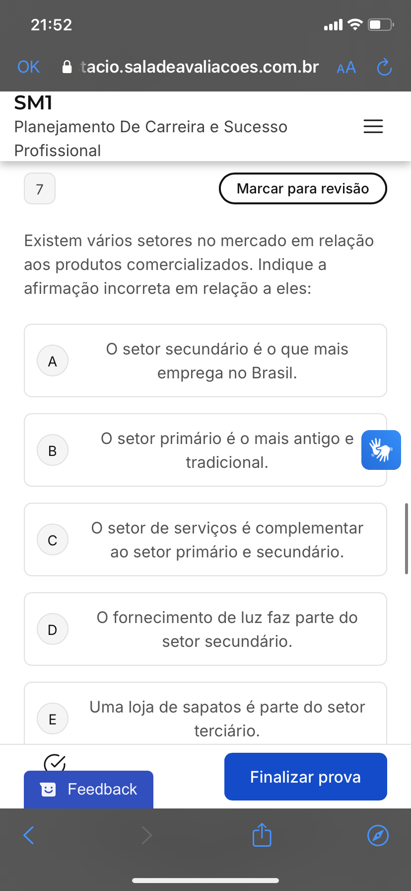 <p>21:52 OK tacio.saladeavaliacoes.com.br AA Planejamento De Carreira e Sucesso Profissional 7 Marcar para revisão Existem vários setores no mercado em relação aos produtos comercializados. Indique a afirmação incorreta em relação a eles: setor secundário é o que mais A emprega no O setor primário é o mais antigo e B tradicional. setor de serviços é complementar C ao setor primário e secundário. fornecimento de luz faz parte do D setor secundário. Uma loja de sapatos é parte do setor E terciário. Finalizar prova Feedback</p>