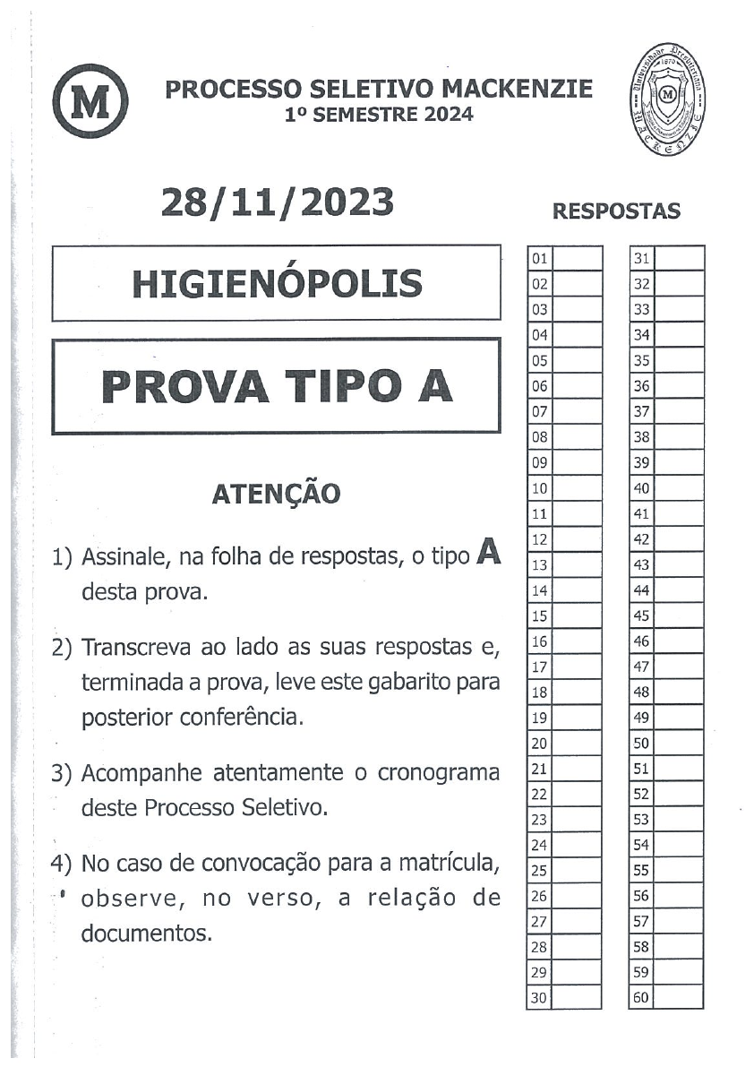 <p>PROCESSO SELETIVO MACKENZIE</p><p>jO SEMESTRE 2024</p><p>28/11/2023</p><p>. HIGIE ÓPOLIS</p><p>: 0 ATIP• Á</p><p>ATENÇÃO</p><p>1) Msinale, na folha de respostas, o tipo A</p><p>desta prova.</p><p>Transcreva ao lado as suas respostas e,</p><p>terminada a prova, leve este gabarito para</p><p>posterior conferência.</p><p>3) Acompanhe atentamente o cronograma</p><p>deste Processo Seletivo.</p><p>4) No caso de convocaçào para a matrícula,</p><p>~‘ observe, no verso, a relação de</p><p>documentos.</p><p>RESPOSTAS</p><p>o</p><p>—</p><p>?,in&~t1~</p><p>01</p><p>02</p><p>03</p><p>04</p><p>05</p><p>06</p><p>07</p><p>08</p><p>09</p><p>10</p><p>11</p><p>12</p><p>13</p><p>14</p><p>15</p><p>16</p><p>17</p><p>18</p><p>19</p><p>20</p><p>21</p><p>22</p><p>23</p><p>24</p><p>25</p><p>26</p><p>27</p><p>28</p><p>29</p><p>30</p><p>31</p><p>32</p><p>33</p><p>34</p><p>35</p><p>36</p><p>37</p><p>38</p><p>39</p><p>40</p><p>41</p><p>42</p><p>43</p><p>44</p><p>45</p><p>46</p><p>47</p><p>48</p><p>49</p><p>50</p><p>51</p><p>52</p><p>53</p><p>54</p><p>55</p><p>56</p><p>57</p><p>58</p><p>59</p><p>60</p><p>Para matrícula inicial, o candidato ou seu representante legal deverá digitalizar e anexar</p><p>obrigatoriamente, cópia dos seguintes documentos:</p><p>• Cédula de Identidade (R.G.).</p><p>• 1 (uma) foto 3x4, recente.</p><p>• C.P.F. Cadastro de Pessoa Física.</p><p>• Documento que comprove o local de residência do candidato.</p><p>• Certificado de conclusão do Ensino Médio.</p><p>• Histórico Escolar do Ensino Médio.</p><p>O não encaminhamento, nos prazos estabelecidos, de qualquer dos documentos citados</p><p>acima, enseja a não aceitação da matrícula inicial.</p><p>A Universidade Presbiteriana Mackenzie reserva-se ao direito de solicitar se entender</p><p>necessário, a seu juízo, a apresentação do documento original.</p><p>Observação: O candidato que tenha realizado estudos equivalentes ao Ensino Médio</p><p>no exterior deverá apresentar prova de equivalência de estudos fornecida por autoridade</p><p>competente.</p><p>ATENÇÃO</p><p>- Caso o candidato possua Cédula de Identidade e Certidão de Nascimento com</p><p>divergência na grafia do nome, deverá ser apresentada cópia atualizada da certidão</p><p>de nascimento.</p><p>2 - No caso de acréscimo de nome decorrente de casamento, ainda não constante</p><p>na Cédula de Identidade, deverá ser apresentada cópia da certidão de casamento</p><p>atualizada.</p><p>3 - O Certificado de Conclusão e o Histórico Escolar do Ensino Médio poderão ser</p><p>substituidos pelo Diploma de Curso Superior, devidamente registrado.</p><p>4 - Para dispensa de disciplinas cursadas em outra instituição, o candidato deverá</p><p>apresentar:</p><p>a) Histórico Escolar contendo carga horária completa e as notas de aproveitamento;</p><p>b) Conteúdo programático das disciplinas aprovadas.</p><p>Os pedidos de equivalência/dispensa de disciplinas deverão ser feitos on-line, aoós a</p><p>efetivação da matrícula, através da opção “REQUERIMENTOS/APROVEITAMENTO</p><p>DE CREDITOS”, na área destinada ao aluno (TIA.), no prazo máximo de 7(sete) dias</p><p>avós essa efetivacão. Os pedidos serão analisados rigorosamente sob os aspectos de</p><p>conteúdos programáticos e suas respectivas cargas horárias, sendo que, eventualmente,</p><p>o candidato poderá sofrer um acréscimo no tempo de integralização do curso pretendido,</p><p>a depender dos resultados obtidos.</p><p>Nome:</p><p>1 1 1 1 1 1 1—lEI</p><p>REDAÇÃO, PORTUGUÊS, INGLÊS,</p><p>FÍSICA, QUÍMICA, MATEMÁTICA,</p><p>BIOLOGIA, HISTÓRIA e GEOGRAFIA</p><p>TIPO DE PROVA: A</p><p>Instruções</p><p>• Escreva o seu nome e o seu número de inscrição neste caderno.</p><p>2. Verifique se a folha de respostas está perfeita, confira o seu número de</p><p>inscrição e assinale o tipo de prova A.</p><p>3.Verifique se a folha de redação está perfeita e confira o seu número de</p><p>inscrição.</p><p>4.Transcreva, com tinta azul ou preta, as alternativas escolhidas para a</p><p>folha de respostas, sem cometer rasuras.</p><p>5. Terminada a prova, entregue a folha de respostas, a folha de redação e</p><p>o caderno de questões ao fiscal.</p><p>6. Após o ínicio da prova, é de uma hora a permanência mínima do candidato</p><p>na sala. A duração da prova é de 4 horas, incluindo a passagem das</p><p>respostas para a folha de respostas.</p><p>28 / 11 / 2023</p><p>REDAÇÃO</p><p>A partir da leitura dos textos abaixo, redija uma dissertação com coesão e coerência,</p><p>obedecendo aos padrões da norma culta escrita.</p><p>Atenção para as orientações:</p><p>• Coloque título em seu texto.</p><p>• O tema deve ser depreendido pela leitura (verbal ou visual) de todos os textos.</p><p>• Observe os posicionamentos presentes em cada texto para elaborar sua argumentação.</p><p>Texto 1</p><p>Em seIs anos, parcela de idosos na população</p><p>aumenta e fatia de jovens diminui (96)</p><p>IPdkWçk..20fl •pa1I~.çI...a,I</p><p>IS</p><p>*5</p><p>a, *6</p><p>a,,</p><p>m</p><p>O~Swa,, D.O.13,</p><p>,—p.a,</p><p>Valor Econômico, maio de 2019</p><p>Texto II</p><p>O envelhecimento populacional está ocorrendo inclusive em países onde a</p><p>renda da população é considerada baixa ou média. Todos os países — ricos</p><p>ou pobres, industrializados ou ainda em desenvolvimento — estão vendo suas</p><p>populações envelhecer em um grau ou em outro. O crescimento populacional</p><p>entre idosos será mais rápido que em outros setores da população pelo meno’s</p><p>até 2050. O número baixo de jovens implica incertezas sobre quem irá cuidar</p><p>dos idosos no futuro e pagar benefícios como a aposentadoria.</p><p>Adaptado de www.bbc.com</p><p>Texto III</p><p>EM UM FUTURO P*ÓXIMO</p><p>65 ANOS APARTTR</p><p>EQUCROME DEAGOPA,</p><p>APOSENTA~ - só COM</p><p>95 ANOS</p><p>htt ps :/lterracoeconom ico.com .brlcha rge-apose/</p><p>p