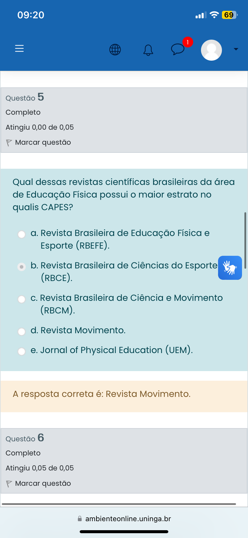 <p>09:20 69 1 Questão 5 Completo Atingiu 0,00 de 0,05 Marcar questão Qual dessas revistas científicas brasileiras da área de Educação Física possui maior estrato no qualis CAPES? a. Revista Brasileira de Educação Física e Esporte (RBEFE). b. Revista Brasileira de Ciências do Esporte (RBCE). C. Revista Brasileira de Ciência e Movimento (RBCM). d. Revista Movimento. e. Jornal of Physical Education (UEM). A resposta correta é: Revista Movimento. Questão 6 Completo Atingiu 0,05 de 0,05 Marcar questão ambienteonline.uninga.br</p>