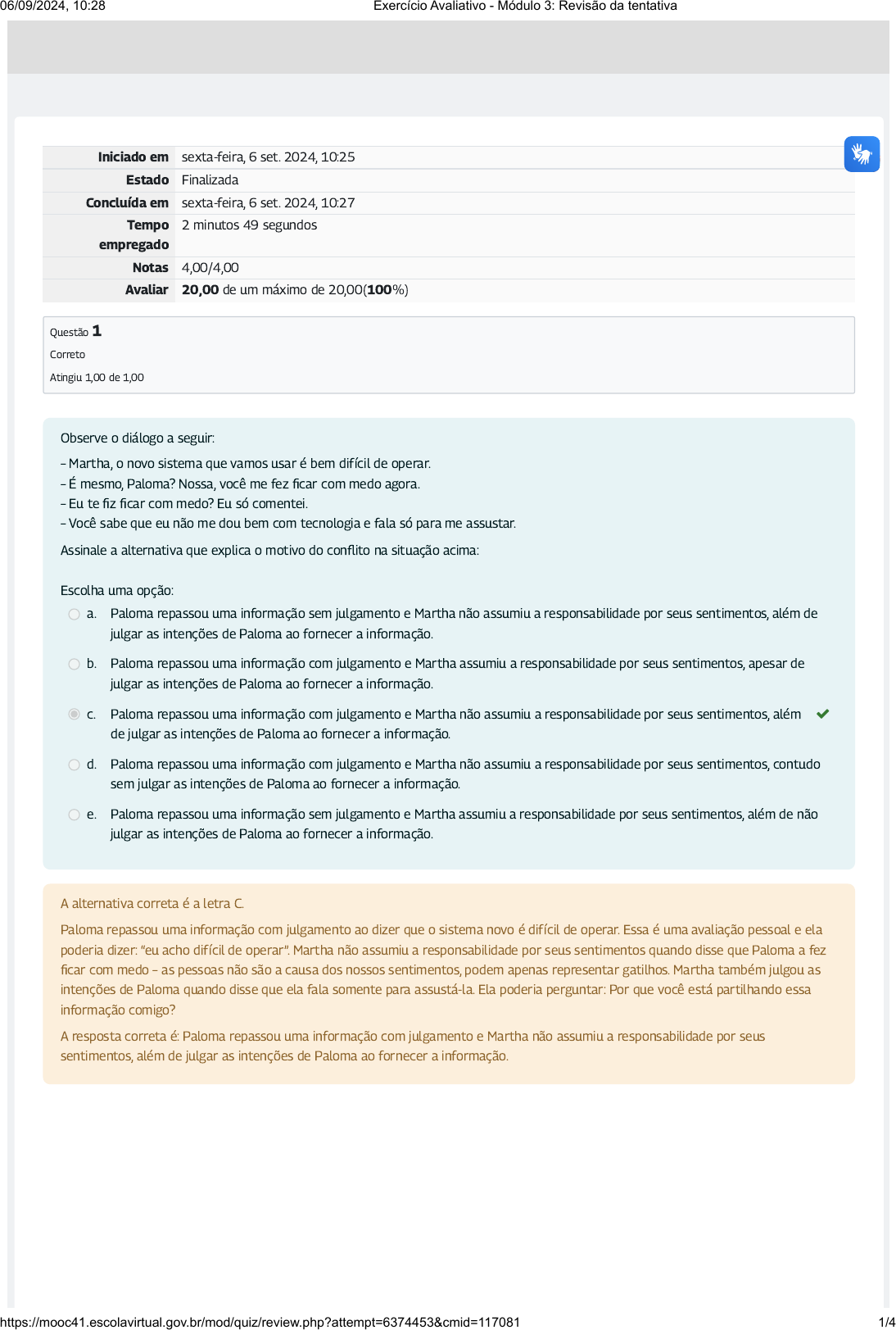 <p>Iniciado em sexta-feira, 6 set. 2024, 10:25</p><p>Estado Finalizada</p><p>Concluída em sexta-feira, 6 set. 2024, 10:27</p><p>Tempo</p><p>empregado</p><p>2 minutos 49 segundos</p><p>Notas 4,00/4,00</p><p>Avaliar 20,00 de um máximo de 20,00(100%)</p><p>Questão 1</p><p>Correto</p><p>Atingiu 1,00 de 1,00</p><p>Observe o diálogo a seguir:</p><p>– Martha, o novo sistema que vamos usar �� bem difícil de operar.</p><p>– É mesmo, Paloma? Nossa, você me fez �car com medo agora.</p><p>– Eu te �z �car com medo? Eu só comentei.</p><p>– Você sabe que eu não me dou bem com tecnologia e fala só para me assustar.</p><p>Assinale a alternativa que explica o motivo do con�ito na situação acima:</p><p>Escolha uma opção:</p><p>a. Paloma repassou uma informação sem julgamento e Martha não assumiu a responsabilidade por seus sentimentos, além de</p><p>julgar as intenções de Paloma ao fornecer a informação.</p><p>b. Paloma repassou uma informação com julgamento e Martha assumiu a responsabilidade por seus sentimentos, apesar de</p><p>julgar as intenções de Paloma ao fornecer a informação.</p><p>c. Paloma repassou uma informação com julgamento e Martha não assumiu a responsabilidade por seus sentimentos, além</p><p>de julgar as intenções de Paloma ao fornecer a informação.</p><p></p><p>d. Paloma repassou uma informação com julgamento e Martha não assumiu a responsabilidade por seus sentimentos, contudo</p><p>sem julgar as intenções de Paloma ao fornecer a informação.</p><p>e. Paloma repassou uma informação sem julgamento e Martha assumiu a responsabilidade por seus sentimentos, além de não</p><p>julgar as intenções de Paloma ao fornecer a informação.</p><p>A alternativa correta é a letra C.</p><p>Paloma repassou uma informação com julgamento ao dizer que o sistema novo é difícil de operar. Essa é uma avaliação pessoal e ela</p><p>poderia dizer: “eu acho difícil de operar”. Martha não assumiu a responsabilidade por seus sentimentos quando disse que Paloma a fez</p><p>�car com medo – as pessoas não são a causa dos nossos sentimentos, podem apenas representar gatilhos. Martha também julgou as</p><p>intenções de Paloma quando disse que ela fala somente para assustá-la. Ela poderia perguntar: Por que você está partilhando essa</p><p>informação comigo?</p><p>A resposta correta é: Paloma repassou uma informação com julgamento e Martha não assumiu a responsabilidade por seus</p><p>sentimentos, além de julgar as intenções de Paloma ao fornecer a informação.</p><p>06/09/2024, 10:28 Exercício Avaliativo - Módulo 3: Revisão da tentativa</p><p>https://mooc41.escolavirtual.gov.br/mod/quiz/review.php?attempt=6374453&cmid=117081 1/4</p><p>Questão 2</p><p>Correto</p><p>Atingiu 1,00 de 1,00</p><p>Observe o diálogo a seguir:</p><p>– Martha, o novo sistema que vamos usar é bem difícil de operar.</p><p>– É mesmo, Paloma? Nossa, você me fez �car com medo agora.</p><p>– Eu te �z �car com medo? Eu só comentei.</p><p>– Você sabe que eu não me dou bem com tecnologia e fala só para me assustar.</p><p>Assinale a alternativa em que Paloma e Martha se responsabilizam por suas opiniões e sentimentos:</p><p>Escolha uma opção:</p><p>a. – Martha, eu acho que o novo sistema que vamos usar é bem difícil de operar.</p><p>– É mesmo, Paloma? Nossa, eu �quei com medo agora.</p><p>– Você gostaria de falar sobre isso?</p><p>Eu não me dou bem com tecnologia e �co com medo de não conseguir usar.</p><p></p><p>b. – Martha, eu acho que o novo sistema que vamos usar é bem difícil de operar.</p><p>– É mesmo, Paloma? Nossa, você me fez �car com medo agora.</p><p>– Eu te �z �car com medo? Desculpe.</p><p>– Você sabe que eu não me dou bem com tecnologia e fala só para me assustar.</p><p>c. – Martha, o novo sistema que vamos usar é bem difícil de operar.</p><p>– É mesmo, Paloma? Nossa, eu �quei com medo agora.</p><p>– Eu te �z �car com medo, por quê?</p><p>– Eu �quei com medo porque não me dou bem com tecnologia e você fala só para me assustar.</p><p>d. – Martha, o novo sistema que vamos usar é bem difícil de operar.</p><p>– É mesmo, Paloma? Nossa, você me fez �car com medo agora.</p><p>– Você gostaria de falar sobre isso?</p><p>– Você sabe que eu não me dou bem com tecnologia e fala só para me assustar.</p><p>e. – Martha, eu acho que o novo sistema que vamos usar é bem difícil de operar.</p><p>– É mesmo, Paloma? Nossa, eu �quei com medo agora.</p><p>– Você gostaria de falar sobre isso?</p><p>– Você sabe que eu não me dou bem com tecnologia e fala só para me assustar.</p><p>A alternativa correta é a letra A.</p><p>Quando Paloma diz que acha que o sistema é difícil, ela deixa explícito que se trata de um julgamento pessoal – e não de uma</p><p>realidade. Quando Martha diz que �cou com medo, e não que Paloma a fez �car com medo, está assumindo a responsabilidade por seus</p><p>sentimentos. Quando ela também diz que �cou com medo porque não se dá bem com tecnologia e receia não conseguir usá-la, está</p><p>expressando seus sentimentos.</p><p>A resposta correta é: – Martha, eu acho que o novo sistema que vamos usar é bem difícil de operar.</p><p>– É mesmo, Paloma? Nossa, eu �quei com medo agora.</p><p>– Você gostaria de falar sobre isso?</p><p>Eu não me dou bem com tecnologia e �co com medo de não conseguir usar.</p><p>06/09/2024, 10:28 Exercício Avaliativo - Módulo 3: Revisão da tentativa</p><p>https://mooc41.escolavirtual.gov.br/mod/quiz/review.php?attempt=6374453&cmid=117081 2/4</p><p>Questão 3</p><p>Correto</p><p>Atingiu 1,00 de 1,00</p><p>Questão 4</p><p>Correto</p><p>Atingiu 1,00 de 1,00</p><p>Assinale a alternativa que apresenta uma palavra que representa um julgamento e que, frequentemente, é usada para descrever um</p><p>sentimento:</p><p>Escolha uma opção:</p><p>a. Eu me senti frus