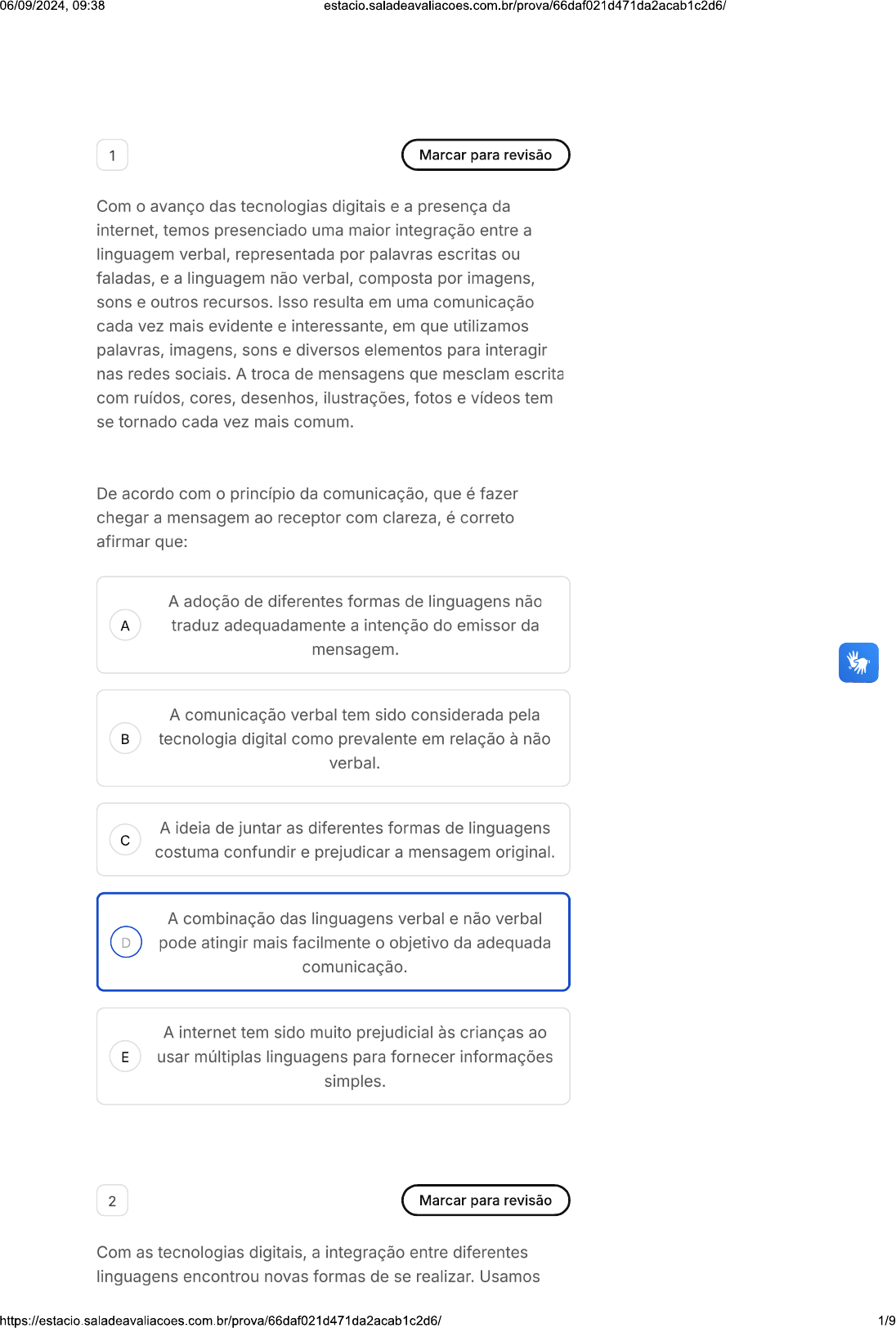 <p>06/09/2024, 09:38 1 Marcar para revisão Com o avanço das tecnologias digitais e a presença da internet, temos presenciado uma maior integração entre a linguagem verbal, representada por palavras escritas ou faladas, e a linguagem não verbal, composta por imagens, sons e outros recursos. Isso resulta em uma comunicação cada vez mais evidente e interessante, em que utilizamos palavras, imagens, sons e diversos elementos para interagir nas redes sociais. A troca de mensagens que mesclam escrita com ruídos, cores, desenhos, ilustrações, fotos e vídeos tem se tornado cada vez mais comum. De acordo com o princípio da comunicação, que é fazer chegar a mensagem ao receptor com clareza, é correto afirmar que: A adoção de diferentes formas de linguagens não A traduz adequadamente a intenção do emissor da mensagem. A comunicação verbal tem sido considerada pela B tecnologia digital como prevalente em relação à não verbal. A ideia de juntar as diferentes formas de linguagens C costuma confundir e prejudicar a mensagem original. A combinação das linguagens verbal e não verbal D pode atingir mais facilmente o objetivo da adequada comunicação. A internet tem sido muito prejudicial às crianças ao E usar múltiplas linguagens para fornecer informações simples. 2 Marcar para revisão Com as tecnologias digitais, a integração entre diferentes linguagens encontrou novas formas de se realizar. Usamos 1/9</p><p>06/09/2024, 09:38 tanto palavras como imagens, sons e outros recursos para interagir nas redes sociais. É cada vez mais comum trocarmos mensagens em que a escrita se mistura com emojis ou emoticons. Uma aula a distância também é exemplo da integração entre diferentes tipos de linguagem, articulando texto escrito com vídeo, podcast, imagens e símbolos. Tudo isso é possível por causa de outra integração: a convergência entre diferentes mídias, formando o que tem sido chamado de hipermídia. É como se o livro impresso, o rádio, a televisão e o computador estivessem todos reunidos com suas diferentes linguagens. Considerando o texto acima, avalie as asserções a seguir e a relação proposta entre elas. - - A chamada linguagem hipermidiática manifesta novas formas de integração entre diferentes linguagens. PORQUE Il - As tecnologias digitais proporcionam a convergência entre diversas mídias e a interação por meio de mensagens que mesclam escrita, sons, imagens e outros recursos. A respeito dessas asserções, assinale a resposta correta. A asserção I é uma proposição falsa, e a é uma A proposição verdadeira. As asserções e são proposições verdadeiras, mas B a não é uma justificativa correta da I. A asserção é uma proposição verdadeira, e a é C uma proposição falsa. D As asserções e são proposições falsas. As asserções e são proposições verdadeiras, e a E é uma justificativa correta da I. 3 Marcar para revisão 2/9</p><p>06/09/2024, 09:38 Disponível em: https://www.tudodesenhos.com/d/solidao. Acesso em: 29 maio. 2023. Na imagem apresentada o significado da linguagem não verbal consegue transmitir uma ideia, ou seja, houve comunicação com o leitor. Assinale a afirmativa correta acerca da mensagem que a imagem transmite. A Dificuldade de conexão estando em isolamento. Que as pessoas são insensíveis e não falam a mesma B língua. C isolamento relacionado ao gênero. Todos são de uma nacionalidade, exceto uma delas, D portanto, sem comunicação. E A empatia mostrada em sociedade. 4 Marcar para revisão "Minha barriga ta fazendo: Zum, zum, zum, zum Da vontade que eu tenho de comer JERIMUM Ninguém aguenta com tamanha carestia Os preços sobem todo dia não se pode mais viver Há muita gente que faz tanta economia Estão querendo ver se um dia Se acostumam sem comer [...]" (CARREIRO, Tião e PARDINHO. Jerimum. Disponível em: Acesso em 27 jul 2015) Tomando como base o termo jerimum destacado na letra da música podemos afirmar que ele é um exemplo de variação linguística: A Diastrática. B Registro. C Regional. 3/9</p><p>06/09/2024, 09:38 D Social. E Diafásica. 5 Marcar para revisão (FCC - 2013 / Adaptada) Dominar a norma culta da língua portuguesa está se tornando cada vez mais importante para o sucesso de profissionais de todas as áreas. No passado, quando diretores, superintendentes e gerentes podiam contar com uma secretária, a falta de domínio da língua portuguesa não era tão notada, afinal, quem precisava escrever corretamente era ela. Hoje isso mudou. Com as empresas cada vez mais "enxutas", muitas vezes os executivos ou não possuem ou precisam dividir a mesma assistente. Assim, obrigatoriamente tiveram que começar a escrever relatórios, preparar documentos e enviar e-mails. (Adaptado de: Cláudia Madaleno. Importância da língua portuguesa para a carreira. Disponível em: www.jornaldaeducacao.inf.br Acessado em: 19/12/2007) A falta de domínio da norma culta em língua portuguesa. Revela que os jovens não veem relação entre o uso A correto da língua portuguesa e a vida prática. Cria uma imagem negativa do profissional que expõe B a perigo o mérito de seu trabalho na empresa. Se traduz em uma má comunicação escrita, mas bem C recebida pelo público interno das organizações. É a causa da dispensa de secretárias em empresas D cada vez mais "enxutas". Evidencia os mecanismos de interferência que E ajudam a compreender melhor os textos escritos. 6 Marcar para revisão (CFF / 2017 - Adaptada) Analise o texto abaixo e marque a alternativa correta quanto ao uso da norma culta 4/9</p><p>06/09/2024, 09:38 A Câmara Municipal de Curitiba se vê às voltas com denúncias contra vereadores que estariam embolsando parte dos salários de seus assessores: são pelo menos quatro parlamentares às voltas com investigações internas da Câmara ou inquéritos do Ministério Público. Independentemente da veracidade das denúncias específicas, a ocasião serve como um alerta para um