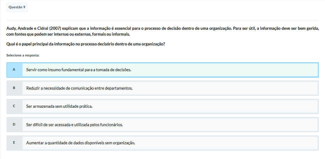 <p>Questão 9 Audy, Andrade e Cidral (2007) explicam que a informação é essencial para o processo de decisão dentro de uma organização. Para ser útil, a informação deve ser bem gerida, com fontes que podem ser internas ou externas, formais ou informais. Qual é o papel principal da informação no processo decisório dentro de uma organização? Selecione a resposta: A Servir como insumo fundamental para a tomada de decisões. B Reduzir a necessidade de comunicação entre departamentos. Ser armazenada sem utilidade prática. D Ser difícil de ser acessada e utilizada pelos funcionários. E Aumentar a quantidade de dados disponíveis sem organização.</p>
