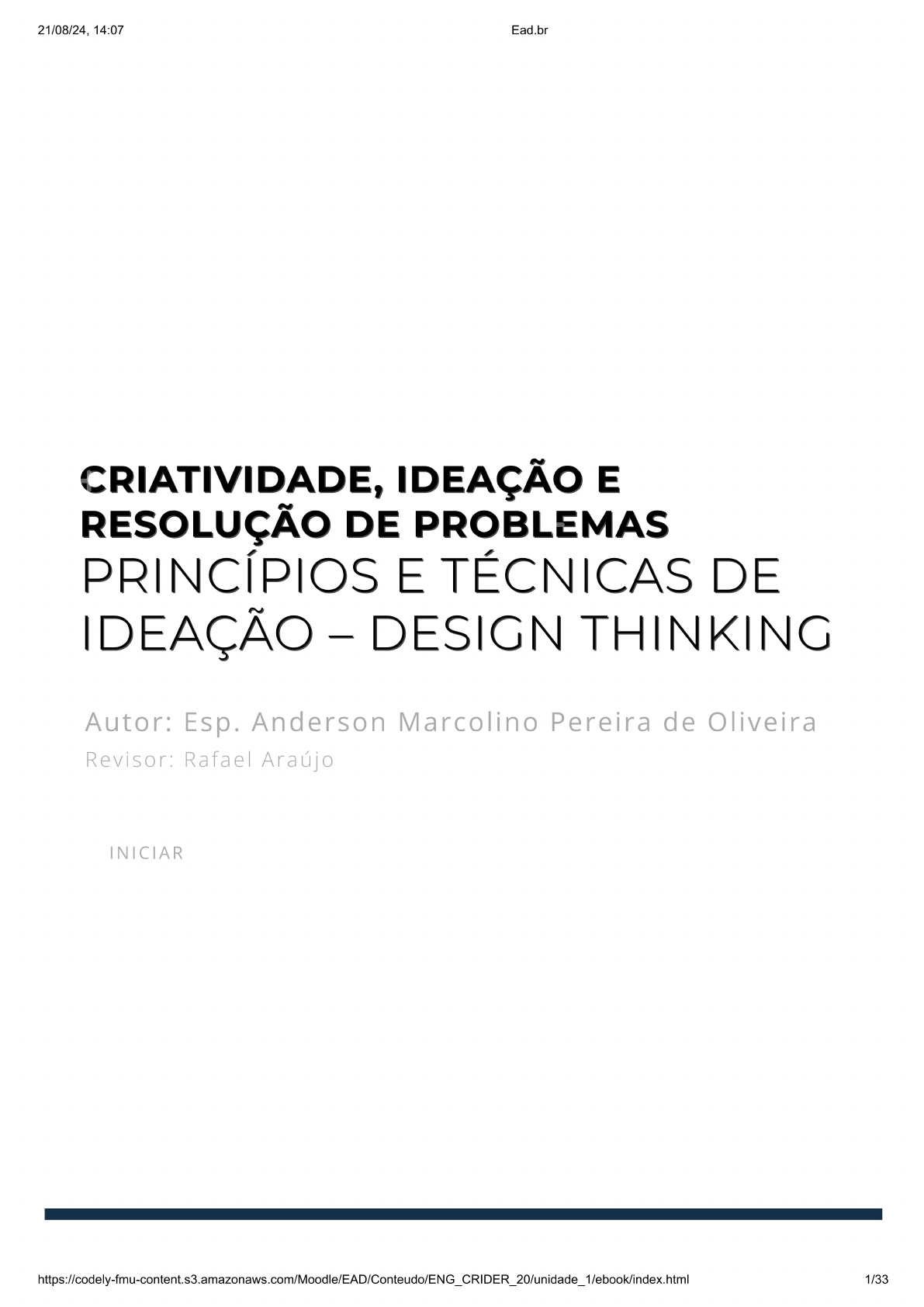 <p>21/08/24, 14:07 Ead.br CRIATIVIDADE, IDEAÇÃO E RESOLUÇÃO DE PROBLEMAS PRINCÍPIOS E TÉCNICAS DE IDEAÇÃO - DESIGN THINKING Autor: Esp. Anderson Marcolino Pereira de Oliveira Revisor: Rafael Araújo INICIAR 1/33</p><p>21/08/24, 14:07 Ead.br introdução Introdução Caro(a) estudante, iniciaremos aqui uma jornada de imersão sobre a criatividade, como desenvolver ideias e reconstruir princípios, sob a perspectiva de um modelo de pensamento que se propõe, de maneira estruturada, apontar um caminho para a construção de soluções para os desafios da vida moderna, de forma criativa, inovadora e sob o olhar de vários ângulos. No capítulo que estamos iniciando, exploraremos uma técnica de construção de ideias que está totalmente alinhada com os princípios de atendimento ao consumidor 4.0: o design thinking. Durante a exploração do conteúdo, iremos abordar sua utilização e suas ferramentas, que nos propiciam a desenvolver a construção sólida da criatividade nos profissionais. O objetivo geral desta unidade é nos aproximarmos desse conceito que nos auxilia no desenvolvimento da criatividade e da capacidade de propor soluções inovadoras para a realidade que é apresentada pelo mercado 4.0. Ao longo dessa jornada, apresentaremos como surgiu a ideia do design thinking e como essa metodologia nos auxilia na construção de novos modelos mentais de produção de ideias e soluções. Vamos pensar "fora da caixinha"? 2/33</p><p>21/08/24, 14:07 Ead.br Princípios e Técnicas de Ideação - Design Thinking O mercado globalizado atual oferece desafios, nos quais as ferramentas desenvolvidas nas primeiras revoluções industriais, com produções estáticas e sem o envolvimento do cliente, já não suprem a necessidade do consumidor 5.0. A velocidade da mudança de paradigmas é muito alta, fazendo com que as técnicas de aprendizado utilizadas no início das eras industriais já não atendam mais às nossas necessidades. Com isso, precisamos, nas palavras de Toffler (1973), "aprender, desaprender e reaprender", sem o que não conseguiremos nos conectar com o nível de competitividade exigido em nível global. Assim, o desenvolvimento de competências e habilidades ligadas às tendências tecnológicas e os problemas e oportunidades que elas nos proporcionam abordam uma característica inerente ao comportamento humano - a criatividade. Já o pensamento de Edgar Morin (2001), em sua teoria da complexidade, afirma que devemos pensar global e agir local, pois, ao mesmo tempo que precisamos desenvolver estratégias que nos levem a massificar a produção para reduzir os custos globais dos produtos e serviços, também necessitamos 3/33</p><p>21/08/24, 14:07 Ead.br resolver problemas pontuais da sociedade em que vivemos, e para se destacar no mercado, ainda temos de desenvolver a capacidade de se ajustar às necessidades do cliente, customizando os resultados quando assim for necessário. Na realidade, principal problema do mercado se resume em duas partes: consumidor está mais exigente. Ele não mais consome um produto que lhe é "empurrado" pelo sistema produtivo. Em contrapartida, as empresas ainda não conseguiram compreender com clareza as demandas do mercado. Ou seja: nunca sabemos o que cliente quer de verdade. Muitas vezes, criamos soluções que atendem às necessidades de um nicho de clientes, porém não projetamos os reflexos que produziremos nos âmbitos sociais, ambientais e, principalmente, econômicos, atuais e futuros para a empresa. Em resumo, como as companhias precisam de resultados imediatos, nós simplesmente entregamos e cumprimos nossas metas! Podemos observar essa realidade quando visitamos uma loja de varejo: uma infinidade de marcas e modelos, em que podemos observar que quase não existe diferença entre os produtos! Por exemplo, que difere um celular da marca A para a marca B? Software? Hardware? Aparência? Robustez? Status? Preço? Qual critério para a SUA decisão de compra? O fato é que o modelo de produção vigente ainda está estagnado nesse mesmo jeito há anos! Todos os celulares possuem características (inclusive as peças internas!) semelhantes, e nós nos deixamos levar por critérios aleatórios para definir nossa tomada de decisão, como recomendações de amigos, vendedores... até de consumidores na internet! 4/33</p><p>21/08/24, 14:07 Ead.br reflita Reflita Como está seu padrão de consumo atual? Quais fatores O levam a tomar a decisão de compra? O que se observa de tudo o que foi exposto é que os métodos de desenvolvimento de produtos e serviços que atualmente estão apresentados já não conseguem oferecer soluções viáveis para os problemas dos consumidores, ou seja, com isso estamos apenas estimulando o consumo desenfreado e simplesmente descartando aquilo que já não atende mais nossas expectativas, muitas vezes literalmente jogando no lixo aquilo que ainda deveria suprir as nossas necessidades. Daí surgem problemáticas que afetam a cabeça dos principais gestores no mercado: em um mundo com cada vez mais anseio por consumo, contrastando com a disponibilidade cada vez menor de recursos, como solucionar essa equação? Como desenvolver novas abordagens para que possamos realinhar a expectativa versus realidade sobre as nossas necessidades? Como as empresas e as pessoas podem contribuir para construir soluções para esses problemas? Diante do exposto, o design thinking apresenta-se como uma ferramenta de promoção de ideias e soluções para os problemas que apresentamos aqui. Vamos conhecer um pouco mais sobre essa ferramenta a seguir! História do Design Thinking 5/33</p><p>21/08/24, 14:07 Ead.br A história do uso da expressão design thinking começa, segundo Alt e Pinheiro (2011), em 1992, no artigo "Wicked problems in design thinking", do professor Richard Buchanan, da Universidade de Carnegie Mellon, EUA. Nele, autor defendeu que o design deveria ser aplicado em outras áreas, e, com isso, esse não ficaria l