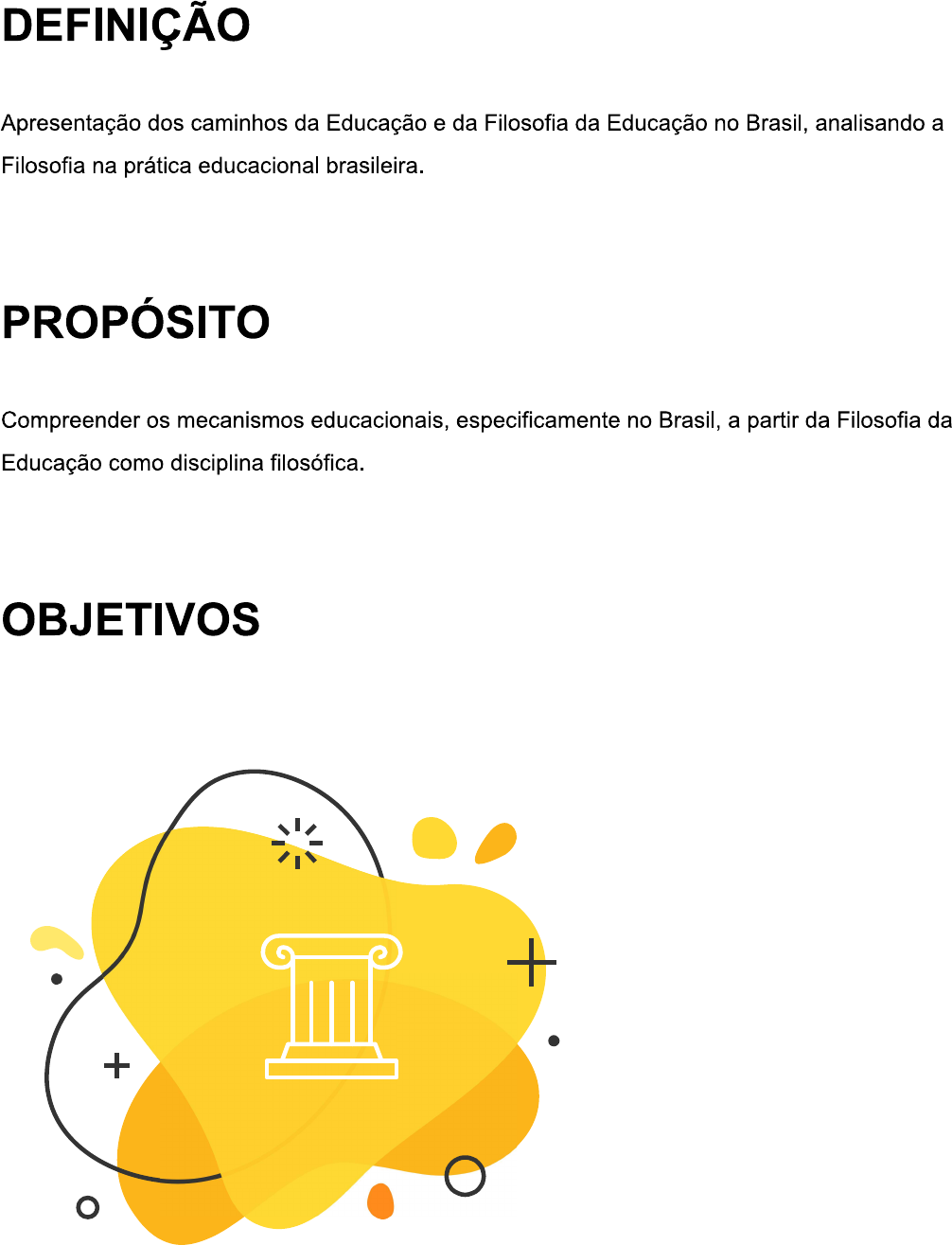 <p>DEFINIÇÃO Apresentação dos caminhos da Educação e da Filosofia da Educação no Brasil, analisando a Filosofia na prática educacional brasileira. PROPÓSITO Compreender os mecanismos educacionais, especificamente no Brasil, a partir da Filosofia da Educação como disciplina filosófica. OBJETIVOS +</p><p>MÓDULO 1 Identificar a relação histórica entre a Educação e a Filosofia + MÓDULO 2 Descrever a história da Filosofia da Educação no Brasil</p><p>+ MÓDULO 3 Identificar alguns dos possíveis papéis da Filosofia na prática educacional INTRODUÇÃO No Prefácio da primeira edição de sua História da Filosofia, Nicola Abbagnano aponta duas características importantes da Filosofia, que servirão como base para o desenvolvimento deste tema:</p><p>+ A convicção de A essencial que nada do que humanidade é humano é dos filósofos alheio à Filosofia + Como complementação de seu pensamento, ele afirma que a Filosofia é o próprio homem, "que em si mesmo se faz problema e busca as razões e o fundamento do ser que é o seu". Ao considerar que toda Pedagogia se desenvolve a partir de uma concepção humana, fica fácil compreender as relações entre Filosofia e Educação. É sobre isso que falaremos neste tema. NICOLA ABBAGNANO Nicola Abbagnano (1901-1990) foi um filósofo existencialista italiano, que procurou encontrar um princípio metafísico a partir do qual todas as outras realidades fossem garantidas, sem que, contudo, fossem reduzidas a puro racionalismo ou irracionalismo, realismo ou idealismo. O princípio por ele encontrado foi o conceito de existência. Fonte: Infopédia.</p><p>+ MÓDULO 1 Identificar a relação histórica entre a Educação e a Filosofia A FILOSOFIA E A EDUCAÇÃO: CAMINHANDO NA HISTÓRIA DO OCIDENTE Como todo bom pensamento, precisamos definir claramente alguns pressupostos.</p><p>T conhecimento passou a ser classificado na formulação do pensamento estruturalista no século XVIII. Antes eles se integravam e, por isso, é difícil separá-los. A tradição dos cursos de formação de professores não estuda Filosofia da Educação, mas História da Filosofia da Educação. Não pretendemos adotar esse caminho.</p><p>A sociedade ocidental é uma invenção. Ela, ao ser inventada - não é uma invenção pessoal, mas um discurso formulado e repetido pela sociedade que passa a ser naturalizado como uma verdade - defende seu passado e "pinça" o que lhe interessa em uma história não linear e baseada em herança. Diante desses pressupostos, é importante ressaltar que não nos limitaremos ao tempo, mas vamos mostrar alguns dos elementos que a contemporaneidade buscou e chamou de Filosofia da Educação. Qual a origem da Filosofia? A Filosofia teve origem na Grécia, no século VI a.C., época em que tudo era explicado pela mitologia. Tratava-se de uma interpretação da realidade "divino-mitológica", também chamada de Cosmogonia. A grande mudança ocorreu quando os gregos passaram a explicar a realidade mediante o uso da razão e da lógica, dando lugar à Cosmologia. A Filosofia grega perdurou até o declínio do Império Romano. Os primeiros filósofos, os pré-socráticos, isto é, anteriores a Sócrates, buscavam a origem do Universo e, claro, das coisas. Em geral, eram monistas, uma vez que acreditavam ser o Universo criado a partir de um único elemento. Tales de Mileto (624-548 a.C.), por exemplo, considerado o primeiro filósofo, acreditava que o Universo teve como primeiro elemento a água. Contudo, Sócrates, Platão e Aristóteles são considerados, por muitos, os fundadores da Filosofia</p><p>ocidental. Suas obras avançaram no tempo e perpassaram as filosofias das Idades Média, Moderna e Contemporânea. Interessa, aqui, fazer menção a Platão, que fundou a Academia Ateniense, tida como a primeira instituição de ensino do Ocidente, seguindo os preceitos do método dialético de Sócrates. Segundo historiadores, Platão teria sido aluno de Heráclito (540-470 a.C.) e de Sócrates. Uma introdução a seu pensamento filosófico é encontrada no Crátilo. + Como Platão percebe a humanidade? Para Platão, a humanidade estava imersa, simultaneamente, em duas realidades, que é a base de toda a sua teoria:</p><p>REALIDADE INTELIGÍVEL Em que o ser humano reflete sobre aquilo que se pode distinguir e expressar (realidade imutável das coisas).</p><p>+</p><p>REALIDADE SENSÍVEL É a que afeta os nossos sentidos.</p><p>Como Platão percebe a Educação? Com relação à Educação, Platão acreditava nos métodos de debate e conversação. Ambos levariam ao conhecimento. Para ele, os próprios alunos deveriam descobrir as coisas. Estava claro que a Educação seria uma forma de desenvolver o homem moral e, assim, o filósofo se esforçou para promover o desenvolvimento intelectual e físico de seus alunos. Aulas de retórica, debates, educação musical, Geometria, Astronomia e educação militar faziam parte das discussões mantidas no momento de ensinar. que significa educar para você? Para Aristóteles, o princípio da aprendizagem era a imitação. E tinha na família o núcleo da organização das cidades e o primeiro passo na educação das crianças. Porém, governantes e legisladores tinham o dever de regular e vigiar o crescimento das crianças quanto à saúde e às obrigações cívicas. Nesse sentido, o Estado se responsabilizaria pela Educação. CONCLUINDO A Filosofia teve origem na Grécia Antiga. Um dos principais filósofos da época foi Platão, que percebia o homem em duas realidades: inteligível e sensível. Nesse contexto, a Educação deveria usar métodos de debate e conversação, permitindo que o aluno alcance o conhecimento por meio de descobertas.</p><p>Como era a Educação na Idade Média? É importante ressaltar que existiram autores romanos, do início da Igreja medieval, e filósofos diversos sobre os quais teríamos que falar se voltássemos a linha temporal. Mas, como estamos compondo uma 