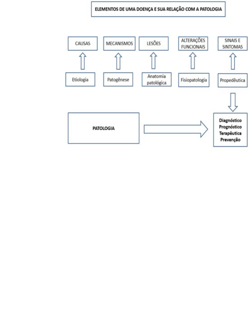 <p>Introdução aos processos gerais da patologia</p><p>PATOLOGIA → é uma ciência que estuda a causa e os mecanismos que produzem as doenças, considerando principalmente os aspectos alterações estruturais, bioquímicas e funcionais nas células, tecidos e órgãos que fundamentam doença.</p><p>Etiologia → estudo da origem da doença</p><p>Fatores etiológicos: genéticos (p. ex., mutações herdadas e doenças associadas com variantes genéticas, ou polimorfismo)</p><p>Fatores adquiridos: ex., infecciosos, nutricionais, químicos, físicos).</p><p>Patogenia → refere-se à sequência de eventos na resposta das células ou tecidos ao agente etiológico, desde o estímulo inicial à expressão final da doença. Ou seja, o estudo dos mecanismos que provocam as doenças.</p><p>Anatomia patologia → Alterações Moleculares e Morfológicas dos tecidos diante de uma doença.</p><p>Fisiopatologia → Perturbações Funcionais e Manifestações Clínicas. São as alterações funcionais de sistemas e órgãos afetados por uma doença.</p><p>Sinais → indício ou vestígios, manifestações clínicas visíveis e perceptíveis.</p><p>Sintomas → são manifestações subjetivas percebidas pelo paciente e relatadas.</p><p>Tratamento → Terapia ou terapêutica para uma determinada doença.</p><p>Prognostico → previsão baseada em fatos ou dados reais e atuais, que pode indicar o provável estágio futuro de um processo.</p><p>image1.png</p>