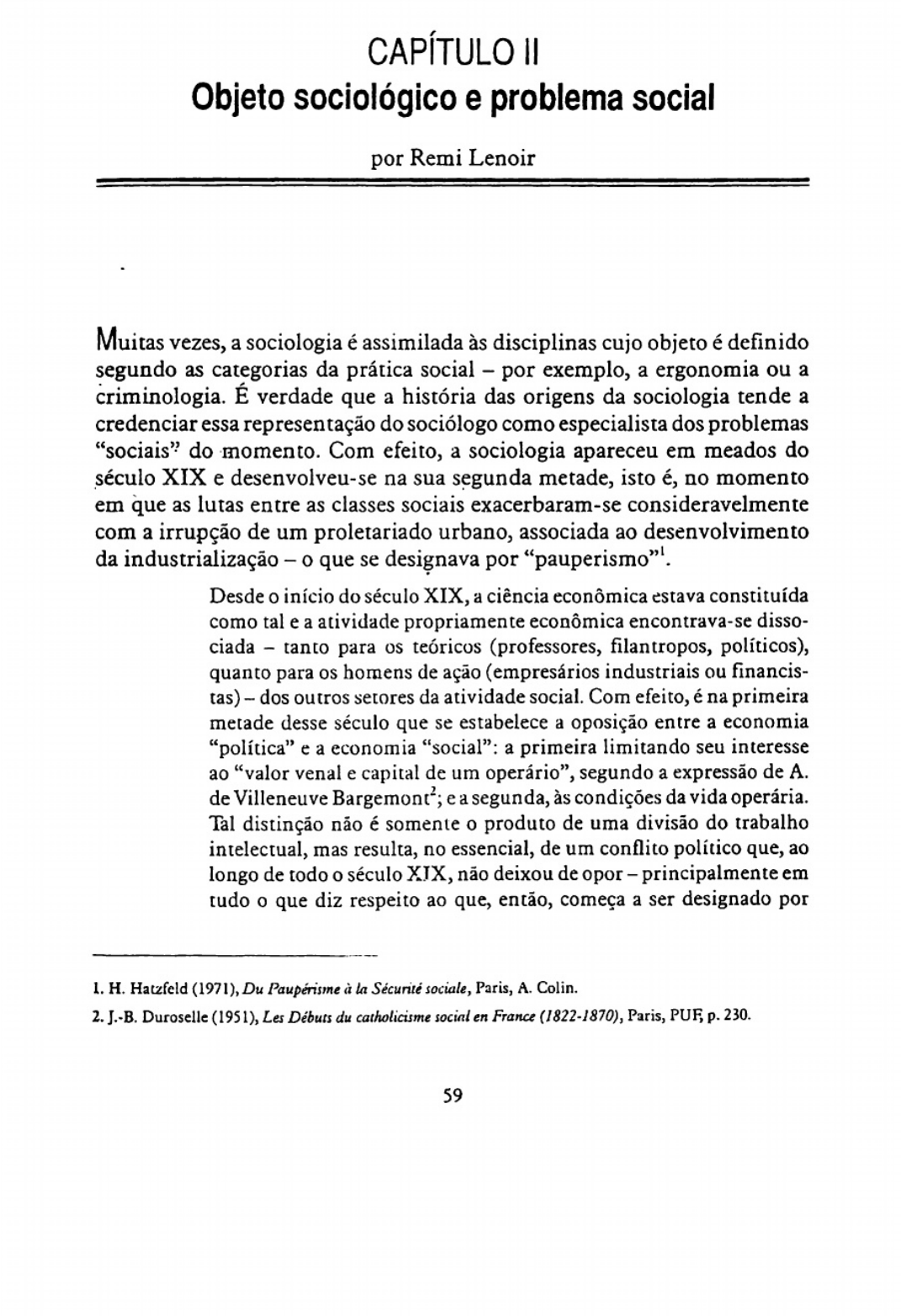 <p>CAPÍTULO Objeto sociológico e problema social por Remi Lenoir Muitas vezes, a sociologia é assimilada às disciplinas cujo objeto é definido segundo as categorias da prática social por exemplo, a ergonomia ou a criminologia. É verdade que a história das origens da sociologia tende a credenciar essa representação do sociólogo como especialista dos problemas "sociais" do momento. Com efeito, a sociologia apareceu em meados do século XIX e desenvolveu-se na sua segunda metade, isto é, no momento em que as lutas entre as classes sociais exacerbaram-se consideravelmente com a irrupção de um proletariado urbano, associada ao desenvolvimento da industrialização - o que se designava por Desde o início do século XIX, a ciência econômica estava constituída como tal e a atividade propriamente econômica encontrava-se disso- ciada - tanto para os teóricos (professores, filantropos, políticos), quanto para os homens de ação (empresários industriais ou financis- tas) dos outros setores da atividade social. Com efeito, é na primeira metade desse século que se estabelece a oposição entre a economia "política" e a economia "social": a primeira limitando seu interesse ao "valor venal e capital de um operário", segundo a expressão de A. de Villeneuve e a segunda, às condições da vida operária. Tal distinção não é somente o produto de uma divisão do trabalho intelectual, mas resulta, no essencial, de um conflito político que, ao longo de todo o século XIX, não deixou de opor principalmente em tudo o que diz respeito ao que, então, começa a ser designado por 1. H. Hatzfeld (1971), Du Paupérisme à la Sécurité sociale, Paris, A. Colin. 2. J.-B. Duroselle (1951), Les Débuts du catholicisme social en France (1822-1870), Paris, PUF, p. 230. 59</p><p>"problemas sociais" os representantes da burguesia industrial aos da aristocracia conservadora. Ao denunciar os efeitos da indus- trialização, as frações mais conservadoras da aristocracia contestavam a legitimidade dessa "nova feudalidade", baseada na produção de bens manufaturados e que, nesse momento, estava conseguindo ter acesso ao poder político. Essa dissociação da vida social em dois setores e a autonomização conceitual e teórica (como, aliás, é testemunhado pelo rápido desen- volvimento da filosofia utilitarista na França e do que será designado por "gestão das é, sem dúvida, um dos fatores que facilitou a emergência da sociologia como disciplina distinta de outras ciências sociais, em particular, da economia. Na maior parte das teorias sociológicas dessa época, encontramos o eco de tal divisão, simultaneamente, política e intelectual, sob a forma de pares de oposição entre dois tipos de sociedade ("comunidade/socie- dade", sociedade com estatuto/sem estatuto, etc.). Alguns sociólogos tão diferentes entre si como Ferdinand Tönnies, Georg Simmel, Max Weber, etc. tiveram consciência do que Émile Durkheim designava por "abalo" das sociedades européias no século XIX e tomaram isso como objeto, mais ou menos direto, de seus trabalhos. Em particular, a maior parte das obras de Durkheim visam servir de remédio à crise social que grassava sob seus olhos, como é confirmado pelo exemplo do último capítulo de um de seus livros mais conhecidos, Le Suicide (1897), com um título bastante explícito ("Con- práticas"), ou a distinção entre "normal" e "patológico" que é desenvolvida em Les règles de la méthode sociologique (1895). Um grande número de pesquisas ditas "sociológicas", empreendidas desde então, incidem sobre "problemas sociais", isto é, sobre o que é constituído em determinado momento como uma "crise" do sistema social, quer se trate da "droga", situação das "pessoas idosas", "imigração", "desemprego", beneficiários da "renda mínima", etc. Essa definição, socialmente constituída, do objeto da ciência sociológi- ca encontra-se, além disso, amplamente reforçada pela utilização dos soció- logos pelas diferentes instituições (administrações, coletividades locais, empresas, organismos sociais, etc.). Ficam na expectativa de que eles aju- dem a resolver um "problema", por definição, "social"; ora, esse termo remete, pelo menos, a duas acepções. A primeira, herdada da "economia 3. M. Foucault (1976), La Volonté de savoir, Paris, Gallimard. 60</p><p>social" como ciência auxiliar e ancilar da economia política, abrange o campo da "ajuda social" (pobres, casos "sociais", marginais, etc.), da "segu- ridade social" (vida fora do trabalho, em particular, a vida de família e a das pessoas idosas, etc.), em suma, dos problemas enfrentados, profis- sionalmente, pelos trabalhadores "da área social" (assistentes "sociais", educadores especializados, etc.) e para a solução dos quais são elaboradas políticas e leis "sociais". A segunda acepção provém de um outro sentido que o termo já tinha no século XIX: próximo do termo "socialismo", "questão social", ou "pesquisa social", encontra-se atualmente nas expres- como "parceiros sociais", "direito social", "conflito social", etc. Esse termo designa, então, tudo o que diz respeito às relações entre grupos "sociais", em particular, as relações entre patronato e "assalariados", isto é, as condições de trabalho no âmago do que é designado por "mundo do trabalho". A primeira dificuldade encontrada pelo sociólogo deve-se ao fato de estar diante das representações preestabelecidas de seu objeto de estudo que induzem a maneira de apreendê-loe, por isso mesmo, defini-lo e concebê-lo. o ponto de partida de qualquer pesquisa é constituído por representações que, como escrevia Émile Durkheim em Les règles de la méthode sociologique, são como "um véu que se interpõe entre as coisas e nós e acaba por dissimulá- las tanto melhor quanto mais transparente julgamos ser tal Trata-se do que ele designava por "pré-noções" que podem tomar a forma de "imagens sensíveis" ou "conceit