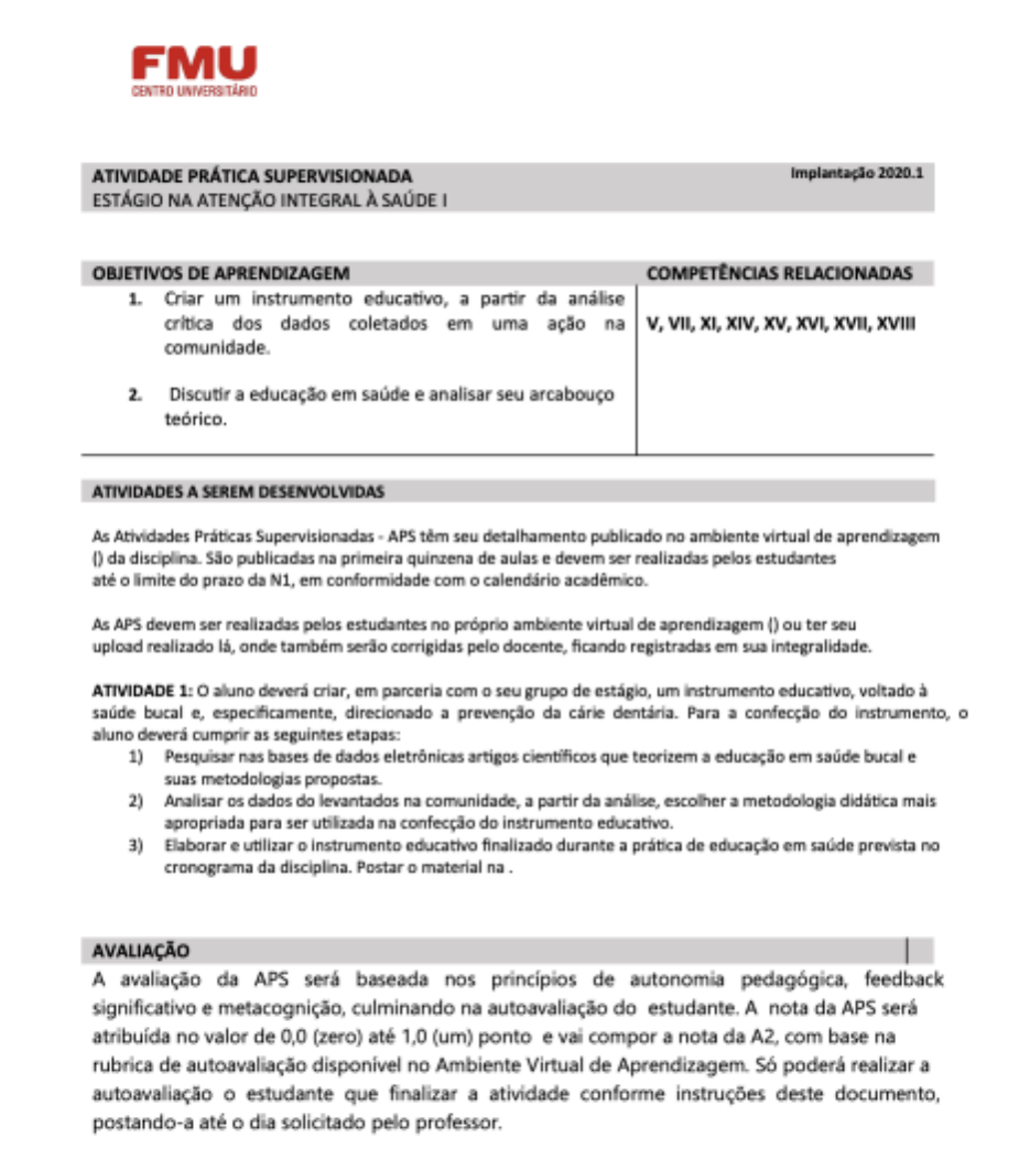 <p>FMU CENTRO ATIVIDADE PRÁTICA SUPERVISIONADA Implantação 2020.1 ESTÁGIO NA ATENÇÃO INTEGRAL À SAÚDE OBJETIVOS DE APRENDIZAGEM COMPETÊNCIAS RELACIONADAS 1. Criar um instrumento educativo, a partir da análise dos dados coletados em uma ação na V, VII, XI, XIV, XV, XVI, XVII, XVIII 2. Discutir a educação em saúde e analisar seu arcabouço teórico. ATIVIDADES A SEREM DESENVOLVIDAS As Atividades Práticas Supervisionadas APS têm seu detalhamento publicado no ambiente virtual de aprendizagem 0 da disciplina. São publicadas na primeira quinzena de aulas e devem ser realizadas pelos estudantes até o limite do prazo da N1, em conformidade com o calendário As APS devem ser realizadas pelos estudantes no próprio ambiente virtual de aprendizagem ou ter seu upload realizado lá, onde também serão corrigidas pelo docente, ficando registradas em sua integralidade. ATIVIDADE 1: o aluno deverá criar, em parceria com seu grupo de estágio, um instrumento educativo, voltado à saúde bucal e, direcionado a prevenção da cárie dentária. Para a confecção do instrumento, o aluno deverá cumprir as seguintes etapas: 1) Pesquisar nas bases de dados eletrônicas artigos que teorizem a educação em saúde bucal e suas metodologias propostas. 2) Analisar os dados do levantados na comunidade, a partir da análise, escolher a metodologia didática mais apropriada para ser utilizada na confecção do instrumento educativo. 3) Elaborar e utilizar educativo finalizado durante a prática de educação em saúde prevista no cronograma da disciplina. Postar o material na AVALIAÇÃO A avaliação da APS será baseada nos de autonomia pedagógica, feedback significativo e culminando na autoavaliação do estudante. A nota da APS será atribuída no valor de 0,0 (zero) até 1,0 (um) ponto e compor a nota da A2, com base na rubrica de autoavaliação disponível no Ambiente Virtual de Só poderá realizar a autoavaliação o estudante que finalizar a atividade conforme instruções deste documento, postando-a até o dia solicitado pelo professor.</p><p>Para monter saúde bucal devemos ter uma ALIMENTAÇÃO escovor os dentes de 2 3 vezes troca ECOVA DE DENTES 3 HIGIENE e fundamental para boca que olem do CÁRIE visivel existem as que entre os dentes que pode ser pelo do uso do FIO DENTAL A em excesso de bacterios boco e um desencodeante de algumas dos CLÍNICA DE doenças Então visite seu DENTISTA regularmente ESTAGIO FALE CONOSCO Fornecendo cuidados de alta qualidade Clinico de Estagio FMU 6214 ou final 6215 Av Santo 1239 4 noturno Balbino RA 4506480 Fernandes RA 2565486 Pretel RA 2963129 Vivianne Gibelli RA 2727043</p><p>TIPO DE CÁRIE TRATAMENTO A É UMA SE NÃO TRATADO DA MANEIR CORONÁRIA - TIPO MAIS COMUM DETERIORAÇÃO DO DENTE POR CORRETA. PODE RESULTAR ATÉ SURGE NA COROA CONTA DA PERDA DO DENTE AFETADO. (PARTE DE CONTATO COM os QUANDO CONSUMIMOS ALIMENTOS AS AINDA EM ESTÁGIO COM AS DESENVOLVIMENTO REQUEREM BACTÉRIAS PRESENTES EM NOSSA PROCEDIMENTO MAIS RADICULAR - DIRETAMENTE BOCA ABSORVEM RESTAURAÇÃO PARA RETIRADA ASSOCIADO COM A RETRAÇÃO CONTIDOS NOS ALIMENTOS, SE TECIDO CARIADO SEM GRANDE ISSO PORQUE CONFORME INTERVENÇÕES HA AFASTAMENTO DA PORÇÃO DESENVOLVEM E SE FIXAM NOS GENGIVAL QUE ANTES RECOBRIA os CRIANDO A PLACA DENTES A RAIZ FICA MAIS EXPOSTA E CONSEQUENTEMENTE MAIS E ASSIM PRODUZINDO ÁCIDOS QUE SUSCETÍVEL AO SURGIMENTO DE PROVOCAM A DESMINERALIZAÇÃO PLACAS BACTERIANAS DOS DENTES E A CONSEQUENTE CORROSÃO DOS TECIDOS COMO PREVENIR? RECORRENTE - SURGE SEMPRE NA ESPECIALMENTE o ESMALTE E A MESMA COMO POR EXEMPLO DENTINA. TROQUE DE ESCOVA DE 3 EM LOCAIS COM RESTAURACOES MESES PROTESES USAR FIO DENTAL ANTES TODAS AS ESCOVAÇÕES SINTOMAS BEBA BASTANTE AGUA os SINTOMAS QUE INDICAM LEMBRE-SE ALÉM DE EVITE CIGARROS UMA BOA VA AO DENTISTA REGULARME SURGIMENTO DA CARIE SÃO: HIGIENIZAÇÃO BUCAL SE ALIMENTE DE MANEIRA É PRECISO MANTER SAUDAVEL DOR DE EVITE os ACUCARES UMA DIETA ALIMENTAR GENGIVA INCHADA E MANCHAS MARRONS BRANCAS NA PEQUENOS FUROS ESCUROS NO DENTE</p>