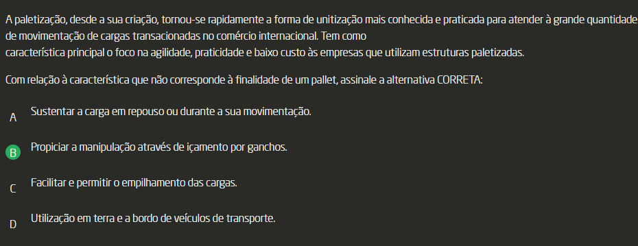<p>A paletização, desde a sua criação, tornou-se rapidamente a forma de unitização mais conhecida e praticada para atender à grande quantidade de movimentação de cargas transacionadas no comércio internacional. Tem como característica principal foco na agilidade, praticidade e baixo custo às empresas que utilizam estruturas paletizadas. Com relação à característica que não corresponde à finalidade de um pallet, assinale a alternativa CORRETA: A Sustentar a carga em repouso ou durante a sua movimentação. B Propiciar a manipulação através de icamento por ganchos. Facilitar e permitir empilhamento das cargas. D Utilização em terra e a bordo de veículos de transporte.</p>