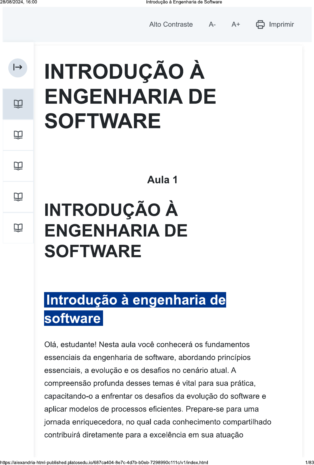 <p>28/08/2024, 16:00 Introdução à Engenharia de Software Alto Contraste A- A+ Imprimir INTRODUÇÃO À ENGENHARIA DE SOFTWARE Aula 1 INTRODUÇÃO À ENGENHARIA DE SOFTWARE Introdução à engenharia de software Olá, estudante! Nesta aula você conhecerá os fundamentos essenciais da engenharia de software, abordando princípios essenciais, a evolução e os desafios no cenário atual. A compreensão profunda desses temas é vital para sua prática, capacitando-o a enfrentar os desafios da evolução do software e aplicar modelos de processos eficientes. Prepare-se para uma jornada enriquecedora, no qual cada conhecimento compartilhado contribuirá diretamente para a excelência em sua atuação 1/83</p><p>28/08/2024, 16:00 Introdução à Engenharia de Software Ponto de Partida Nesta aula, mergulharemos nos fundamentos da Engenharia de Software, uma disciplina crucial para o desenvolvimento de sistemas computacionais eficientes e confiáveis. Esta área da tecnologia da informação é sustentada por uma série de princípios que não apenas orientam os profissionais no processo de desenvolvimento, mas também garantem a manutenção e a escalabilidade do software. Vamos explorar alguns desses princípios, compreendendo como eles são aplicados na prática e qual o impacto deles no ciclo de vida do desenvolvimento de software. Além disso, abordaremos a evolução histórica da Engenharia de Software, destacando o período conhecido como "crise do software" nas décadas de 1960 e 1970, quando a indústria de software enfrentou desafios significativos em termos de entrega de projetos dentro do prazo, do orçamento e com a qualidade esperada. Esse período foi marcado por uma demanda crescente por software e uma falta de metodologias eficientes para gerenciá-lo, o que levou ao surgimento de vários modelos de processos de desenvolvimento de software. Esses modelos, como a cascata, incremental e espiral, 2/83</p><p>28/08/2024, 16:00 Introdução à Engenharia de Software solução dos problemas enfrentados pela indústria de software e como eles são aplicados atualmente no desenvolvimento de software. Para fixar o conteúdo, vamos fazer a seguinte atividade: você deverá realizar uma análise aprofundada dos modelos de processos de desenvolvimento de software - Cascata, Espiral e Incremental mediante uma abordagem comparativa, envolvendo pesquisa, estudo de caso e elaboração de um relatório. Comece com uma pesquisa detalhada sobre cada um dos modelos mencionados. Foque nas características-chave, vantagens e desvantagens de cada modelo. Após a pesquisa, escolha um projeto de software, real ou hipotético, e analise como ele seria desenvolvido sob cada um dos modelos. Considere aspectos como as etapas do projeto, a participação do cliente, a gestão de riscos e a capacidade de adaptação a mudanças. Em seguida, elabore um relatório que compila suas descobertas. Este relatório deve incluir uma seção de discussão, em que você avalia qual modelo seria mais adequado para o projeto escolhido, com justificativas para sua escolha. Baseie suas conclusões na aplicabilidade de cada modelo em diferentes contextos de projetos de software. Bons estudos! Vamos Começar! Princípios da engenharia de software Existem várias definições de Engenharia de Software, a maioria destacando a importância de processos, métodos e ferramentas 3/83</p><p>28/08/2024, 16:00 Introdução à Engenharia de Software (2021), a Engenharia de Software é definida como um processo que inclui uma série de métodos e ferramentas que permitem aos profissionais criar software de excelente qualidade. É crucial reconhecer que a Engenharia de Software é um campo dinâmico, em que a relevância e as exigências dos programas de computador têm evoluído significativamente ao longo do tempo. A demanda por qualidade e rapidez nas entregas aumentou, levando ao desenvolvimento de novas abordagens na criação de software. Portanto, compreender essa engenharia é essencial para implementar práticas que atendam às necessidades das organizações nas quais os profissionais de operam. Dominar um conceito permite sua adaptação às necessidades individuais ou da organização, preservando sua essência fundamental. Neste contexto, uma compreensão aprofundada de Engenharia de Software exige a exploração dos termos que a constituem. "Engenharia" se refere ao design e à produção de um artefato, em que requisitos e especificações são vitais. Diferentemente dos artefatos físicos, os programas de computador não seguem um processo de manufatura convencional. Este campo envolve desafios únicos, necessitando de soluções específicas distintas dos métodos industriais tradicionais. Avançando para a definição de software, podemos considerá-lo como: Instruções executáveis que realizam funções específicas. Estruturas de dados que permitem a manipulação de informações pelos programas. Documentação relacionada ao sistema. Esses componentes formam a base da Engenharia de Software, que, segundo a IEEE Computer Society, é a prática de aplicar 4/83</p><p>28/08/2024, 16:00 Introdução à Engenharia de Software Estabelecendo a base teórica da Engenharia de Software, é essencial reconhecer os princípios que definem e sustentam suas práticas. Estes princípios, delineados pelo (Software Engineering Body of Knowledge) - SWEBOK - uma publicação notável do IEEE, são fundamentais para estruturar os processos e padronizar as soluções dentro deste campo da computação. O IEEE identifica a "organização hierárquica" como um princípio crucial. Este conceito sugere a apresentação de componentes de uma solução ou a organização de elementos de um problema em um formato hierárquico, detalhado progressivamente em cada nível. A "formalidade" segue como outro princípio importante, enfatizando uma abordagem rigorosa e padronizada na resolução de problemas. Em seguida, vem a "completeza", que res