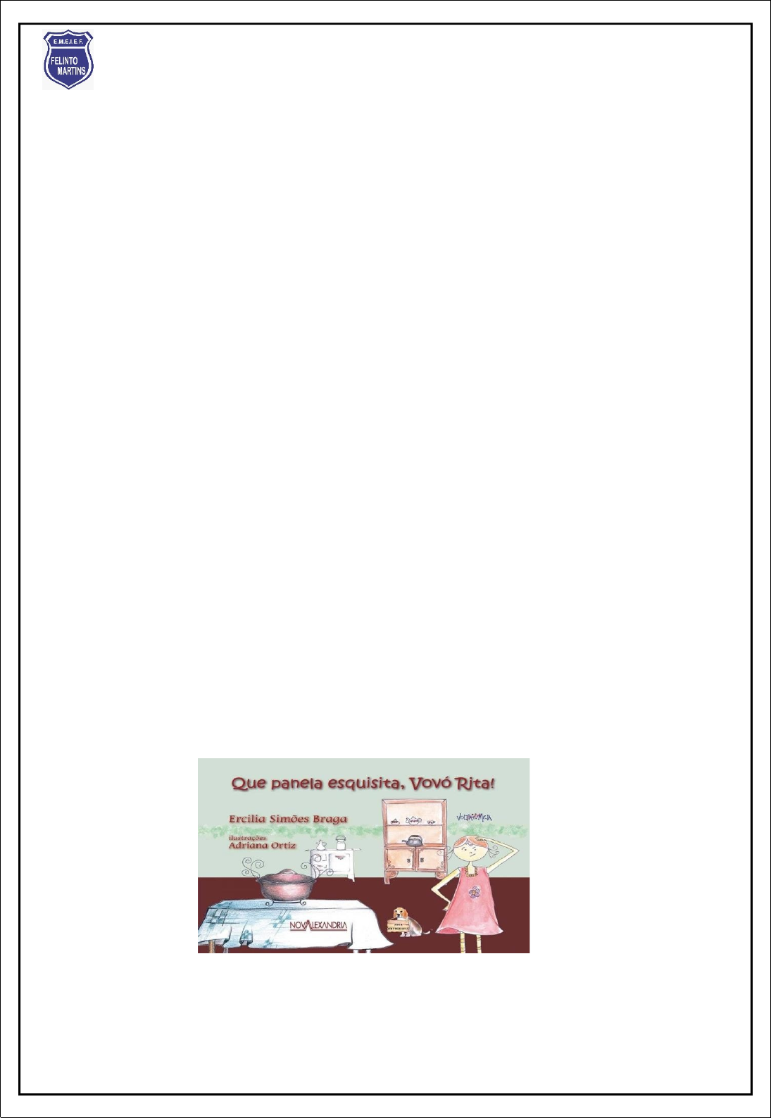 <p>EMEIEF FELINTO MARTINS</p><p>ESCOLA: E.M.E.I.E.F FELINTO MARTINS</p><p>TURMAS: 2° A/B.</p><p>PROFESSORAS: MARGARETE E SILVANIA</p><p>SEQUÊNCIA DIDÁTICA DO LIVRO: QUE PANELA ESQUISITA, VOVÓ RITA!</p><p>OBJETIVOS DE APRENDIZAGEM:</p><p>· Valorizar e respeitar a sociodiversidade como patrimônio cultural dos seres humanos;</p><p>· Identificar mudanças e permanências ocorridas ao longo do tempo nos diferentes espaços de vivência;</p><p>· Decodificação/Fluência de Leitura;</p><p>· Relato oral/Registro Formal e informal;</p><p>· Conhecimento do Alfabeto da Língua Portuguesa;</p><p>· Segmentação de palavras;</p><p>· Escrita/Produção de textos.</p><p>HABILIDADES:</p><p>· (EF15LP09); (EF15LP10); (EF15LP11); (EF15LP12); (EF15LP07/ES); (EF02LP03/ES);</p><p>· (EF15LP15); (EF15LP01); (EF15LP02); (EF15LP01/ES); (EF15LP02).</p><p>METODOLOGIA:</p><p>Momento da literatura: QUE PANELA ESQUISITA, VOVÓ RITA! (Ercilia Simões Braga/ Adriana Ortiz)</p><p>Trabalhar as estratégias de leitura (seleção/ antecipação/ inferência/ verificação)</p><p>Sentados na rodinha, a Professora contou a história, para os alunos.</p><p>2º ANO B</p><p>2º ANO A</p><p>2º ANO A</p><p>NESTA UNIDADE DO LIVRO DO PAES FICAMOS CONHECENDO A CECÍLIA UMA MENINA ESPERTA E AMIGA, HOJE VAMOS CONHECER A LUCI, UMA GAROTINHA QUE VEIO FAZER UM PASSEIO NO NOSSO ESTADO E CONHECEU A HISTÓRIA DA PANELA DE BARRO. QUE TAL VIAJAR NESSA AVENTURA? VAMOS LÁ!</p><p>REGISTRANDO</p><p>1- TÍTULO DA HISTÓRIA:</p><p>2- AUTORA:</p><p>3- ILUSTRADORA:</p><p>4- PERSONAGENS DA HISTÓRIA:</p><p>LUCI GANHOU UMA VIAGEM DE PRESENTE PARA CASA DA VOVÓ RITA. E VOCÊ, O QUE GOSTARIA DE GANHAR DE PRESENTE NO SEU ANIVERSÁRIO? ESCREVA E ILUSTRE.</p><p>2) TEXTO FRAGMENTADO (FATIADO)</p><p>3) ACRÓSTICO</p><p>2º ANO B</p><p>4) FORMANDO FRASES</p><p>2º ANO B</p><p>5) COM A MASSA DE MODELAR, CONFECÇÃO DA PANELA</p><p>2º ANO B</p><p>2º ANO A</p><p>LEIA PALAVRAS, SEPARE EM SÍLABAS E DESENHE A QUANTIDADE DE BOLINHAS DE ACORDO COM A QUANTIDADE DE SÍLABAS.</p><p>PALAVRA</p><p>SEPARAÇÃO EM SÍLABAS</p><p>DESENHAR BOLINHAS PARA</p><p>REPRESENTAR A QUANTIDADE DE SÍLABAS</p><p>LUCI</p><p>VOVÓ</p><p>RITA</p><p>PANELA</p><p>VITÓRIA</p><p>PRAIA</p><p>MANGUE</p><p>MOQUECA</p><p>GOIABEIRAS</p><p>LUCI É MUITO ESPERTA, GOSTA MUITO DE BRINCAR DE RIMAS. VAMOS AJUDÁ-LA A REALIZAR A ATIVIDADE A SEGUIR? FIQUE ATENTO AS RIMAS E NA ESCRITA CORRETA DAS PALAVRAS. RIMA COM ...</p><p>EMEIEF FELINTO MARTINS</p><p>NOME: DATA: / /</p><p>PROFESSORA:</p><p>TAREFA DE CASA</p><p>TURMA:</p><p>EM NOSSAS AULAS FICAMOS CONHECENDO A LUCI, UMA MENINA MUITO CURIOSA E INTELIGENTE. SEI QUE VOCÊ TAMBÉM É UMA CRIANÇA ASSIM!</p><p>LUCI SABOREOU UMA DELICIOSA MOQUECA, QUE É UM PRATO TRADICIONAL DA CULINÁRIA CAPIXABA. NA SUA FAMÍLIA, TEM UM “PRATO TRADICIONAL”? AQUELE QUE É SERVIDO NAS OCASIÕES ESPECIAIS? PODE SER DOCE OU SALGADO.</p><p>CONVIDE UM FAMILIAR ADULTO E ESCREVA A RECEITA TRADICONAL DA SUA FAMÍLIA. CAPRICHE NA ESCRITA. TRAGA PARA ESCOLA, POIS IREMOS ESCOLHER UMA RECEITA PARA PREPARARMOS E DEGUSTAR.</p><p>RECEITA:</p><p>INGREDIENTES:</p><p>MODO DE FAZER:</p><p>MATEMÁTICA</p><p>LUCI PRECISA DE UMA AJUDA NAS ATIVIDADES DE MATEMÁTICA. VAMOS COLABORAR COM ELA?</p><p>· NO CALENDÁRIO MARQUE O DIA 15. EM QUAL DIA DA SEMANA ELE ESTÁ?</p><p>_</p><p>· ESCREVA OS DIA DA SEMANA.</p><p>· NESSE MÊS TEMOS ANIVERSARIANTE EM NOSSA TURMA? SE SIM, ESCREVA OS NOMES.</p><p>LUCI PERDEU A EXPLICAÇÃO DA PROFESSORA E NÃO CONSEGUIU REALIZAR AS OPERAÇÕES. QUE TAL VOCÊ AJUDÁ-LA? REALIZE AS ATIVIDADES COM ATENÇÃO.</p><p>· AGORA COLABORE COM A LUCI RESOLVENDO AS SUBTRAÇÕES RESOLVA.</p><p>· LUCI GOSTA MUITO DE FRUTAS, EM UMA TARDE FEZ UM PASSEIO NA FEIRA COM SUA MÃE E SUA AVÓ. OBSERVE O GRÁFICO E VEJA QUAIS FRUTAS ELAS COMPRARAM. DEPOIS REALIZE AS ATIVIDADES.</p><p>· MOSTRE QUE VOCÊ CONHECE OS NUMERAIS E PREENCHA O QUADRO A SEGUIR.</p><p>SEI FAZER SOZINHO!</p><p>PRODUÇÃO DE FRASE</p><p>ESCOLHA 3 PALAVRAS ACIMA E PRODUZA UMA FRASE BEM CRIATIVA!</p><p>ESCRITA ESPONTÂNEA</p><p>Recursos:</p><p>Material pesquisa;</p><p>Sites na internet</p><p>Literaturas infantis.</p><p>Avaliação:</p><p>Presente nas atividades propostas;</p><p>Envolvimento com as crianças.</p><p>Referências:</p><p>BRASIL, Base Nacional Comum Curricular (BNCC). Disponível em: http://basenacionalcomum.mec.gov.br/images/BNCC_EI_EF_110518_versaofinal_site.pdf. Acesso em: 14 jun. 2024.</p><p>Espírito Santo (Estado). Secretaria de Educação. Caderno do9a) professor9a): 2º ano/Secretaria de Estado da Educação do Espírito Santo (SEDU), Gerência de Ensino Infantil e Fundamental (GEIEF),. – Vitória, ES: SEDU, 2022. (Coleção PAES Alfabetização). 250p.:il.; 29 cm – (Caderno do9a) professor9a): 2º ano.</p><p>image5.jpeg</p><p>image6.jpeg</p><p>image7.jpeg</p><p>image8.jpeg</p><p>image9.jpeg</p><p>image10.jpeg</p><p>image11.jpeg</p><p>image12.jpeg</p><p>image13.jpeg</p><p>image14.png</p><p>image15.jpeg</p><p>image16.jpeg</p><p>image17.jpeg</p><p>image18.jpeg</p><p>image19.jpeg</p><p>image20.jpeg</p><p>image21.jpeg</p><p>image120.jpeg</p><p>image22.jpeg</p><p>image23.jpeg</p><p>image1.png</p><p>image2.jpeg</p><p>image3.jpeg</p><p>image4.jpeg</p>