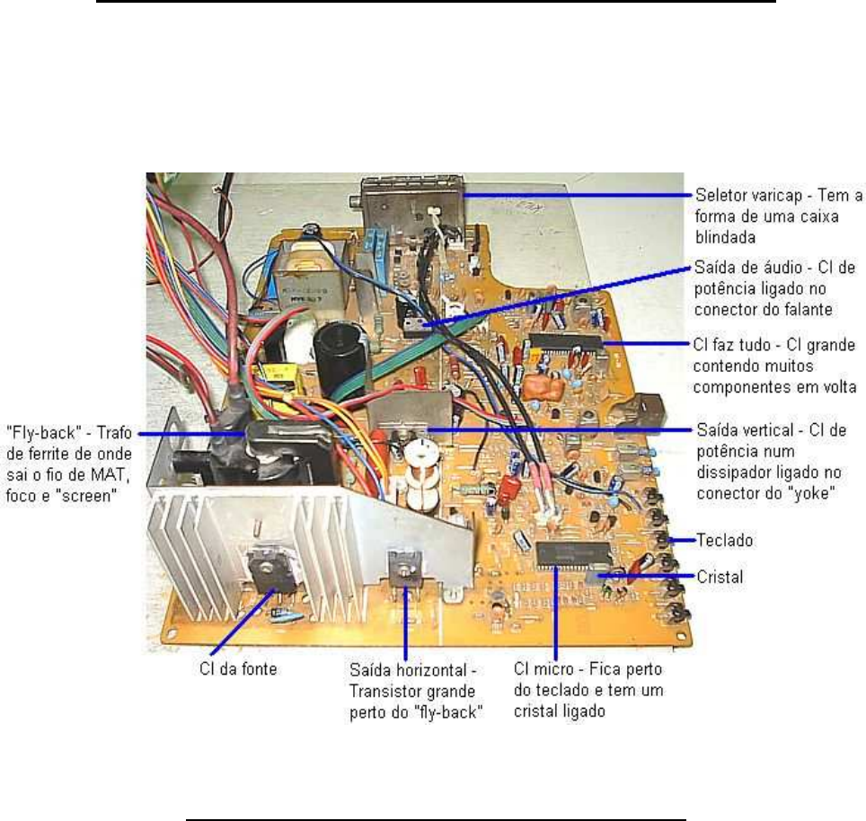 <p>1</p><p>LOCALIZAÇÃO DOS PRINCIPAIS COMPONENTES NA PLACA DO TV</p><p>Quando abrimos o televisor para consertar, podemos identificar seus circuitos através de</p><p>peças principais, inconfundíveis. Nesta aula daremos uma noção de como identificar estes</p><p>principais componentes na placa do televisor. Observe com atenção abaixo:</p><p>O TUBO DE IMAGEM E OS CIRCUITOS DE TRAMA</p><p>O tubo ou cinescópio é o principal componente do TV. É dividido em duas partes: A tela</p><p>frontal é feita de vidro chumbado. Atrás deste vidro tem milhares de pontos de fósforos que</p><p>acendem quando atingidos com força por um feixe de elétrons. Atrás da tela fica o canhão</p><p>de elétrons. Dentro do canhão há um filamento que acende e aquece um tubinho chamado</p><p>catodo que emite os elétrons com o calor gerado. Os elétrons são impulsionados com força</p><p>até a tela através de uma alta tensão (MAT) aplicada na parte de cima através de uma</p><p>chupeta com presilhas. O cabo de MAT sai de um transformador de ferrite chamado "fly-</p><p>back" . Para que o feixe de elétrons se movimente rápido pela tela, no pescoço do tubo há</p><p>um conjunto de bobinas defletoras ou yoke .</p><p>A bobina defletora horizontal (BDH) movimenta o feixe 15.750 vezes por segundo da</p><p>esquerda para a direita na tela (525 linhas x 30 quadros que é o padrão da TV no Brasil).</p><p>Para isto a BDH recebe uma corrente "dente-de-serra" de 15.750 Hz do circuito horizontal do</p><p>TV. Este circuito também possui o fly-back para gerar a MAT para o tubo.</p><p>2</p><p>A bobina defletora vertical (BDV) movimenta o feixe 60 vezes por segundo de cima para</p><p>baixo na tela (30 quadros, porém cada quadro é varrido duas vezes). A BDV recebe uma</p><p>"dente-de-serra" de 60 Hz do circuito vertical. Veja abaixo o princípio básico do tubo do TV:</p><p>Veja abaixo uma foto de um tubo de TV com os detalhes já explicados e alguns que serão</p><p>explicados posteriormente nesta matéria:</p><p>IMPORTANTE - Para que o TV tenha trama (tela acesa) devem estar funcionando: A fonte</p><p>de alimentação, o circuito horizontal e vertical, os circuitos que polarizam o tubo e CI micro</p><p>(no caso dos TVs mais modernos)</p><p>FONTE DE ALIMENTAÇÃO DO TELEVISOR</p><p>A fonte recebe a tensão alternada da rede e a transforma em contínua para alimentar os</p><p>circuitos do TV. É dividida em duas partes: A fonte comum que transforma a tensão da rede</p><p>em 150 VCC não estabilizada (má qualidade) e a fonte chaveada que transforma os 150</p><p>VCC em um ou vários +B estabilizados (boa qualidade). Abaixo temos os menus para esta</p><p>parte do TV:</p><p>• A fonte comum</p><p>• A fonte chaveada em série</p><p>• A fonte chaveada em paralelo</p><p>• Separação dos terras do TV</p><p>http://www.burgoseletronica.net/paginadetv/fontecomum.htm</p><p>http://www.burgoseletronica.net/paginadetv/fontechaveadaemserie.htm</p><p>http://www.burgoseletronica.net/paginadetv/fontechaveadaemparalelo.htm</p><p>http://www.burgoseletronica.net/paginadetv/separacaodosterras.htm</p><p>3</p><p>• Componentes mais usados na fonte dos televisores</p><p>A FONTE COMUM E O CIRCUITO DE DESMAGNETIZAÇÃO DO TU BO</p><p>A fonte comum é encontrada através do cabo de força e dos quatro diodos retificadores,</p><p>tanto no esquema quanto na placa do TV. Também há o fusível de proteção, o capacitor de</p><p>filtro principal (o maior eletrolítico do TV), o fusistor de entrada (resistor de potência de fio de</p><p>baixo valor que funciona como um fusível) e uma chave liga/desliga geral em alguns TVs.</p><p>Veja abaixo o princípio da fonte comum:</p><p>Os diodos transformam a tensão alternada da rede em pulsante e o capacitor de filtro,</p><p>transforma em tensão continua de 150 V ou 300 V se a rede for 220 V. Esta tensão vai para</p><p>a fonte chaveada. O fusistor de entrada é o resistor grande de baixo valor já mencionado.</p><p>Tem duas funções: Proteger a fonte chaveada do pico inicial da tensão de 150 V e abrir se</p><p>algum componente entrar em curto na fonte. As duas bobinas e o capacitor de poliéster na</p><p>entrada da rede não permitem que a frequência da fonte chaveada saia pela rede e interfira</p><p>em outros aparelhos. Este filtro está presente em todos os tipos de fonte chaveada.</p><p>Circuito de desmagnetização - A bobina de desmagnetização fica enrolada numa fita</p><p>isolante em volta do tubo. Tem a função de criar um campo magnético alternado com a</p><p>tensão da rede para desmagnetizar a máscara de sombras (uma chapa de ferro que há</p><p>dentro do tubo). Desta forma evita-se que a imagem apresente manchas coloridas nos</p><p>cantos da tela. Esta bobina funciona por poucos segundos até que o termistor PTC se</p><p>aqueça, aumente sua resistência e diminua bastante a corrente. Em alguns TVs o termistor</p><p>PTC é duplo, em outros é simples.</p><p>• COMO ENCONTRAR A FONTE COMUM NA PLACA DO TELEVISOR</p><p>COMO ACHAR A FONTE COMUM NA PLACA DO TV</p><p>Conforme já explicado, a fonte comum pode ser encontrada na placa seguindo-se o cabo de</p><p>força. A seguir acharemos os diodos retificadores (há TVs que usam a ponte retificadora</p><p>numa peça só), o filtro principal, fusível, fusistor, termistor e o conector da bobina de</p><p>desmagnetização. Veja abaixo dois exemplos:</p><p>http://www.burgoseletronica.net/paginadetv/componentesmaisusadosnafonte.htm</p><p>http://www.burgoseletronica.net/paginadetv/comoacharafontecomum.htm</p><p>4</p><p>FONTE CHAVEADA EM SÉRIE</p><p>Neste tipo um transistor chamado regulador fica em série com a linha de +B do televisor. Ele</p><p>recebe o +B de 150 V da fonte comum através do primário de um transformador de ferrite</p><p>chamado "chopper" . Através da oscilação deste transformador juntamente com alguns</p><p>componentes ligados, o transistor funciona como uma chave liga/desliga, conduzindo e</p><p>cortando ce