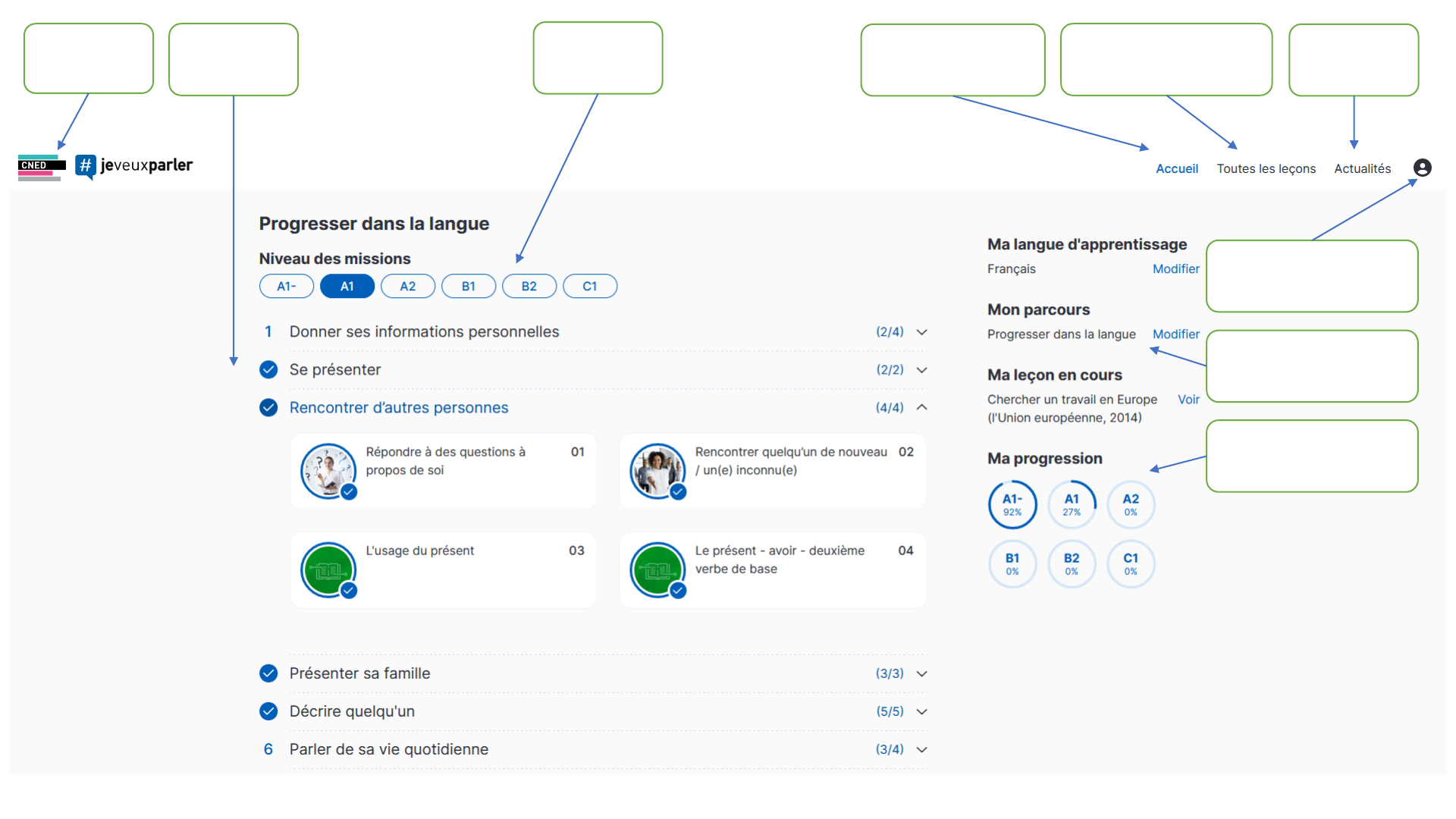 <p>Accès rapide aux</p><p>niveaux.</p><p>Informations sur la langue travaillée,</p><p>le parcours (modifiable), la leçon.</p><p>Accès à mon tableau de bord</p><p>et à mon parcours</p><p>personnalisé.</p><p>Accès à l’ensemble des leçons par</p><p>thématique (vocabulaire,</p><p>grammaire, professionnelle).</p><p>Accès aux actualités</p><p>et quiz.</p><p>Menu déroulant « Profil », pour</p><p>changer la langue d’affichage,</p><p>accéder au profil, passer le test de</p><p>niveau, télécharger une attestation,</p><p>accéder à l’aide, …</p><p>Mes leçons en</p><p>parcours</p><p>personnalisé.</p><p>Retour à mon</p><p>espace de</p><p>formation.</p><p>Ma progression.</p><p>Diapositive 1</p>