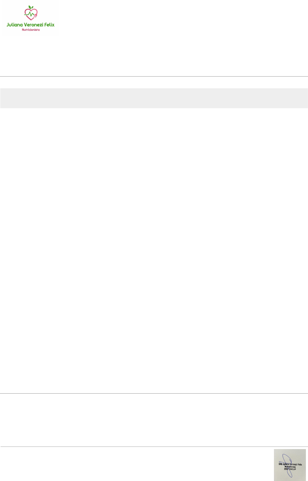 <p>Dra. Veronezi Felix</p><p>Nutricionista</p><p>jf_julianafelix@hotmail.com</p><p>(11) 977325908</p><p>Página 1/12 | Paciente Geovana Dos Santos Leme Cesar | Prescrito em: 04/10/2023.</p><p>Plano alimentar</p><p>Planejamento alimentar</p><p>08:00 - Café-da-manhã</p><p>• Café - 1 Xícara(s) de café (80ml)</p><p>Ou Cacau em pó - 1 Colher(es) de chá cheia(s) (4g);</p><p>Ou Chá Mate - 1 Xícara(s) de chá (180ml);</p><p>Ou Chá de erva doce - 1 Xícara(s) de chá (180ml);</p><p>Alternativa: Escolha 1 porção do grupo 1 (Baixa Caloria) na lista de substituição (em anexo).</p><p>• Ovo de galinha mexido - 2 Unidade(s) grande(s) (110g)</p><p>Ou Patê de frango/atum - 2 Colher(es) de sopa cheia(s) (55g);</p><p>Ou Peito de frango desfiado - 2 Colher(es) de sopa cheia(s) (50g);</p><p>Ou Peito de peru defumado - 4 Fatia(s) média(s) (80g);</p><p>Alternativa: Escolha 1 porção do grupo 4 (Carnes e Proteínas) na lista de substituição (em anexo).</p><p>• Mamão papaia - ½ Unidade(s) pequena(s) (135g)</p><p>Ou Banana nanica - 1 Unidade(s) média(s) (65g);</p><p>Ou Pera Park crua - 1 Unidade(s) média(s) (110g);</p><p>Ou Uva Rubi ou Itália - 15 Unidade(s) (120g);</p><p>Alternativa: Escolha 1 porção do grupo 9 (Frutas Comuns) na lista de substituição (em anexo).</p><p>• Goma de tapioca - 2 Colher(es) de sopa cheia(s) (40g)</p><p>Ou Pão tipo folha/rap - 2 Unidade(s) média(s) (80g);</p><p>Ou Pão de forma integral - 2 Fatia(s) (50g);</p><p>Ou Torrada integral - 4 Unidade(s) (40g);</p><p>Alternativa: Escolha 2 porções do grupo 12 (Pães e Fibras) na lista de substituição (em anexo).</p><p>• Queijo muçarela - 1 Fatia(s) grande(s) (30g)</p><p>Ou Queijo minas frescal - 2 Fatia(s) pequena(s) (40g);</p><p>Ou Queijo minas meia cura - 2 Fatia(s) pequena(s) (40g);</p><p>Ou Leite de vaca desnatado UHT - 1 Copo(s) americano(s) duplo(s) (240ml);</p><p>Alternativa: Escolha 1 porção do grupo 13 (Laticínios e derivados) na lista de substituição (em anexo).</p><p>Dra. Veronezi Felix</p><p>Nutricionista</p><p>jf_julianafelix@hotmail.com</p><p>(11) 977325908</p><p>Página 2/12 | Paciente Geovana Dos Santos Leme Cesar | Prescrito em: 04/10/2023.</p><p>12:30 - Almoço</p><p>• Alface crespa/lisa/americana - 8 Folha(s) média(s) (80g)</p><p>Ou Couve refogada - 4 Colher(es) de sopa cheia(s) (picada) (80g);</p><p>Ou Espinafre refogado - 4 Colher(es) de sopa cheia(s) (100g);</p><p>Ou Repolho refogado - 4 Colher(es) de sopa cheia(s) (80g);</p><p>Alternativa: Escolha 2 porções do grupo 2 (Vegetais A ou Folhosos) na lista de substituição (em anexo).</p><p>• Tomate salada - 3 Fatia(s) grande(s) (90g)</p><p>Ou Cenoura cozida - 3 Colher(es) de sopa cheia(s) (75g);</p><p>Ou Brócolis cozido - 2 Ramo(s) médio(s) (120g);</p><p>Ou Abóbora cabotian cozida - 1 Colher(es) de sopa (36g);</p><p>Alternativa: Escolha 1 porção do grupo 3 (Vegetais B ou Hortaliças) na lista de substituição (em anexo).</p><p>• Patinho sem gordura grelhado - 2 Bife(s) pequeno(s) (60g)</p><p>Ou Peito de frango desfiado - 3 Colher(es) de sopa cheia(s) (75g);</p><p>Ou Pescada branca grelhada - 1 Posta(s) pequena(s) (112.5g);</p><p>Ou Sobrecoxa de frango sem pele assada - 1.5 Unidade(s) pequena(s) (75g);</p><p>Alternativa: Escolha 1.5 porções do grupo 4 (Carnes e Proteínas) na lista de substituição (em anexo).</p><p>• Arroz branco cozido - 2 Colher(es) de sopa cheia(s) (50g)</p><p>Ou Batata doce cozida - 2 Fatia(s) pequena(s) (80g);</p><p>Ou Mandioca/Aipim cozido - 2 Colher(es) de sopa rasa(s) (50g);</p><p>Ou Batata baroa/Mandioquinha cozida - 2 Colher(es) de arroz rasa(s) (70g);</p><p>Alternativa: Escolha 2 porções do grupo 5 (Cereais e Tubérculos) na lista de substituição (em anexo).</p><p>• Feijão carioca cozido - 1 Concha(s) pequena(s) cheia(s) (65g)</p><p>Ou Lentilha cozida - 1 Colher(es) de arroz cheia(s) (35g);</p><p>Ou Feijão preto cozido - 1 Concha(s) pequena(s) cheia(s) (65g);</p><p>Ou Grão de bico cozido - 1 Colher(es) de arroz cheia(s) (45g);</p><p>Alternativa: Escolha 1 porção do grupo 6 (Feijão e Leguminosas) na lista de substituição (em anexo).</p><p>Dra. Veronezi Felix</p><p>Nutricionista</p><p>jf_julianafelix@hotmail.com</p><p>(11) 977325908</p><p>Página 3/12 | Paciente Geovana Dos Santos Leme Cesar | Prescrito em: 04/10/2023.</p><p>15:30 - Lanche</p><p>• Banana nanica - 1 Unidade(s) média(s) (65g)</p><p>Ou Morango - 10 Unidade(s) (200g);</p><p>Ou Manga Palmer - ½ Unidade(s) média(s) (70g);</p><p>Ou Uva Rubi ou Itália - 15 Unidade(s) (120g);</p><p>Alternativa: Escolha 1 porção do grupo 9 (Frutas Comuns) na lista de substituição (em anexo).</p><p>• Mix de castanhas - 2 Colher(es) de sopa (25g)</p><p>Ou Amêndoa torrada - 20 Unidade(s) (20g);</p><p>Ou Castanha de caju - 8 Unidade(s) (20g);</p><p>Ou Pasta de amendoim integral - 1 Colher(es) de sopa cheia(s) (20g);</p><p>Alternativa: Escolha 1 porção do grupo 11 (Nozes e Sementes) na lista de substituição (em anexo).</p><p>Dra. Veronezi Felix</p><p>Nutricionista</p><p>jf_julianafelix@hotmail.com</p><p>(11) 977325908</p><p>Página 4/12 | Paciente Geovana Dos Santos Leme Cesar | Prescrito em: 04/10/2023.</p><p>18:30 - Jantar</p><p>• Peito de frango desfiado - 2 Colher(es) de sopa cheia(s) (50g)</p><p>Ou Patê de frango/atum - 2 Colher(es) de sopa cheia(s) (55g);</p><p>Ou Peito de peru defumado - 4 Fatia(s) média(s) (80g);</p><p>Ou Ovo de galinha mexido - 2 Unidade(s) grande(s) (110g);</p><p>Alternativa: Escolha 1 porção do grupo 4 (Carnes e Proteínas) na lista de substituição (em anexo).</p><p>• Suco de fruta natural - 1 Copo(s) duplo(s) cheio(s) (240ml)</p><p>Ou Maçã Fuji - 1 Unidade(s) pequena(s) (90g);</p><p>Ou Melão - 2 Fatia(s) grande(s) (230g);</p><p>Ou Melancia - 1 Fatia(s) média(s) (200g);</p><p>Alternativa: Escolha 1 porção do grupo 9 (Frutas Comuns) na lista de substituição (em anexo).</p><p>• Pão de forma integral - 2 Fatia(s) (50g)</p><p>Ou Pão tipo folha/rap - 2 Unidade(s) média