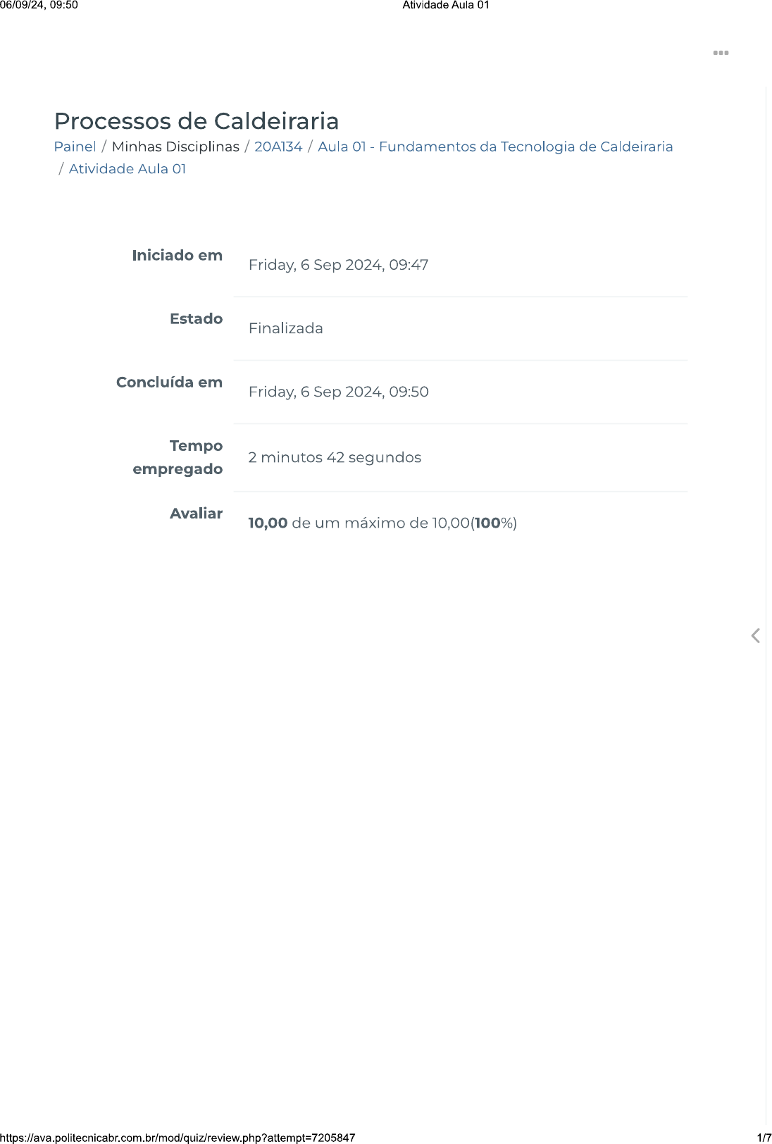 <p>06/09/24, 09:50 Atividade Aula 01 ⑉ Processos de Caldeiraria Painel / Minhas Disciplinas / 20A134 / Aula - Fundamentos da Tecnologia de Caldeiraria / Atividade Aula 01 Iniciado em Friday, 6 Sep 2024, 09:47 Estado Finalizada Concluída em Friday, 6 Sep 2024, 09:50 Tempo 2 minutos 42 segundos empregado Avaliar 10,00 de um máximo de 10,00(100%) < 1/7</p><p>06/09/24, 09:50 Atividade Aula 01 Correto Atingiu 2,00 de 2,00 Para fabricar peças com qualidade e garantir a montagem perfeita do conjunto, evitando problemas que levam caldeireiro a fazer ajustes com esmerilhadeiras manuais ou limas (retrabalho), caldeireiro deve cumprir, desde a fase do projeto, um procedimento com as seguintes fases, exceto: Escolha uma opção: a. Elaborar O desenho da planificação da peça. b. Traçar desenho planificado da peça na chapa e puncionar traçado que será utilizado para corte, para facilitar a visualização durante esta operação. C. Elaborar desenho técnico normalizado da peça com as devidas tolerâncias geométricas e dimensionais, especificações do material e processo de soldagem a ser utilizado. < d. Soldar fechamento da peça e sua fixação no conjunto. Efetuar testes, sempre. e. Executar corte da peça em uma serra de fita, ou, se for caso, utilizar outras máquinas que possam facilitar e melhorar acabamento da peça. 2/7</p><p>06/09/24, 09:50 Atividade Aula 01 Correto Atingiu 2,00 de 2,00 Marque Verdadeiro ou Falso, processo de operação para corte de chapas metálicas finas: Utilizar EPI recomendado para esta operação, óculos de proteção transparente, protetor auricular, calçado de proteção e roupas justas ao corpo, para que não haja pontos de agarramento; Fixar a peça que será cortada utilizando, se possível, uma bancada ou cavaletes e grampos para fixação; Precaução: a peça ou retalho resultante do corte não deve, em hipótese alguma, ser tocado com a mão durante corte. Os furos de saída feitos previamente servem para possibilitar que retalho seja destacado, se possível, por gravidade; Com a máquina desligada, posicione-a no traço de referência do material que será cortado; Precaução: Se corte for sem saída, deve-se fazer um furo em cada vértice da cavidade, se a mesma for poligonal, ou um furo de entrada, se for cilíndrica ou curva; Verificar se não há peças, ferramentas ou condutores elétricos que possam ser atingidos pela serra, causando acidentes; Ligar a máquina e iniciar corte mantendo avanço constante e proporcional ao material que está sendo serrado; Precaução: manter a mão que está livre longe da região de corte, lembrando que a peça está fixada por grampos; Desligar a máquina e retirar as fixações do material. Escolha uma opção: Verdadeiro Falso 3/7</p><p>06/09/24, 09:50 Atividade Aula 01 Correto Atingiu 2,00 de 2,00 A velocidade de corte é fundamental para calcular número de RPM das ferramentas de usinagem, e varia de acordo com a resistência de cada material. Os fatores que influenciam a velocidade de corte são: Escolha uma opção: a. Operação de usinagem (desbaste ou acabamento). b. Tipo de perfil a ser usinado (paralelo, cônico, canal, torneamento interno, faceamento, corte, furação etc.). C. Material da ferramenta que será utilizada (metal duro ou aço rápido). d. Tipo de material da peça que será usinada. e. Todas as alternativas corretas. < 4/7</p><p>06/09/24, 09:50 Atividade Aula 01 Correto Atingiu 2,00 de 2,00 caldeireiro fabrica peças a partir de chapas, e tais peças podem ser curvadas ou dobradas. Seu fechamento normalmente se dá por processo de soldagem adequado de acordo com material que está sendo utilizado. Essas características fazem do caldeireiro um profissional polivalente, que reúne competências como: Escolha uma opção: a. desenho técnico mecânico b. conformação mecânica C. usinagem d. higiene e segurança no trabalho e. todas as alternativas corretas < 5/7</p><p>06/09/24, 09:50 Atividade Aula 01 Correto Atingiu 2,00 de 2,00 Marque Verdadeiro ou Falso: As furadeiras são construídas para atender os diversos tipos de aplicação: desde os mais simples, como a utilização doméstica, até uso em caldeirarias de grande porte. De acordo com suas características construtivas, as furadeiras podem ser: ( ) Furadeira com coluna de bancada: este tipo de furadeira é fabricado com uma coluna que permite que a ferramenta seja instalada diretamente no piso onde irá ser utilizada. Na maioria dos modelos, a trans- missão de movimento do motor para eixo árvore é feita por meio de engrenagens, que confere maior força de trabalho à máquina. Por isso é tipo mais comum nas indústrias e oficinas de manutenção. Per- mite a utilização de brocas, machos ou alargadores, que podem ser fixados através de mandril ou diretamente na árvore da máquina dotada de cone morse, com buchas cônicas, se necessário. Escolha uma opção: Verdadeiro Falso Entre em Contato Links Úteis https://www.politecnicabr.com.br Dicas da nossa Diretora Acadêmica 0800 084 2627 Planner de Estudos 0800 084 2627 Declaração de Matrícula Orientações do AVA Abertura de Ticket @ 6/7</p>