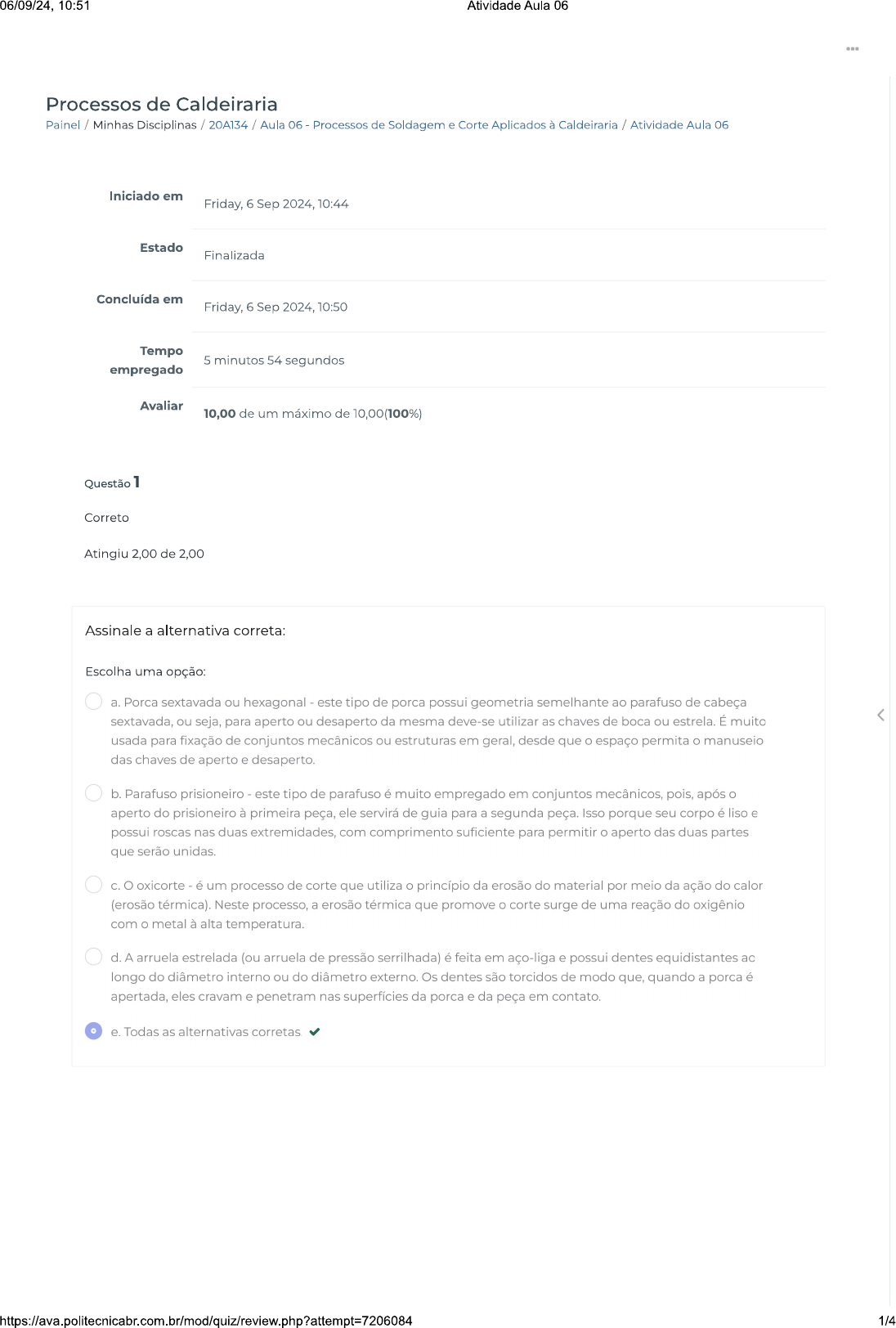 <p>06/09/24, 10:51 Atividade Aula 06 Processos de Caldeiraria Painel / Minhas Disciplinas / 20A134 / Aula 06 - Processos de Soldagem e Corte Aplicados à Caldeiraria / Atividade Aula 06 Iniciado em Friday, 6 Sep 2024, 10:44 Estado Finalizada Concluída em Friday, 6 Sep 2024, 10:50 Tempo 5 minutos 54 segundos empregado Avaliar 10,00 de um máximo de 10,00(100%) Questão 1 Correto Atingiu 2,00 de 2,00 Assinale a alternativa correta: Escolha uma opção: a. Porca sextavada ou hexagonal - este tipo de porca possui geometria semelhante ao parafuso de cabeça sextavada, ou seja, para aperto ou desaperto da mesma deve-se utilizar as chaves de boca ou estrela. É muito usada para fixação de conjuntos mecânicos ou estruturas em geral, desde que o espaço permita o manuseio das chaves de aperto e desaperto b. Parafuso prisioneiro este tipo de parafuso é muito empregado em conjuntos mecânicos, pois, após aperto do prisioneiro à primeira peça, ele servirá de guia para a segunda peça. Isso porque seu corpo é liso e possui roscas nas duas extremidades, com comprimento suficiente para permitir o aperto das duas partes que serão unidas. C. oxicorte é um processo de corte que utiliza princípio da erosão do material por meio da ação do calor (erosão térmica). Neste processo, a erosão térmica que promove corte surge de uma reação do oxigênio com o metal à alta temperatura. d. A arruela estrelada (ou arruela de pressão serrilhada) é feita em aço-liga e possui dentes equidistantes ao longo do diâmetro interno ou do diâmetro externo. Os dentes são torcidos de modo que, quando a porca é apertada, eles cravam e penetram nas superfícies da porca e da peça em contato. Todas as alternativas 1/4</p><p>06/09/24, 10:51 Atividade Aula 06 Correto Atingiu 2,00 de 2,00 calor produzido por arcos elétricos e suas irradiações, por escórias quentes e por faíscas, podem ser causas de incêndios ou explosões. Consequentemente, toda área de soldagem ou corte deve ser equipada com sistema adequado de combate a incêndio, e pessoal de supervisão de área, operação ou manutenção do equipamento envolvido precisa ser treinado em relação ao combate a incêndios. Todo e qualquer trabalhador deve estar familiarizado com as seguintes medidas de prevenção e proteção contra incêndios: locais direcionados à soldagem ou corte não devem conter líquidos inflamáveis (gasolina, Eliminar possíveis caus tintas, solventes etc.), sólidos combustíveis (papel, materiais de embalagem, madeira etc.) ou gases inflamáveis (oxigênio, acetileno, hidrogênio etc.). sempre que possível, trabalhar em locais especialmente previstos para soldagem ou corte Garantir a segurança da ao arco elétrico. quando as operações de soldagem ou corte não podem ser efetuadas em locais específicos e especialmente organizados, deve-se instalar biombos metálicos ou proteções não Instalar barreiras contra inflamáveis ou não combustíveis para evitar que calor, as fagulhas, os respingos ou as escórias possam atingir materiais extintores apropriados, baldes de areia e outros dispositivos anti-incêndio devem estar nas proximidades imediatas da área de soldagem ou de corte. Sua especificação depende da Instalar equipamentos quantidade e do tipo dos materiais combustíveis que possam se encontrar no local de trabalho. antes de iniciar uma operação de soldagem ou corte em local não especificamente previsto para esta finalidade, o mesmo deve ser inspecionado por pessoa habilitada para a devida Usar um procedimento autorização de a soldagem ou o corte em áreas confinadas requer procedimentos específicos de ventilação Locais como poços, tan e trabalho, com o eventual uso de capacetes ou máscaras especiais. Questão 3 Correto Atingiu 2,00 de 2,00 conjunto para soldagem oxiacetilênica é composto dos seguintes componentes, exceto: Escolha uma opção: a. reguladores de pressão (um em cada cilindro). b. cilindro de carbono. C. cilindro de acetileno. d. válvulas unidirecionais (contrafluxo). e. válvulas contra retrocesso de chama. 2/4</p><p>06/09/24, 10:51 Atividade Aula 06 Correto Atingiu 2,00 de 2,00 Exemplos de eletrodos revestidos e suas características, marque a alternativa adequada: Escolha uma opção: a. E6013: resistência à tração do metal depositado, mínima de 60 ksi (~430 MPa). Soldagem em todas as posições em corrente Revestimento tipo celulósico ligado com silicato de sódio b. E6010: resistência à tração do metal depositado, mínima de 70 ksi (~490 MPa). Soldagem em todas as posições em correntes CA, Revestimento tipo básico de baixo hidrogênio e pó de ferro ligado com silicato de potássio. C. E8018: resistência à tração do metal depositado, mínima de 60 ksi (~430 MPa). Soldagem em todas as posições em correntes CA, CC+ ou Revestimento tipo rutílico ligado com silicato de potássio. d. E8018-B2: resistência à tração do metal depositado, mínima de 80ksi (~550 MPa) após tratamento térmico. Soldagem em todas as posições em correntes CA, CC+. Revestimento tipo básico de baixo e pó de ferro ligado com silicato de potássio, depositando metal de solda com teores de 1,25% Cr e 0,5 Mo (resistente à fluência). Questão 5 Correto Atingiu 2,00 de 2,00 Associe corretamente referente a partes do Cilindro: Colarinho peça que possui rosca externa para fixação por rosca do capacete e está fixada ao colarinho. peça cônica situada na parte superior do cilindro que possui um furo roscado para fixação Gargalo por rosca da válvula. Pé peça opcional que, quando fixada à base do cilindro, auxilia na sua estabilidade. fixado por rosca ao colarinho com a finalidade de proteger a válvula do cilindro. Capacete (ou cúpula) Base confere estabilidade ao cilindro na posição vertical. Calota fica na parte superior do cilindro. Entre em Contato Links Úteis Dicas da nossa Diretora Acadêmica 3/4</p>