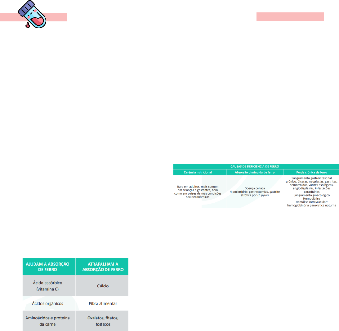 <p>Maria Luiza A. Locatelli – Clínica Médica</p><p>1</p><p>Anemias microcíticas</p><p>1. Anemia ferropriva</p><p>É a anemia mais comum no mundo, sendo</p><p>responsável por mais de 50% dos casos. O</p><p>ferro é um componente essencial da molécula</p><p>de hemoglobina, sendo justamente o</p><p>responsável pela ligação com o oxigênio</p><p>transportado.</p><p>É absorvido pela dieta, principalmente no</p><p>duodeno, sob sua forma heme (ferro ferroso,</p><p>de origem animal) ou não heme (ferro férrico,</p><p>de origem vegetal). Em seu estado férrico</p><p>(Fe3+) deve ser convertido na forma ferrosa</p><p>(Fe2+) para adentrar os enterócitos, o que é</p><p>feito por enzimas na membrana entérica e</p><p>favorecido por ambiente ácido.</p><p>Após adentrar os enterócitos, o ferro é ligado</p><p>à transferrina, seu principal transportador</p><p>sérico, que leva o mineral à medula óssea</p><p>para a produção de hemoglobina.</p><p>Todo o ferro não utilizado é armazenado no</p><p>interior dos hepatócitos sob a forma de</p><p>ferritina. Normalmente, não há excreção de</p><p>ferro, exceto por perdas via sangramento</p><p>(como menstrual) e descamação dos</p><p>enterócitos.</p><p>Ferro</p><p>• Absorvido no duodeno;</p><p>• Transportado no soro pela transferrina;</p><p>• Armazenado sob a forma de ferritina;</p><p>• Sem mecanismo de excreção: discretas</p><p>perdas em menstruação e fezes.</p><p>Causas</p><p>Qualquer situação em que o aporte de ferro</p><p>diminua (carência nutricional), a absorção</p><p>seja prejudicada ou as perdas estejam</p><p>aumentadas pode precipitar um balanço</p><p>negativo de ferro, levando à redução do ferro</p><p>corporal total e, com isso, à anemia ferropriva.</p><p>Fisiopatologia</p><p>Qualquer que seja sua causa, a anemia</p><p>ferropriva será o estágio final de três fases</p><p>progressivas, iniciadas por um balanço</p><p>negativo de ferro.</p><p>Seja por menor absorção ou maior perda,</p><p>essa depleção do ferro corporal faz com que</p><p>suas reservas (ferritina) sejam consumidas</p><p>para mantê-lo circulante, até que sejam</p><p>completamente absorvidas e, assim, cai o</p><p>nível sérico de ferro, com menor quantidade</p><p>do mineral chegando à medula óssea.</p><p>Instala-se, então, a eritropoiese deficiente</p><p>em ferro, estágio em que a síntese de</p><p>hemoglobina diminui por falta de aporte desse</p><p>minério à medula, levando ao surgimento de</p><p>hemácias microcíticas e hipocrômicas. Com a</p><p>manutenção dessa produção de hemácias</p><p>deficientes, surge, finalmente, a anemia</p><p>ferropriva, inicialmente normo/ normo, mas,</p><p>progressivamente, hipo/micro.</p><p>Maria Luiza A. Locatelli – Clínica Médica</p><p>2</p><p>Ela tipicamente se manifesta como uma</p><p>anemia hipo/micro de RDW aumentado,</p><p>decorrente da produção de hemácias</p><p>comprometidas pela incapacidade de síntese</p><p>de hemoglobina. Anemia ferropriva é nossa</p><p>principal hipótese para quadros de anemia</p><p>hipo/micro de RDW aumentado.</p><p>Clínica</p><p>Além da anemia hipo/micro, a deficiência de</p><p>ferro é marcada por alguns sinais e sintomas</p><p>característicos. A glossite atrófica (“língua</p><p>careca”) e a queilite angular (inflamação das</p><p>comissuras labiais) são alterações típicas de</p><p>todas as anemias carenciais, também</p><p>encontradas na anemia megaloblástica.</p><p>Outras manifestações são mais específicas da</p><p>deficiência de ferro, como a pica (compulsão</p><p>alimentar por substâncias não nutricionais), a</p><p>coiloníquia (depressão ungueal), a síndrome</p><p>das pernas inquietas (compulsão em</p><p>movimentar os membros) e síndrome de</p><p>Paterson-Kelly ou Plummer-Vinson (formação</p><p>de membrana esofágica).</p><p>Diagnóstico</p><p>O exame padrão-ouro para o diagnóstico é a</p><p>avaliação dos estoques medulares de ferro</p><p>pelo mielograma corado com o azul da</p><p>Prússia de Perls. No entanto, na maioria dos</p><p>pacientes, esse exame invasivo pode ser</p><p>substituído pela avaliação do perfil de ferro,</p><p>como a seguir:</p><p>Assim, esperamos que um paciente</p><p>ferropênico apresente ferritina, ferro sérico e</p><p>saturação de transferrina baixos, com</p><p>CTLF/TIBC, receptores solúveis de</p><p>transferrina e protoporfirina eritrocitária livre</p><p>altos.</p><p>A ferritina é o marcador sérico mais sensível e</p><p>específico para o diagnóstico da anemia</p><p>ferropriva, sendo, inclusive, o primeiro a</p><p>alterar-se. Sempre que estivermos diante de</p><p>um paciente com ferritina baixa, estamos</p><p>diante de um paciente com anemia ferropriva.</p><p>Tratamento</p><p>Maria Luiza A. Locatelli – Clínica Médica</p><p>3</p><p>Diante de um quadro confirmado de</p><p>ferropenia, nossa primeira conduta deve ser a</p><p>investigação etiológica.</p><p>Em adultos, a causa mais comum de</p><p>deficiência de ferro é o sangramento</p><p>gastrointestinal crônico, então sempre</p><p>devemos investigar o trato gastrointestinal</p><p>desses pacientes com endoscopia digestiva</p><p>alta e colonoscopia, complementadas pela</p><p>cápsula endoscópica, se necessário.</p><p>Isso é especialmente verdadeiro em idosos,</p><p>em que o risco de neoplasias intestinais é</p><p>muito grande. Além de investigar e tratar a</p><p>causa da anemia ferropriva, a reposição de</p><p>ferro é essencial: orientação alimentar não é</p><p>um tratamento adequado para anemia</p><p>ferropriva, mesmo que seja leve.</p><p>Ainda que possamos orientar maior ingesta de</p><p>alimentos ricos em ferro, sempre é preciso</p><p>prescrever reposição de ferro.</p><p>Essa reposição é feita preferencialmente por</p><p>via oral, já que é tão efetiva quanto a</p><p>parenteral e apresenta menos efeitos</p><p>adversos, além de custo mais baixo. A via</p><p>parenteral é reservada para casos refra