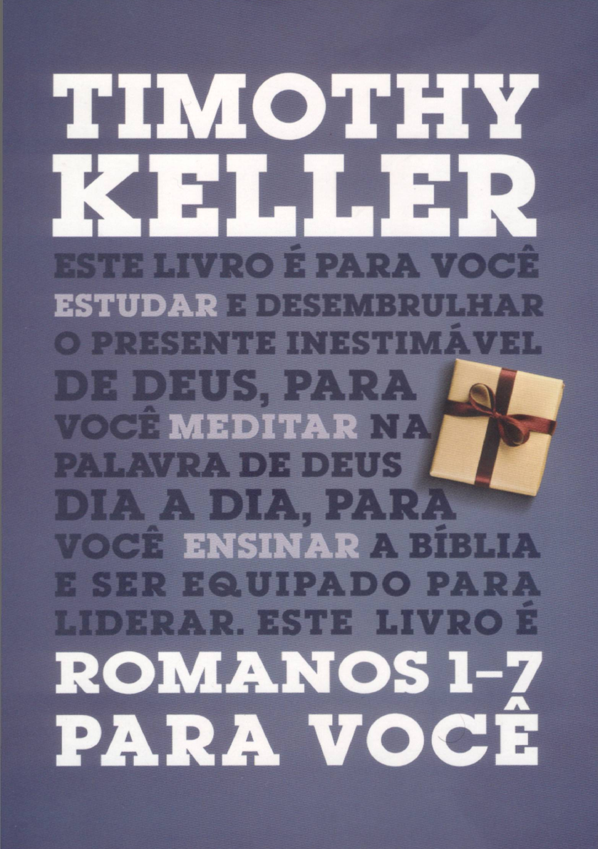 <p>ROMANOS 1-7</p><p>PARA VOCÊ</p><p>Pr. Nivaldo Pereira</p><p>Máquina de escrever</p><p>USO EXCLUSIVO DO CANAL GOSPEL BOOK BRASIL</p><p>PROIBIDO COMPARTILHAR</p><p>Dados Internacionais de Catalogação na Publicação (CIP)</p><p>Angélica Ilacqua CRB-8/7057</p><p>Timothy, Keller</p><p>Romanos 1—7 para você / Timothy Keller; tradução de</p><p>Jurandy Bravo. — São Paulo: Vida Nova, 2017.</p><p>224 p.</p><p>Bibliografia</p><p>ISBN 978-85-275-0696-0</p><p>Título original: Romans 1—7 for you</p><p>1. Bíblia — Romanos 2. Bíblia — Romanos — Estudo e ensino</p><p>I. Título II. Bravo, Jurandy</p><p>16-1034 CDD 227.1</p><p>índice para catálogo sistemático:</p><p>1. Bíblia — Romanos</p><p>TIMOTHY</p><p>ROMANOS 1-7</p><p>PARA VOCÊ</p><p>Tradução</p><p>Jurandy Bravo</p><p>■ם</p><p>VIDA NOVA</p><p>©2014, de Timothy Keller</p><p>Título do original: Romans 1—7 for you,</p><p>edição publicada pela The Good Book Company (Epsom, Surrey, Reino Unido).</p><p>Todos os direitos em língua portuguesa reservados por</p><p>Sociedade Religiosa Edições Vida Nova</p><p>Rua Antônio Carlos Tacconi, 75, São Paulo, SP, 04810-020</p><p>vidanova.com.br | vidanova@vidanova.com.br</p><p>17 edição: 2017</p><p>Proibida a reprodução por quaisquer meios,</p><p>salvo em citações breves, com indicação da fonte.</p><p>Impresso no Brasil / Printed in Brazil</p><p>Todas as citações bíblicas sem indicação da versão foram extraídas da Almeida Século 21.</p><p>As citações com indicação da versão in loco foram extraídas da Nova Versão Internacional</p><p>(NVI), ou traduzidas diretamente da Nova Tradução na Linguagem de Hoje (NTLH), da</p><p>Almeida Revista e Atualizada (ARA), da New International Version (N1V), da King James</p><p>(KJ), da English Standard Version (ESV), da Revised Standard Version (RSV) e da</p><p>New English Bible (NEB).</p><p>Direção executiva</p><p>Kenneth Lee Davis</p><p>Gerência editorial</p><p>Fabiano Silveira Medeiros</p><p>Edição de texto</p><p>Lucília Marques da Silva</p><p>Revisão da tradução e</p><p>PREPARAÇÃO DE TEXTO</p><p>Paula N. Jacobini</p><p>Revisão de provas</p><p>Gustavo N. Bonifácio</p><p>Gerência de produção</p><p>Sérgio Siqueira Moura</p><p>D iagramação</p><p>Sonia Peticov</p><p>Capa</p><p>André Parker</p><p>Adaptação da capa</p><p>Vânia Carvalho</p><p>mailto:vidanova@vidanova.com.br</p><p>SUMÁRIO</p><p>Prefácio da série .................................................................... 7</p><p>Introdução a Romanos 1— 7............................................... 9</p><p>1. Apresentando o evangelho 1.1-17 ................................... 15</p><p>2 . Os pagãos necessitam do evangelho 1.18-32 ................ 30</p><p>3 . Os religiosos necessitam do evangelho</p><p>(primeira parte) 2 .1 -1 6 ......................................................45</p><p>4 . Os religiosos necessitam do evangelho</p><p>(segunda parte) 2 .1 7 -2 9 ....................................................59</p><p>5 . Todos necessitam do evangelho 3 .1-20 ..........................73</p><p>6 . Um diamante sobre um fundo escuro 3.21-31 ..............87</p><p>7. Quando a justificação começou 4.1-25 .........................103</p><p>8 . O que a justificação propicia 5.1-11 .............................. 118</p><p>9 . Por que a justificação é proporcionada 5.12-21 ...........133</p><p>10. Unidos a Cristo 6.1-14.....................................................150</p><p>11. Escravos de Deus 6.15— 7.6........................................... 165</p><p>12. Guerra contra o pecado 7.7-25.......................................178</p><p>Apêndice 1 ......................................................................... 193</p><p>Apêndice 2 .........................................................................205</p><p>Apêndice 3 ........................................................................ 214</p><p>G lossário........................................................................... 217</p><p>Bibliografia.......................................................................221</p><p>DA SÉRIEPREFÁCIO</p><p>Cada volume da série A Palavra de Deus para Você o trans-</p><p>porta ao âmago de um livro da Bíblia e aplica as verdades nele</p><p>contidas ao seu coração.</p><p>Os objetivos principais de cada título são:</p><p>■ estar centrado na Bíblia;</p><p>■ glorificar a Cristo;</p><p>■ ter aplicação relevante;</p><p>■ ser lido com facilidade.</p><p>Use Romanos 1— 7para você...</p><p>... para ler e estudar. Você pode simplesmente percorrê-lo</p><p>de capa a capa, lendo ou estudando, como um livro que explica</p><p>e investiga os temas, as exortações e os desafios dessa porção</p><p>das Escrituras.</p><p>... para meditar e se alimentar. Você pode trabalhar o livro</p><p>como parte de suas devoções pessoais regulares, ou usá-lo em</p><p>conjunto com um sermão ou uma série de estudos bíblicos da</p><p>sua igreja. Cada capítulo é dividido em duas seções, com per-</p><p>guntas para reflexão no fim de cada uma delas.</p><p>... para ensinar e liderar. Pode usá-lo como recurso no</p><p>ensino da Palavra de Deus, tanto no ambiente de um pequeno</p><p>grupo quanto em toda a igreja. Você verá que versículos ou</p><p>conceitos complicados estão explicados aqui em linguagem</p><p>simples, e encontrará temas e ilustrações úteis, acompanhados</p><p>de sugestões de aplicações.</p><p>Os livros desta série não são comentários. Não pressupõem</p><p>um entendimento das línguas originais da Bíblia, nem um alto</p><p>nível de conhecimento bíblico. Palavras de uso mais raro, ou</p><p>que são usadas de maneira diferente na linguagem do dia a dia</p><p>PREFÁCIO d a sé r ie</p><p>da igreja, são marcadas em v e r s a l e t e quando aparecem pela</p><p>primeira vez e explicadas em um glossário no fim do volume.</p><p>Em geral os substantivos e os adjetivos a