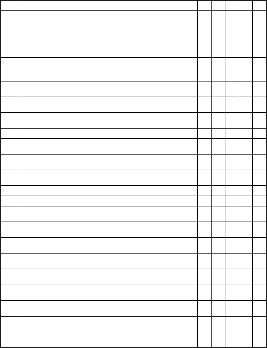 <p>Questionário Estruturado - Inventário Síndrome de</p><p>Burnout de Maslach (MBI), traduzido e adaptado para o</p><p>Português por RobaYo-Tamayo ( 1997)</p><p>1 –Nunca 2- Raramente 3- Algumas vezes 4 –</p><p>Freqüentemente 5 – Sempre</p><p>Nº AFIRMAÇÕES 1 2 3 4 5</p><p>1.</p><p>Eu me sinto emocionalmente exausto pelo meu</p><p>trabalho.</p><p>2.</p><p>Eu me sinto esgotado ao final de um dia de</p><p>trabalho</p><p>3.</p><p>Eu me sinto cansado quando me levanto de manhã</p><p>e tenho que encarar outro dia de trabalho.</p><p>4.</p><p>Eu posso entender facilmente o que sentem os</p><p>meus pacientes acerca das coisas que acontecem</p><p>no dia a dia.</p><p>5.</p><p>Eu sinto que eu trato alguns dos meus pacientes</p><p>como se fossem objetos.</p><p>6.</p><p>Trabalhar o dia inteiro é realmente um grande</p><p>esforço para mim.</p><p>7.</p><p>Eu trato de forma adequada os problemas dos</p><p>meus pacientes</p><p>8. Eu me sinto esgotado com meu trabalho.</p><p>9.</p><p>Eu sinto que estou influenciando positivamente a</p><p>vida de outras pessoas através do meu trabalho.</p><p>10.</p><p>Eu sinto que me tornei mais sensível com as</p><p>pessoas desde que comecei este trabalho.</p><p>11.</p><p>Eu sinto que este trabalho está me endurecendo</p><p>emocionalmente.</p><p>12. Eu me sinto muito cheio de energia.</p><p>13. Eu me sinto frustrado com meu trabalho.</p><p>14.</p><p>Eu sinto que estou trabalhado demais no meu</p><p>emprego.</p><p>15.</p><p>Eu não me importo realmente com o que acontece</p><p>com alguns dos meus pacientes.</p><p>16.</p><p>Trabalhar diretamente com pessoas me deixa</p><p>muito estressado.</p><p>17.</p><p>Eu posso criar facilmente um ambiente tranqüilo</p><p>com os meus pacientes.</p><p>18.</p><p>Eu me sinto estimulado depois de trabalhar lado a</p><p>lado com os meus pacientes.</p><p>19.</p><p>Eu tenho realizado muitas coisas importantes</p><p>neste trabalho.</p><p>20.</p><p>No meu trabalho, eu me sinto como se estivesse</p><p>no final do meu limite.</p><p>21.</p><p>No meu trabalho, eu lido com os problemas</p><p>emocionais com calma.</p><p>22.</p><p>Eu sinto que os pacientes me culpam por alguns</p><p>dos seus problemas.</p>