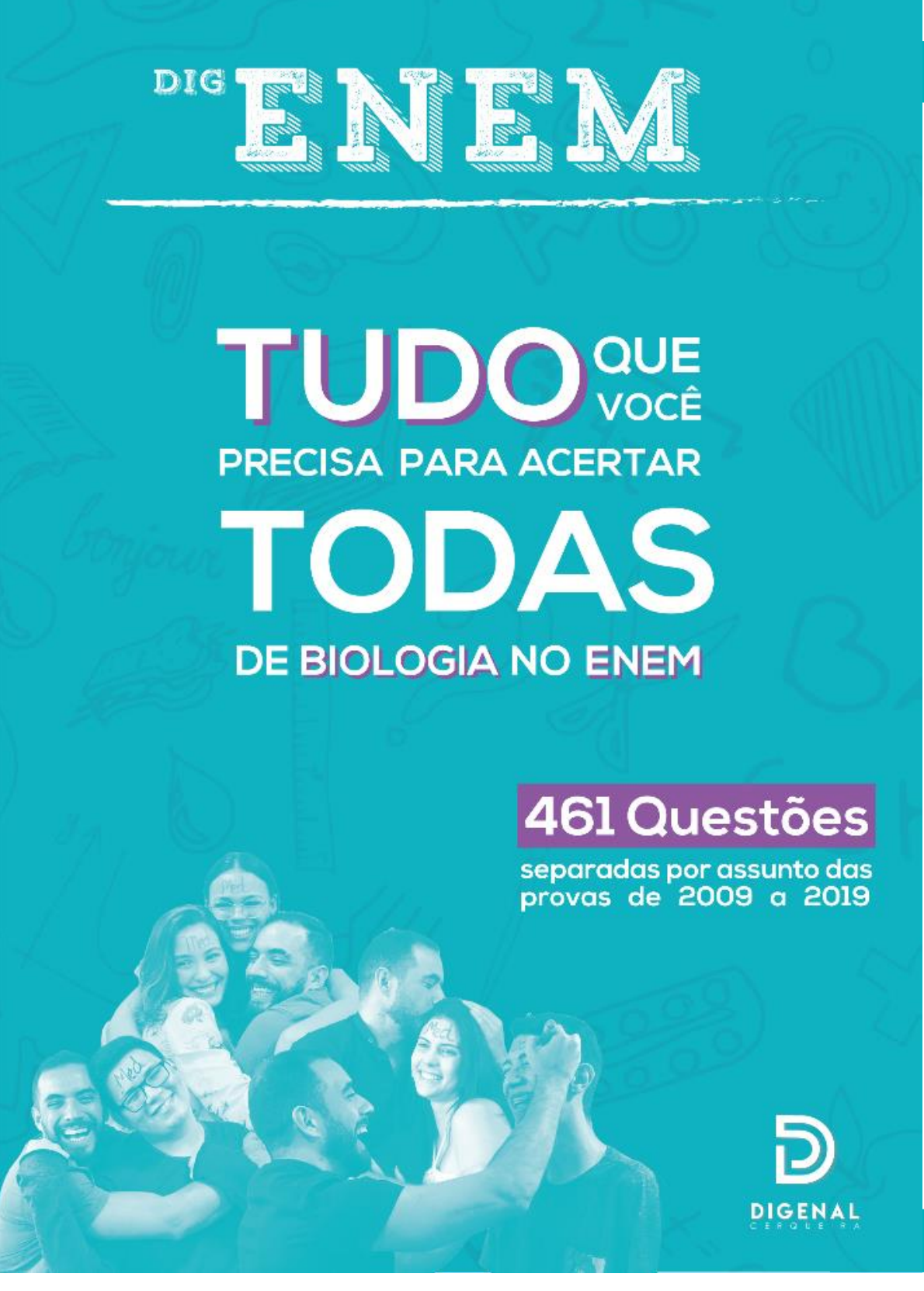 <p>ENEM 2009 – 2019</p><p>1</p><p>ENEM 2009 – 2019</p><p>2</p><p>São 461 questões do ENEM das edições de 2009 a 2019 separadas por assunto. Lembrem-se de</p><p>que a estatística da prova nos ajuda a deixar claro o que não podemos deixar de estudar. Contudo, ela não</p><p>é dona da verdade. Quando eu desejo passar num curso de ampla concorrência, não posso ser</p><p>surpreendido nem rezar para, no dia da prova, não cair o que eu não domino. Por isso, conteúdos pouco</p><p>cobrados não podem ser esquecidos. Afinal, você deseja passar e sabe que a pontuação entre quem passa</p><p>e quem fica entre os primeiros excedentes é muito pequena.</p><p>Dedico o DIGENEM a todos os alunos que não desistem. Que dormem tarde cansados de um dia</p><p>de estudo e acordam cedo sabendo que precisam trabalhar mais. A todos que já ouviram que não eram</p><p>capazes e continuam lutando comemorando toda evolução de sua trajetória. A todos que sonham e lutam</p><p>para realizar. Àqueles que continuam mesmo parecendo impossível. Dedico a todos vocês que lutam</p><p>diariamente independente do obstáculo. Ou seja, aos que fazem o impossível e não se deixam abater pelo</p><p>tempo escasso, pelo comentário negativo e pela falta de incentivo dos mais próximos.</p><p>Desejo-lhes que nunca faltem alegria nem coragem para concretizar qualquer objetivo. Espero que</p><p>essas questões, separadas por assunto, possam ajudá-los ainda mais. Quero que elas façam parte da</p><p>conquista de cada um que estuda e acredita que alcançará o seu objetivo final.</p><p>Organizem-se. Planejar os estudos é fundamental. Encarem os desafios de frente e com</p><p>maturidade. Não desviem do que não sabem. Não podemos desistir do que temos dificuldade e do que</p><p>dominamos menos. Valorizem cada conquista, separem um tempo para recompensa e para descanso. Para</p><p>aprender, é preciso motivação e empenho. Logo, temos que estar bem.</p><p>Por fim, agradeço a Profª. Soraya (Sol) que compartilhou seus arquivos com as questões no</p><p>formato “.doc”, ajudando muito a mim e a todos vocês. Sem ela, não teria conseguido, até porque ninguém</p><p>consegue vencer sozinho.</p><p>Galera, jogue duro! #Play nos estudos e #partiubrocarnoENEM.</p><p>Prof. Digenal</p><p>ENEM 2009 – 2019</p><p>3</p><p>Nascido em Aracaju, é um sergipano de alma baiana que ama o carnaval. É fissurado em trabalhar</p><p>em turmas de pré-vestibular, seu negócio é resultado. Ama quem tem garra e corre atrás de seus objetivos.</p><p>Não há tempo ruim, é só alegria.</p><p>Trabalha com Educação há mais de 18 anos. Professor dos principais cursos e colégios na Bahia</p><p>e em Sergipe. Já foi professor de cursinho em Maceió/AL e ministrou revisões em Recife/PE, Fortaleza/CE,</p><p>Feira de Santana/BA, Patos de Minas/MG e Boa Vista/RR.</p><p>Atua também como diretor pedagógico do Curso Uni+ em Aracaju (@cursouni).</p><p>Dentre suas principais caraterísticas estão a organização do quadro, didática fácil e objetiva e foco</p><p>no que as provas cobram do jeitinho que aparece.</p><p>@digebio</p><p>www.youtube.com/digenal</p><p>www.digenalcerqueira.com.br</p><p>http://www.youtube.com/digenal</p><p>http://www.digenalcerqueira.com.br/</p><p>ENEM 2009 – 2019</p><p>4</p><p>Estatística da Prova</p><p>2</p><p>0 3</p><p>0</p><p>2</p><p>0</p><p>1</p><p>8</p><p>2 5</p><p>1</p><p>9</p><p>1</p><p>4</p><p>5</p><p>0</p><p>3</p><p>1</p><p>1</p><p>0 1</p><p>2 2</p><p>4</p><p>2</p><p>4</p><p>1</p><p>8</p><p>2</p><p>QUANTIDADE DE QUESTÕES POR ASSUNTO</p><p>50</p><p>20</p><p>40</p><p>50</p><p>31</p><p>22 24 24</p><p>182</p><p>0</p><p>20</p><p>40</p><p>60</p><p>80</p><p>100</p><p>120</p><p>140</p><p>160</p><p>180</p><p>200</p><p>QUESTÕES POR ASSUNTOS</p><p>ENEM 2009 – 2019</p><p>5</p><p>Bioquímica 06</p><p>Citologia 11</p><p>Metabolismo Energético 18</p><p>Histologia Animal 23</p><p>Taxonomia 28</p><p>Vírus, Monera, Protista e Fungi (caracteres gerais) 29</p><p>Botânica 31</p><p>Zoologia 35</p><p>Saúde e Parasitologia 38</p><p>Fisiologia Humana 51</p><p>Expressão Gênica e Transgenia 60</p><p>DNA finger print, clonagem, células tronco e terapia gênica 62</p><p>Genética Clássica 65</p><p>Evolução e Origem da Vida 71</p><p>Ecologia 78</p><p>Gabaritos 127</p><p>ENEM 2009 – 2019</p><p>6</p><p>BIOQUÍMICA</p><p>01. (ENEM 2009 cancelado) A água apresenta</p><p>propriedades físico-químicas que a coloca</p><p>em posição de destaque como substancial</p><p>essencial à vida. Dentre essas, destacam-se</p><p>as propriedades térmicas biologicamente</p><p>muito importantes, por exemplo, o elevado</p><p>valor de calor latente de vaporização. Esse</p><p>calor latente refere-se à quantidade de calor</p><p>que deve ser adicionada a um líquido em seu</p><p>ponto de ebulição, por unidade de massa,</p><p>para convertê-lo em vapor na mesma</p><p>temperatura, sue no caso da água e igual a</p><p>540 calorias por grama.</p><p>A propriedade físico-química mencionada no texto</p><p>confere à água a capacidade de</p><p>A) servir como doador de elétrons no processo de</p><p>fotossíntese.</p><p>B) funcionar como regulador térmico para os</p><p>organismos vivos.</p><p>C) agir como solvente universal nos tecidos animais</p><p>e vegetais.</p><p>D) transportar os tons de ferro e magnésio nos</p><p>tecidos vegetais.</p><p>E) funcionar como mantenedora do metabolismo nos</p><p>organismos vivos.</p><p>02. (ENEM 2014) Na década de 1940, na Região</p><p>Centro-Oeste, produtores rurais, cujos bois,</p><p>porcos, aves e cabras estavam morrendo por</p><p>uma peste conhecida, fizeram uma</p><p>promessa, que consistiu em não comer</p><p>carne e derivados até que a peste fosse</p><p>debelada. Assim, durante três meses, arroz,</p><p>feijão, verduras e legumes formaram o prato</p><p>principal desses produtores.</p><p>Para suprir o déficit nutricional a que os produtores</p><p>rurais se submeteram durante o período d