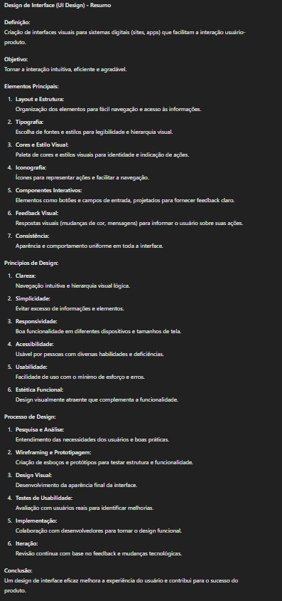 <p>Design de Interface (UI Design) Resumo Definição: Criação de interfaces visuais para sistemas digitais (sites, apps) que facilitam a interação usuário- produto. interação intuitiva, eficiente agradável. Elementos Principais: 1. Layout Estrutura: Organização dos elementos para navegação acesso informações. 2 de fontes estilos para legibilidade hierarquia 3. Cores Visual: Paleta de cores estilos visuais para indicação de ações. 4. Iconografia: para representar ações facilitar a navegação. 5. Componentes Interativos: Elementos como botões campos de entrada, projetados para fornecer feedback Feedback Respostas visuais (mudanças de mensagens) para informar usuário sobre ações. 7. Consistência: Aparência comportamento uniforme em toda a interface. Principios de Design 1. Clareza: Navegação intuitiva hierarquia visual 2 Simplicidade: Evitar excesso de informações 3. Responsividade: Boa funcionalidade em diferentes dispositivos tamanhos de tela 4. Acessibilidade: Usável por com diversas habilidades Usabilidade: Facilidade de uso com minimo de 6. Estética Design visualmente atraente que a funcionalidade Processo de Design: 1. Pesquisa e Entendimento das necessidades dos usuários c boas Wireframing c Prototipagem: Criação de esbaças protótipos para testar estrutura 3. Design Visual: Desenvolvimento da aparência final da interface. Testes de Usabilidade: Avaliação com reais para identificar melhorias. 5. Implementação: Colaboração com desenvolvedores para tomar design funcional 6. Iteração: Revisão continua com base no feedback mudanças Conclusão: Um design de interface eficaz melhora a experiência do contribui para sucesso do produto.</p>