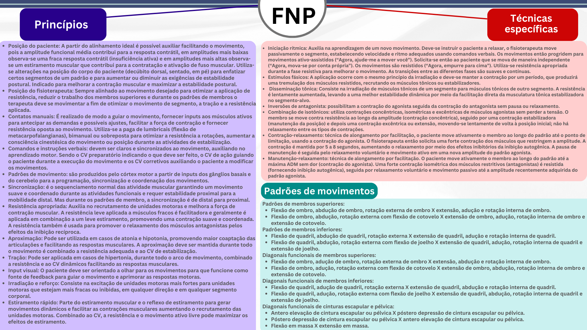 <p>FNP Técnicas Princípios específicas Posição do paciente: A partir do alinhamento ideal é possível auxiliar facilitando movimento, Iniciação Auxilia na aprendizagem de um novo movimento. Deve-se instruir paciente a relaxar, fisioterapeuta move pois a amplitude funcional média contribui para a resposta contrátil, em amplitudes mais baixas passivamente segmento, estabelecendo velocidade e ritmo adequados usando comandos verbais. Os movimentos então progridem para observa-se uma fraca resposta contrátil (insuficiência ativa) e em amplitudes mais altas observa- movimentos ativo-assistidos ("Agora, ajude-me a você"). Solicita-se então ao paciente que se mova de maneira independente se um estiramento muscular que contribui para a contratação e ativação de fuso muscular. Utiliza- ("Agora, mova-se por conta própria"). Os movimentos são resistidos ("Agora, empurre para cima"). Utiliza-se resistência apropriada se alterações na posição do corpo do paciente (decúbito dorsal, sentado, em pé) para enfatizar durante a fase resistiva para melhorar movimento. As transições entre as diferentes fases são suaves e contínuas. certos segmentos de um padrão e para aumentar ou diminuir as exigências de estabilidade Estímulos fásicos: A aplicação ocorre com mesmo princípio da irradiação e deve-se manter a contração por um período, que produzirá postural. Indicado para melhorar a contração muscular e maximizar a estabilidade postural. uma tremulação dos músculos resistidos, recrutando os músculos tônicos ou estabilizadores. Posição do fisioterapeuta: Sempre alinhado ao movimento desejado para otimizar a aplicação de Disseminação tônica: Consiste na irradiação de músculos tônicos de um segmento para músculos tônicos de outro segmento. A resistência resistência, reduzir trabalho dos membros superiores e durante os padrões de membros o é lentamente aumentada, levando a uma melhor estabilidade dinâmica por meio da facilitação direta da musculatura tônica estabilizadora no segmento-alvo. terapeuta deve se movimentar a fim de otimizar movimento de segmento, a tração e a resistência Inversões de antagonista: possibilitam a contração do agonista seguida da contração do antagonista sem pausa ou relaxamento. aplicada. Combinação de isotônicos: utiliza contrações concêntricas, isométricas e excêntricas de músculos agonistas sem perder a tensão. o Contatos manuais: É realizado de modo a guiar movimento, fornecer inputs aos músculos ativos membro se move contra resistência ao longo da amplitude (contração concêntrica), seguido por uma contração estabilizadora para antecipar as demandas e possíveis ajustes, facilitar a força de contração e fornecer (manutenção da posição) e depois uma contração excêntrica ou extensão, movendo-se lentamente de volta à posição inicial; não há resistência oposta ao movimento. Utiliza-se a paga de lumbricais (flexão de relaxamento entre os tipos de contrações. metacarpofalangianas), bimanual ou sobreposta para otimizar a resistência a rotações, aumentar a técnica de alongamento por facilitação, paciente move ativamente membro ao longo do padrão até o ponto de consciência cinestésica do movimento ou posição durante as atividades de estabilização. limitação, usando a contração do agonista. o fisioterapeuta então solicita uma forte contração dos músculos que restringem a amplitude. A Comandos e instruções verbais: devem ser claros e sincronizados ao movimento, auxiliando no contração é mantida por 5 a 8 segundos, aumentando relaxamento por meio dos efeitos inibitórios da inibição autogênica. A pausa de aprendizado motor. Sendo CV preparatório indicando o que deve ser feito, o CV de ação guiando manutenção é seguida pelo relaxamento voluntário e movimento ativo em uma nova amplitude do padrão agonista. paciente durante a execução do movimento e os CV corretivos auxiliando o paciente a modificar técnica de alongamento por facilitação. o paciente move ativamente membro ao longo do padrão até a máxima ADM sem dor (contração do agonista). Uma forte contração isométrica dos músculos restritivos (antagonistas) é resistida os movimentos. (fornecendo autogênica), seguida por relaxamento voluntário e movimento passivo até a amplitude recentemente adquirida do Padrões de movimento: são produzidos pelo córtex motor a partir de inputs dos gânglios basais e padrão agonista. do cerebelo para a programação, sincronização e coordenação dos movimentos. Sincronização: é o sequenciamento normal das atividade muscular garantindo um movimento suave e coordenado durante as atividades funcionais e requer estabilidade proximal para a Padrões de movimentos mobilidade distal. Mas durante os padrões de membro, a sincronização é de distal para proximal. Resistência apropriada: Auxilia no recrutamento de unidades motoras e melhora a força de Padrões de membros superiores: contração muscular. A resistência leve aplicada a músculos fracos é facilitadora e geralmente é Flexão de ombro, abdução de ombro, rotação externa de ombro X extensão, adução e rotação interna de ombro. aplicada em combinação a um leve estiramento, promovendo uma contração suave e coordenada. Flexão de ombro, abdução, rotação externa com flexão de cotovelo X extensão de ombro, adução, rotação interna de ombro e A resistência também é usada para promover relaxamento dos músculos antagonistas pelos extensão de cotovelo. efeitos da inibição recíproca. Padrões de membros inferiores: Aproximação: Pode ser utilizada em casos de atonia e hipotonia, promovendo maior coaptação das Flexão de quadril, abdução de quadril, rotação externa X extensão de quadril, adução e rotação interna de quadril. articulações e facilitando as respostas musculares. A aproximação deve ser mantida durante todo Flexão de quadril, abduç