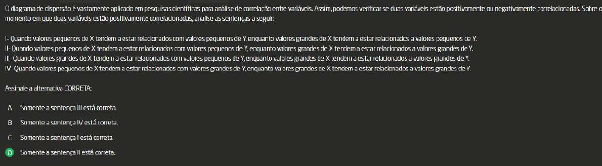 <p>0 diagrama de dispersão é vastamente aplicado em pesquisas científicas para análise de correlação entre variáveis. Assim, podemos verificar se duas variáveis estão positivamente ou negativamente correlacionadas Sobre momento em que duas variáveis estão positivamente correlacionadas, analise as sentenças a seguir Quando valores pequenos de tendem a estar relacionados com valores pequenos de Y, enquanto valores grandes de a estar relacionados a valores pequenos de Y II- Quando valores pequenos de X tendem a estar relacionados com valores pequenos de Y, enquanto valores grandes de tendem a estar relacionados a valores grandes de Y. III- Quando valores grandes de tendem a estar relacionados com valores pequenos de Y, enquanto valores grandes de tendem a estar relacionados a valores grandes de Y. IV Quando valores peq uenos de tendem a estar relacionados com valores grandes de enquanto valores grandes de X tendem a estar relacionados a valores grandes de Y Assinale a alternativa CORRETA A Somente a sentença III está correta B Somente a sentença IV está correta. C Somente a sentença I está correta D Somente a sentença está correta.</p>
