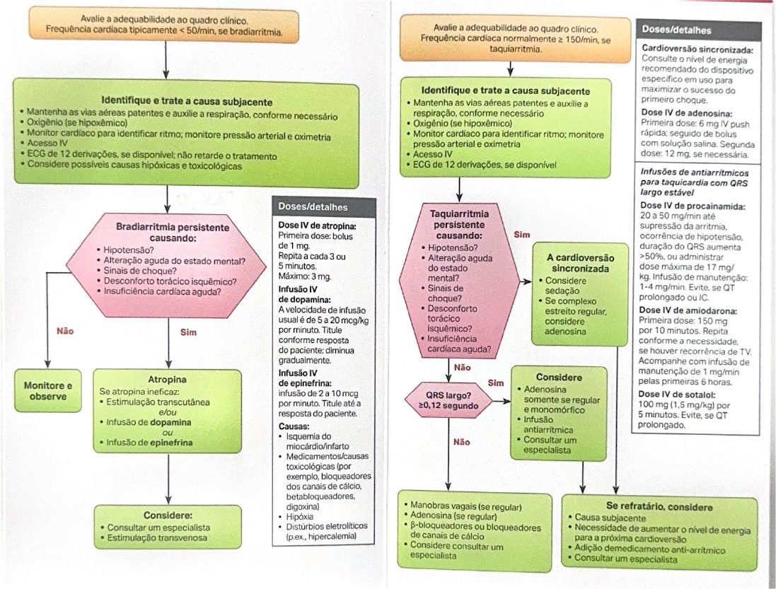 <p>Avalie a adequabilidade ao quadro Frequência cardiaca tipicamente < 50/min, se Avalie a adequabilidade ao quadro Doses/detalhes Frequência normalmente 150/min, se Cardioversão sincronizada: Consulte nível de energia recomendado do dispositivo específico em uso para Identifique e trate a causa subjacente maximizar o sucesso do Identifique e trate a causa subjacente Mantenha as vias aéreas patentes e auxilie a primeiro choque. Mantenha as vias aéreas patentes e auxilie a respiração, conforme necessário respiração, conforme necessário Dose IV de adenosina: Oxigênio (se hipoxêmico) Oxigênio (se hipoxêmico) Primeira dose: 6 mg IV push Monitor cardiaco para identificar ritmo; monitore pressão arterial e oximetria Monitor para identificar ritmo; monitore seguido de bolus Acesso IV pressão arterial e oximetria com solução salina. Segunda ECG de 12 derivações, se disponível; não retarde o tratamento Acesso IV dose: 12 mg, se Considere possíveis causas hipóxicas e toxicológicas ECG de 12 derivações, se disponível Infusões de para taquicardia com QRS largo estável Doses/detalhes Dose IV de procainamida: Taquiarritmia 20 a 50 mg/min até Bradiarritmia persistente Dose IV de atropina: persistente supressão da causando: Primeira dose: bolus causando: Sim ocorrência de Hipotensão? de mg. Hipotensão? duração do QRS aumenta Repita a cada 3 ou Alteração aguda A cardioversão ou administrar Alteração aguda do estado mental? 5 Sinais de choque? do estado sincronizada dose máxima de 17 mg/ Máximo: 3 mental? Considere kg. Infusão de manutenção: Desconforto torácico isquêmico? Insuficiência cardíaca aguda? Infusão IV Sinais de sedação 1-4 mg/min. Evite, se QT de dopamina: choque? Se complexo prolongado ou IC. A velocidade de infusão Desconforto estreito regular, Dose IV de amiodarona: usual é de 5 a 20 mcg/kg torácico considere Primeira dose: 150 mg Não Sim por minuto. Titule isquêmico? adenosina por 10 minutos. Repita conforme resposta Insuficiência conforme a do paciente: diminua aguda? se houver recorrência de gradualmente. Acompanhe com infusão de Não Infusão IV manutenção de 1 mg/min Atropina Considere Monitore e de epinefrina: Sim pelas primeiras 6 horas. Se atropina ineficaz: Adenosina observe infusão de 2 a 10 mcg QRS largo? Dose IV de sotalol: Estimulação transcutânea por minuto. Titule até a somente se regular segundo 100 mg (1,5 mg/kg) por e/ou e monomórfico resposta do paciente. 5 minutos. Evite, se QT Infusão Infusão de dopamina Causas: prolongado. antiarrítmica ou Isquemia do Não Consultar um Infusão de epinefrina miocárdio/infarto especialista Medicamentos/causas toxicológicas (por exemplo, bloqueadores dos canais de cálcio, betabloqueadores, digoxina) Manobras vagais (se regular) Se refratário, considere Considere: Hipóxia Adenosina (se regular) Causa subjacente Consultar um especialista Distúrbios ou bloqueadores Necessidade de aumentar o nível de energia Estimulação transvenosa (p.ex., hipercalemia) de canais de cálcio para a próxima cardioversão Considere consultar um Adição demedicamento anti-arritmico especialista Consultar um especialista</p>