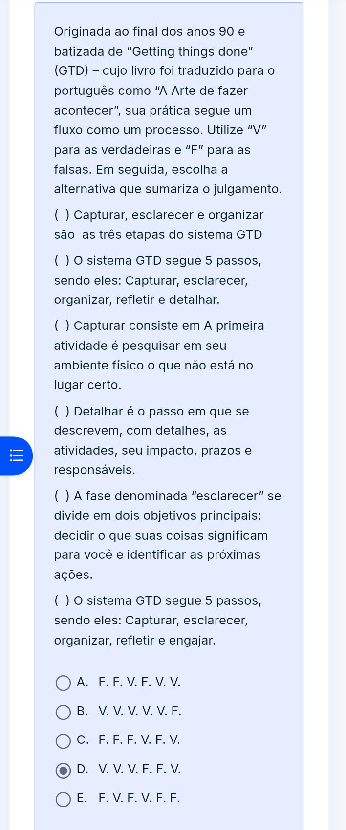 <p>Originada ao final dos anos 90 e batizada de "Getting things done" (GTD) - cujo livro foi traduzido para o português como "A Arte de fazer acontecer", sua prática segue um fluxo como um processo. Utilize "V" para as verdadeiras e para as falsas. Em seguida, escolha a alternativa que sumariza o julgamento. Capturar, esclarecer e organizar são as três etapas do sistema GTD sistema GTD segue 5 passos, sendo eles: Capturar, esclarecer, organizar, refletir e detalhar. Capturar consiste em A primeira atividade é pesquisar em seu ambiente físico o que não está no lugar certo. Detalhar é o passo em que se descrevem, com detalhes, as atividades, seu impacto, prazos e responsáveis. A fase denominada "esclarecer" se divide em dois objetivos principais: decidir o que suas coisas significam para você e identificar as próximas ações. sistema GTD segue 5 passos, sendo eles: Capturar, esclarecer, organizar, refletir e engajar. A. F. F. V. F. V. V. B. V. V. V. V. V. F. C. F. F. F. V. F. V. D. V. V. V. F. F. V. E. F. V. F. V. F. F.</p>