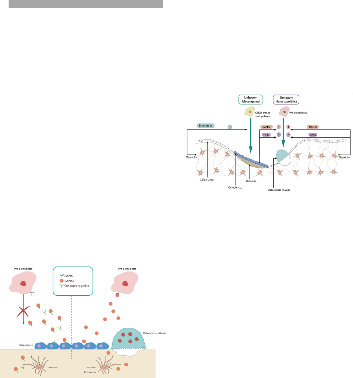 <p>APG S4P2: “Fratura por Osteoporose: Como prevenir e tratar?”</p><p>OSTEOPOROSE</p><p>.</p><p>.</p><p>Objetivos:</p><p>1- Revisar o metabolismo ósseo (Ca², K);</p><p>2- Estudar a etiologia, fatores de risco, fisiopatologia, manifestações clínicas, diagnóstico e tratamento da Osteoporose;</p><p>3- Compreender as medidas profiláticas da Osteoporose.</p><p>METABOLISMO ÓSSEO</p><p>→ O tecido ósseo constitui-se de uma variedade de tecido conjuntivo especializado, cuja matriz é formada por uma substância extracelular, a qual se apresenta calcificada, envolvendo as células que a secretam.</p><p>→ A matriz óssea pode ser dividida em orgânica e inorgânica.</p><p>→ A orgânica é a menor porcentagem da sua composição (em torno de 20%) e faz referência ao colágeno do tipo I, proteoglicanos e glicoproteínas, que conferem flexibilidade ao tecido ósseo.</p><p>→ Já o componente inorgânico é responsável por suportar força de compressão, representa 70% do tecido</p><p>ósseo e é composto por conteúdo mineral, cálcio, fósforo, hidroxiapatita.</p><p>→ A mineralização óssea é o processo nos quais minerais, como a hidroxiapatita, se depositam na matriz extracelular.</p><p>→ O tecido celular ósseo é composto por osteoclastos, osteoblastos e osteócitos.</p><p>→Os osteoclastos são de origem hematopoiética e responsáveis pela reabsorção óssea.</p><p>→ Os osteoblastos são de origem mesenquimal e atuam</p><p>na formação óssea.</p><p>→ Os osteócitos são peça fundamental e orquestram todo o processo de remodelamento ósseo.</p><p>→ Os osteoblastos e os osteócitos expressam e secretam duas proteínas:</p><p>· Ligante do RANK (RANKL) – o pré-osteoclasto possui um receptor chamado RANK (do inglês, receptor activator of nuclear fator kappa-B) e é a ligação do RANKL com o RANK que estimula o osteoclasto a diferenciar-se e a começar o processo de reabsorção óssea.</p><p>· Osteoprotegerina (OPG) – quando a OPG se liga ao RANKL, esse não consegue mais ligar-se ao RANK e ativar o pré-osteoclasto. Portanto, “a osteoprotegerina protege o osso”.</p><p>→ O osteócito produz a esclerostina, uma substância que prejudica a diferenciação dos osteoblastos. Essa produção ocorre de maneira tônica (contínua) para manter a formação óssea sob controle, mas, quando forças mecânicas são aplicadas sobre o osso, os osteócitos param de secretar a esclerostina e a formação óssea fica desinibida.</p><p>→ Essa é a principal razão pela qual a atividade física é considerada um fator de proteção contra a perda de massa óssea; pois o exercício gera carga sobre o osso e isso reduz a produção de esclerostina.</p><p>CÁLCIO NO METABOLISMO ÓSSEO:</p><p>→ O PTH regula o cálcio sérico através do osso, sendo que o osso é uma reserva do cálcio, então a gente tem o paratormônio tirando o cálcio do osso e aumentando a absorção intestinal e aumentando a reabsorção renal.</p><p>→ É importante lembrar da mulher na menopausa pode utilizar o fármaco tiazídico, pois ele também aumenta a reabsorção de cálcio. Em relação ao fosfato é um componente do osso, participa da membrana fosfolipídica, componente do ATP por meio do fosfato.</p><p>→ O mecanismo do fosfato é bem similar do cálcio onde eu aumento a reabsorção de cálcio, eu necessito diminuir a reabsorção do fosfato ou aumentar a sua eliminação, pois quando eu aumento o nível de cálcio é necessário diminui o nível de fosfato, e os dois juntam formam o cristal.</p><p>PARATORMÔNIO, CALCITRIOL E CALCITONINA:</p><p>→ Três hormônios regulam o movimento de Ca² entre osso, rim e intestino: hormônio da paratireoide, calcitriol (vitamina D3) e calcitonina.</p><p>→ O hormônio da paratireoide e o calcitriol são os mais importantes em seres humanos adultos.</p><p>1. O PTH mobiliza cálcio dos ossos;</p><p>2. O PTH aumenta a reabsorção renal de cálcio;</p><p>3. O PTH aumenta indiretamente a absorção intestinal de cálcio.</p><p>→ A vitamina D é modificada em dois passos – primeiro no fígado, e então nos rins – para formar a vitamina D3 ou calcitriol.</p><p>→ O calcitriol é o principal hormônio responsável por aumentar</p><p>a absorção de Ca² a partir do intestino delgado. Além disso, o calcitriol facilita a reabsorção renal de Ca² e ajuda a mobilizar Ca² para fora do osso.</p><p>→ A produção de calcitriol é regulada no rim por ação do</p><p>PTH. Concentrações plasmáticas diminuídas de Ca² estimulam a secreção de PTH, que estimula a síntese de calcitriol.</p><p>→ O terceiro hormônio envolvido no metabolismo de cálcio é a calcitonina, um peptídeo produzido pelas células C da tireoide. As suas ações são opostas às do hormônio da paratireoide.</p><p>→ A calcitonina é liberada quando as concentrações</p><p>plasmáticas de Ca² aumentam.</p><p>→ A homeostasia do fosfato é intimamente relacionada à homeostasia do cálcio. O fosfato é o segundo ingrediente principal da hidroxiapatita no osso, Ca10(PO4)6(OH)2, e grande parte do fosfato presente no corpo humano é encontrado no osso.</p><p>→ O fosfato é absorvido no intestino, filtrado e reabsorvido nos rins e distribuído entre o osso, o LEC e os compartimentos intracelulares.</p><p>→ A vitamina D3 facilita a absorção intestinal de fosfato. → A excreção renal é afetada tanto pelo PTH (que promove a excreção de fosfato) como pela vitamina D3 (que promove a reabsorção de fosfato).</p><p>OSTEOPOROSE</p><p>→ A osteoporose é definida como uma redução na resistência do osso que resulta em maior risco de fraturas. A perda de tecido ósseo causa deterioração na microarquitetura esquelética, e, portanto, o processo de perda óssea causa um prejuízo maior à resistência óssea do que pode ser estimada pela simples medida da “densidade” óssea.</p><p>→ A Organização Mundial da Saúde (OMS) oferece uma definição opera