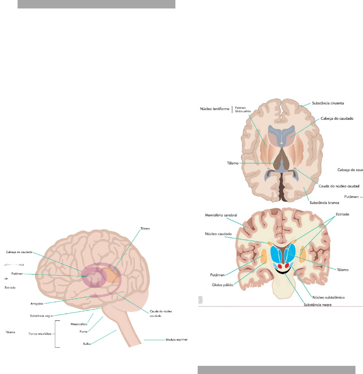 <p>APG S7P1: “Distúrbios do Movimento”</p><p>parkinson</p><p>.</p><p>.</p><p>Objetivos:</p><p>1- Revisar a morfofisiologia dos núcleos da base.</p><p>2- Compreender as síndromes hipocinéticas e hipercinéticas e os distúrbios extrapiramidais.</p><p>3- Estudar a etiopatogenia, epidemiologia, fatores de risco, manifestações clínicas, diagnóstico e tratamento da doença de Alzheimer.</p><p>MORFOFISIOLOGIA DOS NÚCLEOS DA BASE</p><p>→ Os núcleos (ou gânglios) da base são estruturas formadas por corpos celulares de neurônios que fazem conexão com o córtex motor e os tálamos para ajudar no controle dos movimentos.</p><p>→Eles ficam situados em uma região profunda dos hemisférios cerebrais.</p><p>→ A posição estratégica dos núcleos da base é bem no trajeto das fibras motoras entre o córtex motor (giro pré-central) e o tronco encefálico, formando um corredor em volta da cápsula interna, que é a estrutura por onde passam essas fibras.</p><p>→ A via motora que parte do córtex do giro pré-frontal é chamada de trato piramidal. Os núcleos da base, por sua vez, compõem o sistema extrapiramidal.</p><p>→ Os principais componentes do núcleo da base são o núcleo caudado, o putâmen, os globos pálidos interno e externo, o núcleo subtalâmico e a substância negra. → O putâmen relaciona-se com dois desses núcleos, gerando estruturas cujos nomes são importantes.</p><p>→ A união do caudado com o putâmen recebe o nome de estriado.</p><p>→ O putâmen e os globos pálidos formam uma estrutura em forma de lente, conhecida como núcleo lentiforme.</p><p>→ De todas essas estruturas, a única que não está localizada no que chamamos de cérebro (hemisférios e diencéfalo) é a substância negra. Ela situa-se no mesencéfalo, a estrutura mais rostral do tronco encefálico. Seu nome é decorrente do aspecto característico de uma parte de seus neurônios, que assume uma coloração acastanhada em razão dos seus grânulos de neuromelanina.</p><p>→ Os componentes dos núcleos da base fazem conexões entre si e com outras estruturas encefálicas, recebendo aferência de áreas corticais responsáveis pela motricidade e enviando eferências para o tálamo, que, por sua vez, modula as mesmas áreas motoras corticais.</p><p>→ Esse circuito recorrente é capaz de ajustar o movimento ou certas posturas em tempo real.</p><p>→ Vários neurotransmissores participam dessas vias. Entre eles, o glutamato, o GABA e a dopamina. A dopamina é a que tem mais relevância clínica.</p><p>SÍNDROMES HIPERCINÉTICAS</p><p>→ Os distúrbios do movimento formam um grupo bastante heterogêneo de doenças caracterizadas pela presença de movimentos involuntários anormais.</p><p>→ Eles são causados, principalmente, mas não de maneira exclusiva, por lesões das estruturas dos núcleos da base.</p><p>TREMOR</p><p>→ O tremor é o distúrbio do movimento mais comum. Ele é decorrente de uma oscilação rítmica e sucessiva de agonistas e antagonistas.</p><p>→ Existem diferentes tipos de tremor. Para diferenciá-los, necessariamente, devemos caracterizá-los em relação aos seguintes aspectos:</p><p>· frequência;</p><p>· amplitude;</p><p>· situação (repouso, postura, movimento ou intenção);</p><p>· localização (cabeça, membros, voz etc.);</p><p>· simetria;</p><p>· sintomas associados.</p><p>→ O tremor na doença de Parkinson apresenta as seguintes características:</p><p>· mais intenso em repouso;</p><p>· assimétrico;</p><p>· elevada amplitude;</p><p>· baixa frequência (4-7 Hz);</p><p>· melhora em postura ou ao movimento;</p><p>· assemelha-se com o ato de contar moedas ou enrolar pílulas;</p><p>· tem caráter reemergente: surge após alguns segundos quando o indivíduo assume determinada postura;</p><p>· associado a outros sinais e sintomas que discutiremos mais adiante.</p><p>DISTONIA</p><p>→ Distonia é o resultado da contração simultânea de um músculo agonista e seu antagonista, produzindo uma postura anormal do membro, movimentos lentos de torção e até um quadro de tremor (tremor distônico).</p><p>→ Existem vários padrões de distonia, alguns com manifestações graves, generalizadas. A causa mais comum é a cãimbra do escrivão, um tipo de distonia tarefa específica, que ocorre apenas durante o ato de escrever.</p><p>→ Pode ser encontrada em algumas doenças genéticas, sendo a principal delas a doença de Wilson.</p><p>COREIA</p><p>→ Coreia vem do grego (Choreia) e tem a mesma origem da palavra coreografia. É um movimento involuntário de início abrupto, errático, aleatório, não esterotipado, migratório, que pode passar subitamente de uma parte do corpo para outra, em sequência imprevisível e sem propósito.</p><p>→ Em crianças, a coreia de Sydenham é a causa quase que exclusiva de coreia, ocorrendo após os 8 anos de idade na grande maioria dos casos. É a principal manifestação neurológica da febre reumática aguda.</p><p>→ O quadro costuma surgir entre 4 e 8 semanas após uma faringite estreptocócica.</p><p>→ Em adultos, as principais causas de coreia são genéticas, destacando-se a neuroacantocitose e a doença de Huntington.</p><p>→ Entre as coreias adquiridas, podemos encontrar as seguintes causas:</p><p>· vasculares (AVC i e AVC h são as causas mais comuns de coreia em pacientes hospitalizados);</p><p>· autoimunes (causa mais comum em adultos): é o distúrbio do movimento mais comum em pacientes com lúpus eritematoso sistêmico, afetando cerca de 5% dos casos;</p><p>· metabólicas: hiperglicemia não cetótica é uma das causas adquiridas mais comuns de hemibalismo/ hemicoreia em adultos;</p><p>· infecciosas;</p><p>· tóxicas;</p><p>· medicamentosas (a causa mais comum de coreia adquirida em adultos é a discinesia induzida por levodopa);</p><p>· coreia senil;</p><p>· paraneoplásica: manifestação muito rara, podendo ser encontrada em pacientes com câncer de pulmão de pe