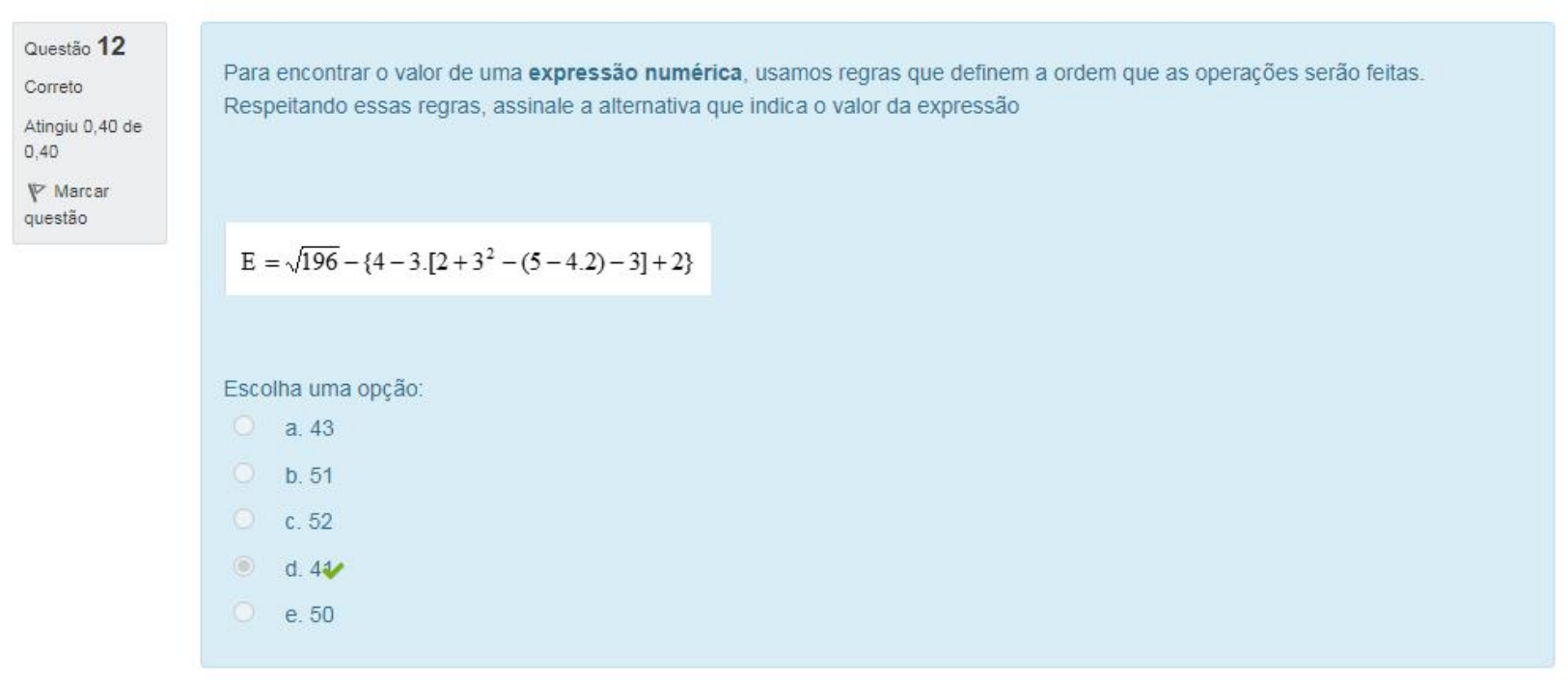 <p>Questão 12 Para encontrar o valor de uma expressão numérica, usamos regras que definem a ordem que as operações serão Correto Respeitando essas regras, assinale a alternativa que indica o valor da expressão Atingiu 0,40 de 0,40 Marcar questão E = - 2 - Escolha uma opção: a. 43 b. 51 52 d. e. 50</p>