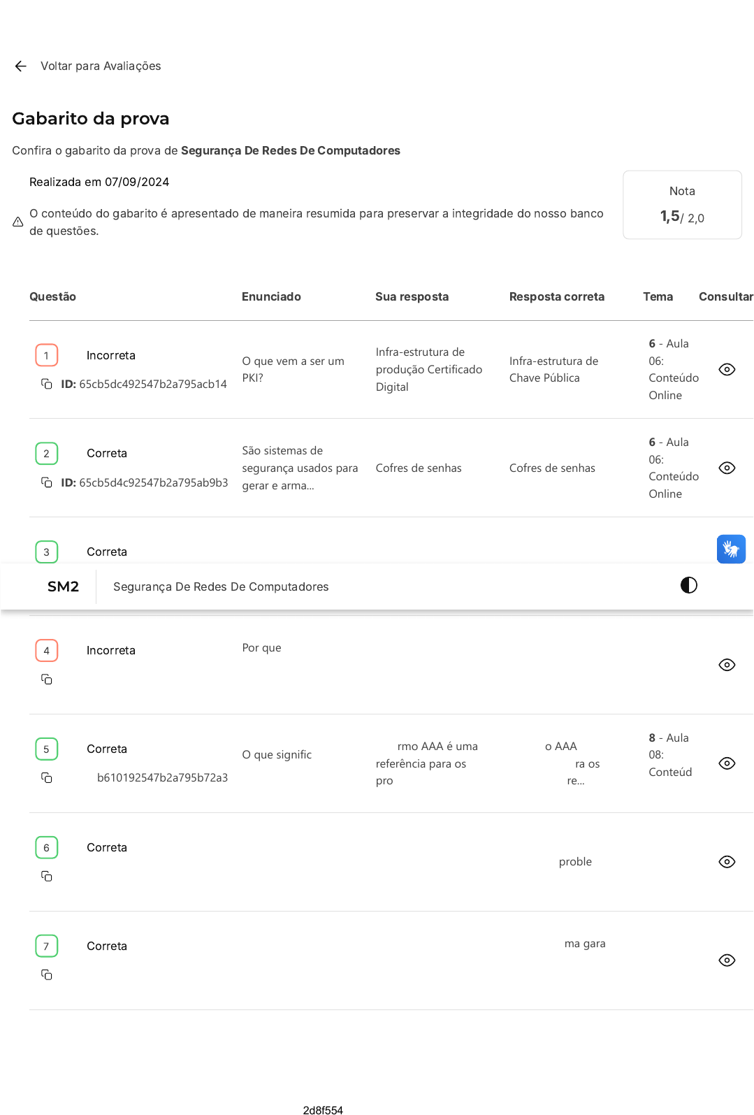 <p>Voltar para Avaliações</p><p>Gabarito da prova</p><p>Confira o gabarito da prova de Segurança De Redes De Computadores</p><p>Realizada em 07/09/2024</p><p>O conteúdo do gabarito é apresentado de maneira resumida para preservar a integridade do nosso banco</p><p>de questões.</p><p>Nota</p><p>1,5/ 2,0</p><p>Questão Enunciado Sua resposta Resposta correta Tema Consultar</p><p>Incorreta</p><p>ID: 65cb5dc492547b2a795acb14</p><p>O que vem a ser um</p><p>PKI?</p><p>Infra-estrutura de</p><p>produção Certificado</p><p>Digital</p><p>Infra-estrutura de</p><p>Chave Pública</p><p>6 - Aula</p><p>06:</p><p>Conteúdo</p><p>Online</p><p>Correta</p><p>ID: 65cb5d4c92547b2a795ab9b3</p><p>São sistemas de</p><p>segurança usados para</p><p>gerar e arma...</p><p>Cofres de senhas Cofres de senhas</p><p>6 - Aula</p><p>06:</p><p>Conteúdo</p><p>Online</p><p>Correta</p><p>ID: 65cb60fe92547b2a795b7022</p><p>Através do uso do</p><p>espaço livre como o</p><p>meio para o ...</p><p>Os transceptores de</p><p>rádio</p><p>Os transceptores de</p><p>rádio</p><p>7 - Aula</p><p>07:</p><p>Conteúdo</p><p>Online</p><p>Incorreta</p><p>ID: 65cb52a892547b2a7958e888</p><p>Por que uma VPN</p><p>Grátis pode ser</p><p>insegura?</p><p>Tem acesso ao seu</p><p>endereço IP</p><p>Vê tudo o que passar</p><p>pela suas rede privada</p><p>7 - Aula</p><p>07:</p><p>Conteúdo</p><p>Online</p><p>Correta</p><p>ID: 65cb610192547b2a795b72a3</p><p>O que significa o termo</p><p>AAA?</p><p>O termo AAA é uma</p><p>referência para os</p><p>protocolos re...</p><p>O termo AAA é uma</p><p>referência para os</p><p>protocolos re...</p><p>8 - Aula</p><p>08:</p><p>Conteúdo</p><p>Online</p><p>Correta</p><p>ID: 65cb4aff92547b2a79560909</p><p>Qual das alternativas</p><p>não está correta, no</p><p>context...</p><p>Em geral, uma Cloud</p><p>tem mais problemas de</p><p>seguranç...</p><p>Em geral, uma Cloud</p><p>tem mais problemas de</p><p>seguranç...</p><p>8 - Aula</p><p>08:</p><p>Conteúdo</p><p>Online</p><p>Correta</p><p>ID: 65cb513792547b2a79581325</p><p>Qual a definição do</p><p>critério de</p><p>Disponibilidade? ...</p><p>Estrutura uma garantia</p><p>de que a informação</p><p>poderá ...</p><p>Estrutura uma garantia</p><p>de que a informação</p><p>poderá ...</p><p>9 - Aula</p><p>09:</p><p>Conteúdo</p><p>Online</p><p>1</p><p>2</p><p>3</p><p>4</p><p>5</p><p>6</p><p>7</p><p>SM2 Segurança De Redes De Computadores</p><p>07/09/2024, 18:06 estacio.saladeavaliacoes.com.br/prova/66dcbb5c9770a2d8f554f7a7/gabarito/</p><p>https://estacio.saladeavaliacoes.com.br/prova/66dcbb5c9770a2d8f554f7a7/gabarito/ 1/2</p><p>https://estacio.saladeavaliacoes.com.br/avaliacoes/</p><p>Correta</p><p>ID: 65cb617d92547b2a795b8de4</p><p>Quais são as</p><p>propriedades básica,</p><p>importantes, que...</p><p>Confidencialidade,</p><p>Integridade e</p><p>Disponibilidade</p><p>Confidencialidade,</p><p>Integridade e</p><p>Disponibilidade</p><p>9 - Aula</p><p>09:</p><p>Conteúdo</p><p>Online</p><p>Correta</p><p>ID: 65cb62de92547b2a795bd6bb</p><p>Quais os dois</p><p>protocolos internos do</p><p>IPSec que pod...</p><p>AH e ESP AH e ESP</p><p>10 - Aula</p><p>10:</p><p>Conteúdo</p><p>Online</p><p>Incorreta</p><p>ID: 65cb540592547b2a7959283d</p><p>Protocolo que</p><p>desenvolve segurança</p><p>de transferênci...</p><p>Protocolo SFTP Protocolo SSH</p><p>10 - Aula</p><p>10:</p><p>Conteúdo</p><p>Online</p><p>8</p><p>9</p><p>10</p><p>Encontrou algum problema?</p><p>Você pode copiar o ID da questão, acessar o Campus Virtual �SIA) e abrir um requerimento.</p><p>07/09/2024, 18:06 estacio.saladeavaliacoes.com.br/prova/66dcbb5c9770a2d8f554f7a7/gabarito/</p><p>https://estacio.saladeavaliacoes.com.br/prova/66dcbb5c9770a2d8f554f7a7/gabarito/ 2/2</p>