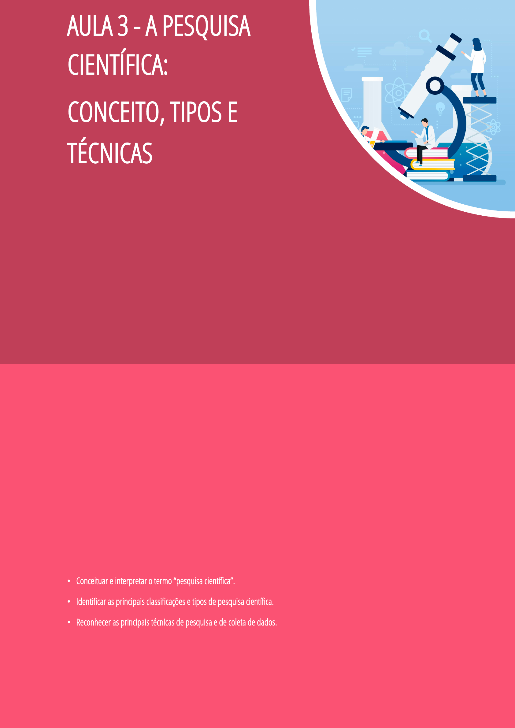 <p>à quantificação, análise e</p><p>interpretação de dados, utilizando-se de técnicas estatísticas. Os dados obtidos na pesquisa são mensuráveis ou quantificáveis;</p><p>empregando-se, para a sua análise, técnicas como porcentagem, mediana, desvio-padrão, dentre outras técnicas estatísticas; sendo,</p><p>ainda, possíveis de serem representados graficamente.</p><p>A Pesquisa Qualitativa é aquela cujos resultados não são analisados ou apresentados em formas de números, de</p><p>estatísticas; eles são interpretados, levando-se em conta aspectos subjetivos. É utilizada para investigar problemas que os</p><p>procedimentos estatísticos não podem alcançar, devido à sua complexidade; como aspectos psicológicos, opiniões, comportamentos</p><p>e atitudes de indivíduos ou grupos (RODRIGUES, 20006). Ou seja, os resultados do estudo de aspectos como os mencionados não</p><p>podem ser “transformados” em números e dados estatísticos; eles serão analisados e interpretados, segundo um raciocínio</p><p>predominantemente indutivo, pelo pesquisador.</p><p>2.3 CLASSIFICAÇÃO QUANTO À FINALIDADE DA PESQUISA</p><p>Quanto aos objetivos ou finalidades, de acordo com Rodrigues (2006), as Pesquisas podem ser classificadas como Exploratória,</p><p>Descritiva e Explicativa.</p><p>A Pesquisa Exploratória é considerada um estudo inicial que objetiva buscar informações sobre determinado assunto ou</p><p>descobrir um problema para estudo; utilizada, por exemplo, quando não se tem clareza sobre um determinado problema (RODRIGUES,</p><p>2006). Como explica Köche (2015), há casos em que não se tem um sistema de teorias e conhecimentos acerca de determinados</p><p>fenômenos que se deseja estudar. Nesses casos, o Autor explica que é necessário realizar uma investigação que identifique a natureza</p><p>do fenômeno e caracterize as variáveis que se quer estudar, relacionadas a esse fenômeno. Cervo, Brevian e Silva (2007)</p><p>complementam que a Pesquisa Exploratória não requer a elaboração de hipóteses a serem testadas no trabalho; restringindo-se a</p><p>definir objetivos e a buscar mais informações sobre determinado assunto. Realizam-se descrições precisas da situação estudada, na</p><p>busca de descobrir as relações existentes entre seus elementos componentes.</p><p>A Pesquisa Descritiva, como o nome indica, realiza descrições de fatos e fenômenos, sem haver interferência ou</p><p>manipulação desses fatos ou fenômenos. Busca descobrir a frequência com que o fenômeno estudado ocorre, sua natureza,</p><p>características, causas, relações e conexões com outros fenômenos (BARROS; LEHFELD, 2007). Exemplos da utilização desse tipo de</p><p>Pesquisa são os estudos que buscam descrever características de uma determinada comunidade; e, estudos de opinião ou de</p><p>motivações de determinados grupos, como estudantes de uma escola ou colaboradores de uma empresa.</p><p>A Pesquisa Explicativa é considerada o tipo de Pesquisa que mais aprofunda o conhecimento sobre o objeto estudado.</p><p>Seu principal objetivo é identificar os fatores que determinam ou contribuem para a ocorrência dos fenômenos; procurando explicar as</p><p>razões e causas das coisas (RODRIGUES, 2006).</p><p>2.4 CLASSIFICAÇÃO QUANTO À FORMA DE OBTENÇÃO DE INFORMAÇÕES</p><p>Antes de falarmos sobre a classificação das Pesquisas de acordo com a forma de obtenção dos dados, ou dos procedimentos e meios</p><p>utilizados na investigação, é pertinente diferenciar o que é uma Pesquisa Experimental e uma Pesquisa Não Experimental (Descritiva).</p><p>A classificação de uma Pesquisa como Experimental leva em conta a forma como o estudo é conduzido; o procedimento realizado na</p><p>investigação. Os outros tipos de Pesquisa, classificados de acordo com esse critério são, de acordo com Rodrigues (2006), divididos em</p><p>Pesquisas Bibliográficas, Documentais, de Campo e de Laboratório:</p><p>A Pesquisa Bibliográfica, que é aquela que se desenvolve tentando explicar um problema; utilizando-se, para isso, do</p><p>conhecimento disponível; é a Pesquisa realizada em material já publicado, como livros, revistas e artigos científicos, chamados de</p><p>fontes secundárias (KÖCHE, 2015; RODRIGUES, 2006). Segundo Fonseca (2002), qualquer Trabalho Científico inicia-se com a Pesquisa</p><p>A Pesquisa Experimental, também conhecida como</p><p>“Experimentação”, é aquela em que as variáveis relacionadas</p><p>ao objeto de estudo são manipuladas pelo pesquisador; ou</p><p>seja, para atingir resultados, o pesquisador faz uso de</p><p>aparelhos e instrumentos que a técnica moderna coloca a seu</p><p>alcance; ou, de procedimentos apropriados e capazes de</p><p>tornar perceptíveis as relações existentes entre as variáveis</p><p>envolvidas no estudo (CERVO; BERVIAN; SILVA, 2007).</p><p>A Pesquisa Descritiva, mencionada anteriormente, pode ser</p><p>chamada, também, de Pesquisa Não Experimental (KÖCHE,</p><p>2015), já que, como foi explicado, na Pesquisa Descritiva não</p><p>há interferência do pesquisador nos fatos e fenômenos</p><p>estudados; o pesquisador investiga os fatos sem manipulá-los.</p><p>Bibliográfica: ela permite ao pesquisador conhecer o que já se estudou sobre o assunto pesquisado; havendo, ainda, Pesquisas que são</p><p>unicamente bibliográficas; procurando as referências teóricas já publicadas, com o objetivo de recolher informações/conhecimentos</p><p>sobre o problema observado. Na vida acadêmica, você realizará diversas Pesquisas Bibliográficas, especialmente quando seus</p><p>Professores lhe solicitarem, na forma de trabalhos, a descrição ou a sistematização do Estado da Arte , de determinado tema de</p><p>estudo. Por essa razão, a Pesquisa Bibliográfica tem importância fundamental nos seus estudos.</p><p>A Pesquisa Documental é feita por meio de fontes primárias; utilizando documentos que, ainda, não 