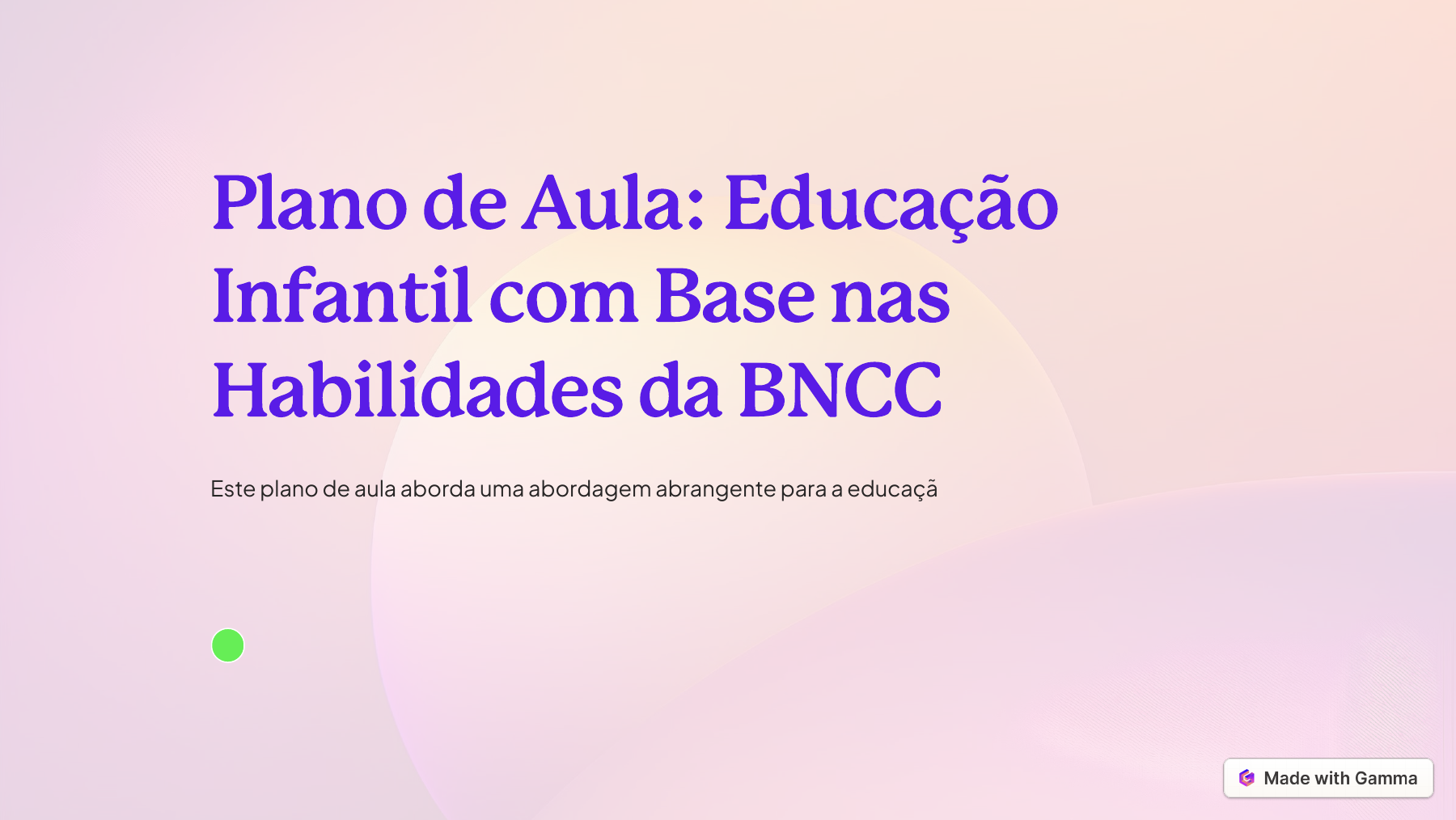 <p>Plano de Aula: Educação</p><p>Infantil com Base nas</p><p>Habilidades da BNCC</p><p>Este plano de aula aborda uma abordagem abrangente para a educação infantil, alinhada com as</p><p>habilidades estabelecidas na Base Nacional Comum Curricular (BNCC). Ele foi cuidadosamente</p><p>desenvolvido para fornecer uma estrutura sólida de aprendizagem, com objetivos claros, conteúdo</p><p>relevante e metodologias eficazes, visando o desenvolvimento integral das crianças.</p><p>by joao cabralJC</p><p>https://gamma.app</p><p>Objetivos de Aprendizagem</p><p>Promover o desenvolvimento cognitivo, motor, social e emocional das crianças</p><p>Estimular a curiosidade, a imaginação e a criatividade dos alunos</p><p>Desenvolver habilidades de comunicação, resolução de problemas e trabalho em equipe</p><p>Incentivar a exploração, a observação e a investigação do mundo ao redor</p><p>Fomentar o respeito, a empatia e a apreciação pela diversidade</p><p>https://gamma.app</p><p>Conteúdo Programático</p><p>Linguagem e</p><p>Comunicação</p><p>Desenvolvimento da fala, da</p><p>escrita e da compreensão de</p><p>textos. Exploração de</p><p>diferentes gêneros literários.</p><p>Matemática e Raciocínio</p><p>Lógico</p><p>Noções de números, formas</p><p>geométricas, padrões,</p><p>medidas e resolução de</p><p>problemas.</p><p>Mundo Natural e Social</p><p>Conhecimento sobre o corpo</p><p>humano, animais, plantas,</p><p>fenômenos naturais e a</p><p>comunidade local.</p><p>https://gamma.app</p><p>Metodologia de Ensino</p><p>1 Aprendizagem Ativa</p><p>Promoção de atividades práticas,</p><p>experienciais e baseadas na exploração,</p><p>para envolver ativamente as crianças no</p><p>processo de aprendizagem.</p><p>2 Abordagem Lúdica</p><p>Utilização de jogos, brincadeiras, canções</p><p>e histórias para tornar o aprendizado</p><p>divertido e envolvente.</p><p>3 Diferenciação Pedagógica</p><p>Adaptação das estratégias de ensino para</p><p>atender às necessidades e estilos de</p><p>aprendizagem individuais das crianças.</p><p>4 Aprendizagem Colaborativa</p><p>Promoção de atividades em grupo,</p><p>incentivando a cooperação, a troca de</p><p>ideias e o desenvolvimento de habilidades</p><p>sociais.</p><p>https://gamma.app</p><p>Recursos Didáticos</p><p>Materiais Lúdicos</p><p>Uma variedade de brinquedos,</p><p>jogos, livros, materiais de artes</p><p>e ofícios para despertar a</p><p>curiosidade e o engajamento</p><p>das crianças.</p><p>Tecnologia Educacional</p><p>Uso de tecnologias como</p><p>lousa digital, tablets e</p><p>aplicativos educativos para</p><p>enriquecer as experiências de</p><p>aprendizagem.</p><p>Recursos Visuais</p><p>Cartazes, fichas, imagens e</p><p>outros recursos visuais para</p><p>apoiar a compreensão e a</p><p>memorização dos conteúdos.</p><p>https://gamma.app</p><p>Avaliação</p><p>Observação Contínua Monitoramento do progresso e do</p><p>envolvimento das crianças durante as</p><p>atividades.</p><p>Portfólio de Trabalhos Compilação de produções, desenhos e</p><p>registros das crianças, demonstrando seu</p><p>desenvolvimento.</p><p>Apresentações Orais Oportunidades para as crianças</p><p>compartilharem seus conhecimentos e</p><p>habilidades.</p><p>Feedback Formativo Orientação e apoio contínuo para que as</p><p>crianças aprimorem suas aprendizagens.</p><p>https://gamma.app</p><p>Adaptações e Inclusão</p><p>1</p><p>Identificar Necessidades</p><p>Realizar uma avaliação cuidadosa das necessidades individuais de cada criança,</p><p>incluindo possíveis deficiências ou dificuldades de aprendizagem.</p><p>2</p><p>Adaptar Estratégias</p><p>Desenvolver estratégias de ensino e recursos diferenciados, para atender às</p><p>necessidades específicas de cada aluno e promover a inclusão.</p><p>3</p><p>Colaborar com Especialistas</p><p>Estabelecer uma parceria com profissionais da saúde e da educação, a fim de obter</p><p>orientações e apoio para um atendimento mais eficaz.</p><p>https://gamma.app</p><p>Conclusão</p><p>Este plano de aula para a educação infantil, fundamentado nas habilidades da BNCC, oferece uma</p><p>abordagem abrangente e enriquecedora para o desenvolvimento integral das crianças. Ao combinar</p><p>estratégias lúdicas, recursos didáticos variados e uma atenção especial à inclusão, este plano visa</p><p>proporcionar uma experiência de aprendizagem significativa, envolvente e adaptada às</p><p>necessidades de cada aluno. Com essa estrutura, as crianças poderão explorar, descobrir e crescer</p><p>de maneira saudável e plena.</p><p>https://gamma.app</p>