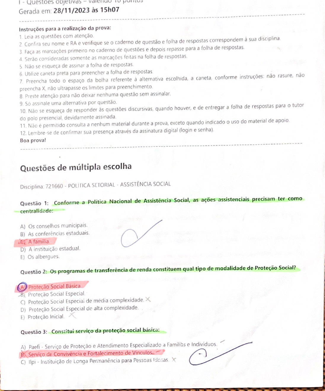<p>Questoes Gerada em: 28/11/2023 às 15h07 Instruções para a realização da prova: Leia as questões com atenção. Confira seu nome e RA e verifique se o caderno de questão e folha de respostas correspondem à sua disciplina. Faça as marcações primeiro no caderno de questões e depois repasse para a folha de respostas. 4. Serão consideradas somente as marcações feitas na folha de respostas. Não se esqueça de assinar a folha de respostas. 6. Utilize caneta preta para preencher a folha de respostas. 7. Preencha todo espaço da bolha referente à alternativa escolhida, a caneta, conforme instruções: não rasure, não preencha X, não ultrapasse os limites para preenchimento Preste atenção para não deixar nenhuma questão sem 9. Só assinale uma alternativa por questão. Não se esqueça de responder às questões discursivas, quando houver, e de entregar a folha de respostas para tutor do polo presencial, devidamente 11. Não é permitido consulta a nenhum material durante a prova, exceto quando indicado uso do material de apoio. 12. Lembre-se de confirmar sua presença através da assinatura digital (login e senha) Boa prova! Questões de múltipla escolha Disciplina: 721660 POLÍTICA SETORIAL ASSISTÊNCIA SOCIAL Questão 1: Conforme a Política Nacional de Assistência Social, as ações assistenciais precisam ter como centralidade: A) Os conselhos municipais. B) As conferências A D) A instituição E) Os albergues. Questão 2: Os programas de transferência de renda constituem qual tipo de modalidade de Proteção Social? Proteção Social Básica Proteção Social C) Proteção Social Especial de média D) Proteção Social Especial de alta complexidade. E) Proteção Inicial. Questão 3: Constitui serviço da proteção social básica: A) Paefi Serviço de Proteção e Atendimento Especializado a Famílias e Serviço de Convivência e Fortalecimento de Vínculos. C) Instituição de Longa Permanência para Pessoas</p><p>Serviço de proteção social a adolescentes em cumprimento de medida socioeducativa (MSE) de liberdade assistida (LA) e de prestação de serviços à comunidade E) Serviço de proteção em situações de calamidades públicas e de Questão 4: Planejar deve constituir-se de atividade presente no trabalho do profissional de Serviço Social, inclusive amparado pela Lei de Regulamentação da Profissão n. 8.662/1993, a qual define com precisão: Atribuições e competências do profissional de Serviço Social, trazendo vários direcionamentos às ações de gestão, programas ou projetos em que haja especificidade da matéria B) implementação e avaliação de políticas sociais por meio de planos, programas ou projetos em que haja especificidade da matéria. C) ações de gestão, administração, implementação e avaliação de políticas sociais de planos, programas ou projetos em que haja especificidade da D Atribuições e competências do profissional de Serviço Social, trazendo vanos às ações de gestão, administração, implementação e avaliação de políticas sociais por meio de planos, programas ou projetos em que haja especificidade da E) Atribuições e competências do profissional de Serviço Social, trazendo vários direcionamentos às ações de gestão Questão 5: No quadro a seguir estão dispostas as seguranças afianças e suas respectivas ações da proteção social. Faça a analise e associação correspondente entre a coluna da esquerda com a coluna da direita. 1-Segurança de Por meio de beneficios continuados e eventuais que assegurem proteção social básica à pessoas idosas e pessoas com deficiência, pessoas e famílias vítimas de calamidades e situações de forte fragilidade pessoal e familiar 2-Segurança de sobrevivência ou de b- Por meio de cuidados e serviços que restabeleçam vínculos rendimento e de pessoais, familiares, de vizinhança, de segmento 3- Segurança de convívio ou vivência C- Por meio de cuidados, servisose projetos operados em rede familiar com unidade de porta de entrada destinada a proteger e recuperar as situações de abendano e isolamento A associação correta é da alternativa: A) 1.a, 2.b. 3.c. B) 3.a 2.a, 3.b 1.c. 3.a. E) 1.a, 3.b. Questão 6: Nos processos de intervenção da assistência social, a participação popular é importante por quê: Serve de instrumento para regular a atuação do Estado às reais necessidades da população, caracterizando assim os básicos do Estado Democrático de II. Facilita a burocratização dos processos decisórios, ao exigir diversas instâncias de III. Reafirma nossa herança cultural marcada por períodos de repressão violenta a qualquer forma de participação e manifestação popular. IV. Atua como mecanismo de garantia que os direitos sociais sejam assegurados de forma universal à população, garantindo assim os princípios de proteção social e dos direitos humanos. Nossa herança colonial e suas práticas de exploração exacerbadas nos delegam limitações culturais e políticas à questão da participação e reconhecimento dos direitos sociais e civis. Estão certos APENAS os itens: A) Questão 7: As diretrizes que devem referendar as ações em Assistência Social no Brasil são as seguintes:</p><p>A defesa de direitos, que visa a garantir pleno acesso aos direitos no conjunto das provisões Participação da III Primazia da responsabilidade do Estado. administrativa V. A Descentralização proteção social, que visa à garantia da vida, à redução de danos e à prevenção da incidência de Estão corretas as afirmativas: II e III. e IV e V V de serviços, programas e projetos que visa a prevenir situações Social) de risco é: e que tais Questão serviços são 8: executados o conjunto de forma direta nos CRAS (Centros de Referência de Assistência A) Proteção Social Básica B) Proteção Social Especial. C) Proteção Social Especial de média complexidade. Proteção Social Especial de alta complexidade. E) Pr