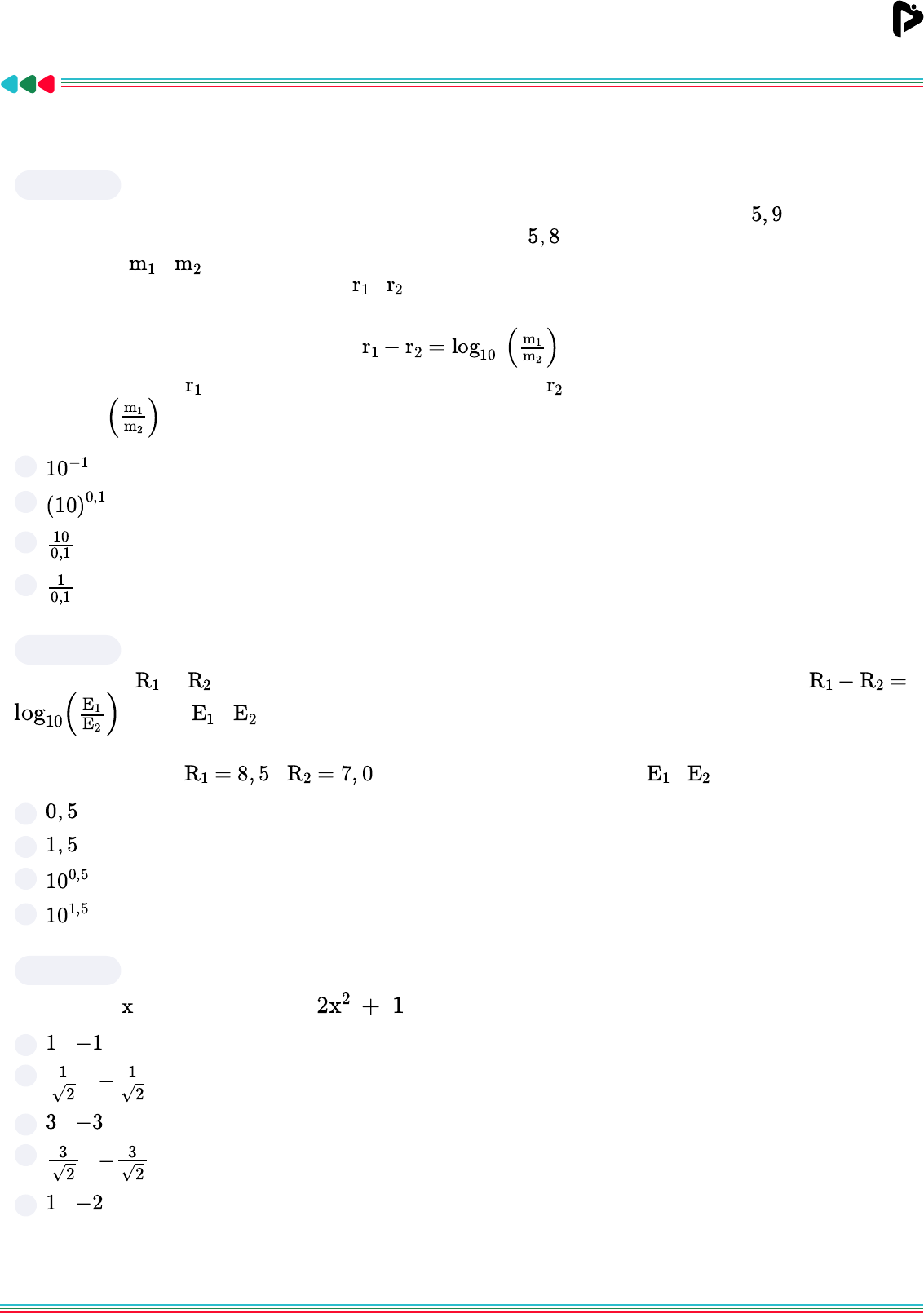 <p>LISTA DE EXERCÍCIOS</p><p>LOGARITMO - AVANÇADO 2</p><p>CONTROLE: 24fb32c55272a751e15be82bfadec712d0877c739f67259d178a698c85d4bf9566f14b2116db88b2990fcdfe2a989eaa54122d8f0a32fa43609b521c06de522999c5d4672f22a3b91a270de7a05a19eebf9058bcabe3af0fbdd20e17c6a9afc9382f89c9c4dd4b242bcaa37495437b8facf92f21c912611cebf51957d73f7f11a53dcf209eadbbe7c4abe83570adc24fe179e9e922d017205e5cfb326cc37ff5</p><p>Questão 1/5</p><p>No dia 6 de junho de 2000, um terremoto atingiu a cidade de Ankara, na Turquia, com registro de graus na escala</p><p>Richter e outro terremoto atingiu o oeste do Japão, com registro de graus na escala Richter.</p><p>Considere que e medem a energia liberada sob a forma de ondas que se propagam pela crosta terrestre por</p><p>terremotos com registros, na escala Richter, e , respectivamente.</p><p>Sabe-se que estes valores estão relacionados pela fórmula</p><p>Considerando-se que seja o registro do terremoto da Turquia e o registro do terremoto do Japão, pode-se</p><p>a�rmar que é igual a:</p><p>A .</p><p>B</p><p>C .</p><p>D .</p><p>Questão 2/5</p><p>As indicações e de dois terremotos, na escala Richter, estão relacionadas pela fórmula</p><p>, em que e medem as respectivas energias, liberadas pelos terremotos em forma de ondas que</p><p>se propagam pela crosta terrestre.</p><p>Nessas condições, se e , é correto a�rmar que a razão entre e , nessa ordem, é igual a:</p><p>A .</p><p>B .</p><p>C .</p><p>D .</p><p>Questão 3/5</p><p>Os valores de tais que o logaritmo de na base 10 é igual a 1 são:</p><p>A e .</p><p>B e .</p><p>C e .</p><p>D e .</p><p>E e .</p><p>5, 9</p><p>5, 8</p><p>m1 m2</p><p>r1 r2</p><p>r1 − r2 = log10 ( m1</p><p>m2</p><p>)</p><p>r1 r2</p><p>( m1</p><p>m2</p><p>)</p><p>10−1</p><p>(10)0,1</p><p>10</p><p>0,1</p><p>1</p><p>0,1</p><p>R1 R2 R1 − R2 =</p><p>log10(</p><p>E1</p><p>E2</p><p>) E1 E2</p><p>R1 = 8, 5 R2 = 7, 0 E1 E2</p><p>0, 5</p><p>1, 5</p><p>100,5</p><p>101,5</p><p>x 2x2 + 1</p><p>1 −1</p><p>1</p><p>√2</p><p>− 1</p><p>√2</p><p>3 −3</p><p>3</p><p>√2</p><p>− 3</p><p>√2</p><p>1 −2</p><p>LISTA DE EXERCÍCIOS</p><p>LOGARITMO - AVANÇADO 2</p><p>CONTROLE: 24fb32c55272a751e15be82bfadec712d0877c739f67259d178a698c85d4bf9566f14b2116db88b2990fcdfe2a989eaa54122d8f0a32fa43609b521c06de522999c5d4672f22a3b91a270de7a05a19eebf9058bcabe3af0fbdd20e17c6a9afc9382f89c9c4dd4b242bcaa37495437b8facf92f21c912611cebf51957d73f7f11a53dcf209eadbbe7c4abe83570adc24fe179e9e922d017205e5cfb326cc37ff5</p><p>Questão 4/5</p><p>Se , para , então</p><p>A</p><p>.</p><p>B</p><p>.</p><p>C .</p><p>D .</p><p>E .</p><p>Questão 5/5</p><p>Calcule o valor do .</p><p>A .</p><p>B .</p><p>C .</p><p>D .</p><p>E .</p><p>log2 y= − 1</p><p>2 + 2</p><p>3 log2 x x > 0</p><p>y =</p><p>3√x2</p><p>√2</p><p>y =√ x3</p><p>2</p><p>y = − 1</p><p>√2</p><p>+</p><p>3√x2</p><p>y = √2 ⋅ 3√x2</p><p>y = √2x3</p><p>log8 16</p><p>1</p><p>2</p><p>1</p><p>2</p><p>3</p><p>4</p><p>3</p><p>2</p><p>LISTA DE EXERCÍCIOS</p><p>LOGARITMO - AVANÇADO 2</p><p>CONTROLE: 24fb32c55272a751e15be82bfadec712d0877c739f67259d178a698c85d4bf9566f14b2116db88b2990fcdfe2a989eaa54122d8f0a32fa43609b521c06de522999c5d4672f22a3b91a270de7a05a19eebf9058bcabe3af0fbdd20e17c6a9afc9382f89c9c4dd4b242bcaa37495437b8facf92f21c912611cebf51957d73f7f11a53dcf209eadbbe7c4abe83570adc24fe179e9e922d017205e5cfb326cc37ff5</p><p>Gabarito</p><p>1 A B C D</p><p>2 A B C D</p><p>3 A B C D E</p><p>4 A B C D E</p><p>5 A B C D E</p>