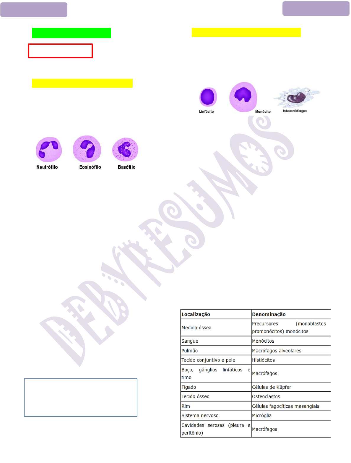 <p>DEBYRESUMOS DEBYRESUMOS</p><p>ANATOPATOLOGIA</p><p>INFLAMACION</p><p>Células Polimorfonucleares</p><p>Son leucocitos más abundantes</p><p>Posue gránulos → GRANULOCITOS</p><p>Están presentes en Inflamación Aguda</p><p>NEUTRÓFILO</p><p>Célula de primera línea de defesa</p><p>Primera célula a llegar en la inflamación aguda</p><p>Células más abundantes</p><p>Función de fagocitar microorganismos</p><p>EOSINÓFILO</p><p>Células de defesa</p><p>Presentes en inflamación agudo, y en</p><p>proceso inflamatorios crónicos como alergia,</p><p>parasitosis.</p><p>BASÓFILO</p><p>Son menos numerosos</p><p>Gránulos que liberan histamina y heparina</p><p>MASTOCITOS</p><p>Posue receptores de IgE</p><p>Possue gránulos con HISTAMINA</p><p>Células Monomorfo nucleares</p><p>Son leucocitos menos abundantes</p><p>No posee gránulos→ AGRANULOCITOS</p><p>Están presentes en Inflamación Crónica</p><p>LINFOCITO</p><p>Son células de defesa</p><p>Linfocitos T respuesta inmune humoral</p><p>Linfocitos B producción de anticuerpos</p><p>Evolucionan en Células Plasmáticas</p><p>MONOCITOS</p><p>Son células precursora de los macrófagos</p><p>Diferencian en Macrófagos ao llegar en tejido</p><p>Possue gránulos inactivos</p><p>Están presentes en la circulación</p><p>MACROFAGOS</p><p>Son células derivadas de monocitos</p><p>Están localizados en tejido y órganos</p><p>Función de defesa del organismo</p><p>Dependendo de lo tejido receben nombre</p><p>diferente</p><p>DEBYRESUMOS DEBYRESUMOS</p><p>INFLAMACION</p><p>Que es la Inflamacion?</p><p>Es una respuesta de los tejidos vascularizados</p><p>a las infecciones y al daño tisular.</p><p>Que ocurri ?</p><p>Las células y moléculas encargadas de la</p><p>defensa pasen de la circulación a los tejidos</p><p>en que son necesarias, a fin de eliminar los</p><p>agentes causantes de la agresión.</p><p>La función de la Inflamación?</p><p>Protectora, sirve para librar al anfitrión de la</p><p>causa inicial de la lesión y sus consecuencias.</p><p>Atua diluyendo, destruyendo o neutralizando</p><p>los agentes perjudiciales.</p><p>La inflamación es una respuesta buena</p><p>pero se si perpetúa pasa a maléfica y</p><p>perjudicial al organismo.</p><p>MEDIADORES QUÍMICOS</p><p>Pueden ser de origen Celular o Plasmática</p><p>Están circulando normalmente en la sangre y</p><p>ser reclutados en cualquier parte del cuerpo, o</p><p>también están presentes en los tejidos.</p><p>→Leucocitos fagocíticos</p><p>→Anticuerpos</p><p>→Proteínas del complemento</p><p>ESTIMULOS para la Inflamación Aguda</p><p>Infecciones: bactérias, vírus, hongos, parasitos.</p><p>Agentes Químicos y Físicos: lesión térmica,</p><p>quemaduras, radiaciones, sustancias químicas.</p><p>Traumatismo: contusos y penetrantes ,</p><p>Necrosis tisular: isquemia</p><p>*Cuerpos extraños: astillas, suciedad, suturas.</p><p>*Reacciones inmunitarias (hipersensibilidad):</p><p>patologias auto imunitárias o reacciones por</p><p>agentes ambientales, alérgenos, respuesta</p><p>contra auto antígenos, y microbios.</p><p>ETAPAS DE LA REACCIÓN INFLAMATORIA</p><p>1. Reconocimiento: células reconocen el</p><p>agente causal en tejido extravascular.</p><p>2. Reclutamiento: leucocitos y proteínas</p><p>plasmáticas pasan de la circulación al tejido</p><p>en que se haya el agente causal (agresor).</p><p>3. Erradicación: leucocitos y proteínas son</p><p>activados y actúan en la destruición y</p><p>eliminación de sustancia lesiva.</p><p>4. Regulación: reacción es controlada y</p><p>concluida.</p><p>5. Resolución: tejido dañado es reparado.</p><p>Propiedades Fundamentales del</p><p>Proceso Inflamatório</p><p>→ Componentes: Vasos sanguíneos,</p><p>linfáticos y Leucocitos.</p><p>→Consecuencias: Daño local asociado a</p><p>signos y síntomas sistémicos de resolución</p><p>espontánea, o respuestas permanente.</p><p>→Inflamación local o sistémica:</p><p>Reacción local con repercusión sistémica;</p><p>Reacción sistémica que originan anomalías</p><p>patológicas generalizadas (sepsis, SIRS).</p><p>→Mediadores del proceso Inflamatorio:</p><p>Factores producidos por células, microbios,</p><p>células necróticas, hipoxia; derivados de</p><p>proteínas plasmáticas.</p><p>→ Conclusión de la inflamación e inicio de</p><p>la reparación: eliminación del agente causal,</p><p>proceso de reparación tisular (curación del</p><p>tejido dañado).</p><p>El tejido lesionado es reemplazado por</p><p>regeneración de las células supervivientes</p><p>y el relleno de los defectos residuales con</p><p>tejido conjuntivo (cicatrización).</p><p>DEBYRESUMOS DEBYRESUMOS</p><p>Mecanismo Fisiopatológico</p><p>Mecanismo Fisiopatológico</p><p>INFLAMACION AGUDA</p><p>Es una respuesta rápida y duración curta</p><p>→ minutos, horas, pocos días.</p><p>Inmunidad innata*</p><p>Características Específicas</p><p>1. Exudado extravasación de líquidos y</p><p>proteínas plasmáticas. EDEMA*</p><p>2. Migración de leucocitos polimorfo nucleares</p><p>predominio de NEUTRÓFILOS*</p><p>Proceso de Reparación: REGENERACIÓN</p><p>Si la respuesta no erradica el estímulo,</p><p>la reacción inflamatoria puede evolucionar</p><p>a INFLAMACIÓN CRÓNICA</p><p>3 componentes principales</p><p>de la inflamación aguda ¿</p><p>1. Vasodilatación de pequeños vasos</p><p>(aumento del flujo sanguíneo)</p><p>2. Aumento de la permeabilidad de la</p><p>microvasculatura (arteriola, vénula, capilar)</p><p>3. Migración de leucocitos al foco de lesión y</p><p>activación para eliminación del agente causal</p><p>SIGNOS CARDINALES DE LA</p><p>INFLAMACIÓN AGUDA (CELSO)</p><p>RUBOR, CALOR, TUMOR, DOLOR</p><p>QUINTO SIGNO, AÑADIDO POR VIRCHOW</p><p>PÉRDIDA DE FUNCIÓN</p><p>REACCIONES VASCULARES</p><p>→Cambios en el flujo sanguíneo</p><p>Optimizar el movimiento de las proteínas</p><p>plasmáticas</p><p>→Permeabilidad de los vasos</p><p>Permite el pase de los leucocitos, para desde</p><p>