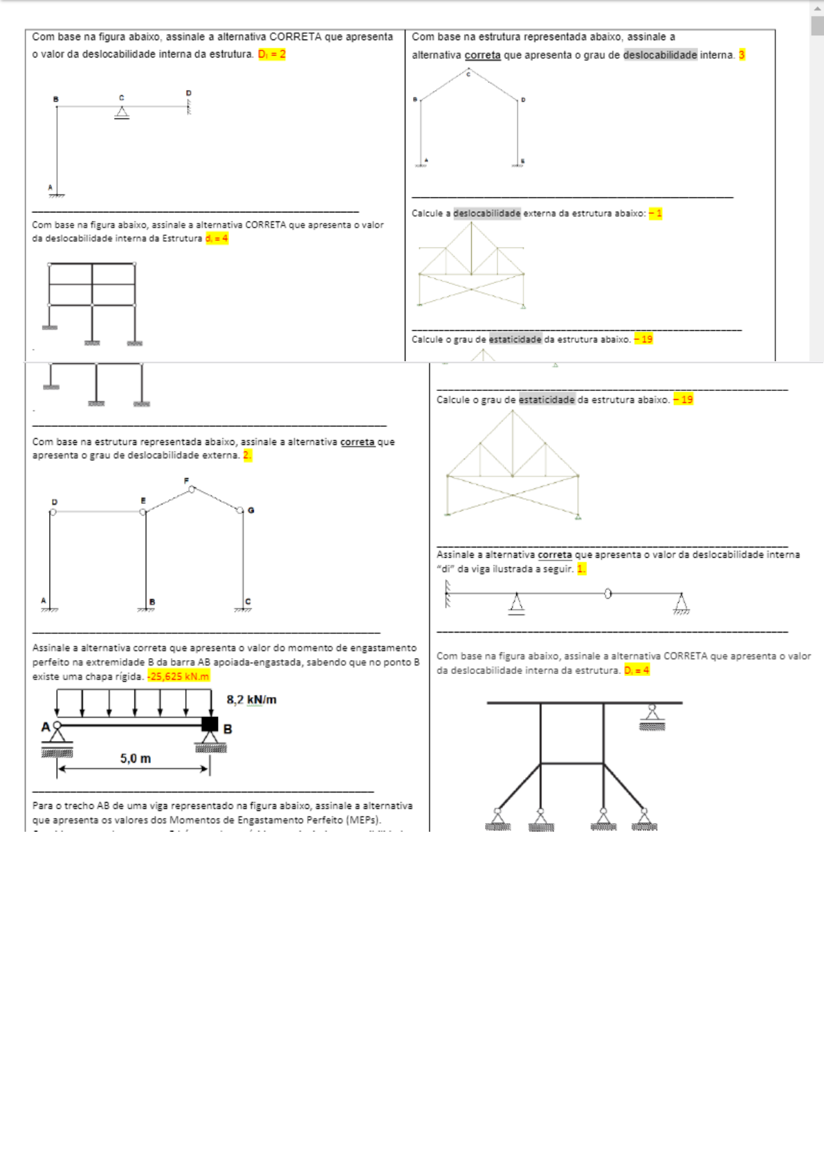 <p>Com base na figura abaixo, assinale a alternativa CORRETA que apresenta Com base na estrutura representada abaixo, assinale a o valor da deslocabilidade interna da alternativa correta que apresenta o grau de deslocabilidade interna. 3 D A Calcule a deslocabilidade externa da estrutura abaixo: Com base na figura abaixo, assinale a alternativa CORRETA que apresenta o valor da deslocabilidade interna da Estrutura Calcule o grau de estaticidade da estrutura abaixo. 19 Calcule o grau de estaticidade da estrutura abaixo. 19 Com base na estrutura representada abaixo, assinale a alternativa correta que apresenta o grau de deslocabilidade externa. 2 F D E G Assinale a alternativa correta que apresenta o valor da deslocabilidade interna "di" da viga ilustrada a seguir. A B Assinale a alternativa correta que apresenta o valor do momento de engastamento Com base na figura abaixo, assinale a alternativa CORRETA que apresenta o valor perfeito na extremidade B da barra AB apoiada-engastada, sabendo que no ponto B da deslocabilidade interna da estrutura. existe uma chapa -25,625 kN.m 8,2 kN/m A B 5,0 m Para o trecho AB de uma viga representado na figura abaixo, assinale a alternativa que apresenta os valores dos Momentos de Engastamento Perfeito (MEPs).</p><p>Para o trecho AB de uma viga representado na figura abaixo, assinale a alternativa que apresenta os valores dos Momentos de Engastamento Perfeito (MEPs). Considere que sobre o ponto B há uma chapa restringindo as possibilidades de MAB = MBA -25 ou -25,625KNm Com base na viga esquematizada determine as deslocabilidades interna e externa da mesma. Considere que a viga possui El 8 kN/m Calcule o grau de estaticidade da estrutura esquematizada abaixo, -2 A B 7 2 5,0 m D 3,5 m m Com base na situação de carregamento de barra referente ao cálculo de ilustrado abaixo, assinale a alternativa correta que apresenta os MEPs atuantes em cada extremidade de barra. Utilize a convenção de = -5,21 e = 0 "Sabe-se que o coeficiente de distribuição de momento de uma barra com relação a um nó é a razão entre o coeficiente de rigidez à rotação da barra e o 2 kN/m somatório dos coeficientes de rigidez à rotação de todas as barras que convergem no Com base na informação anterior assinale a alternativa CORRETA que apresenta A B 4 kN.m o valor do somatório de todos os coeficientes de distribuição de momento de todas as barras adjacentes a um determinado nó. 3,0 m 2,0 m Com base na viga ilustrada a seguir, marque a alternativa que apresenta o valor Calcule as reações de apoio da figura abaixo, sabendo que :L1 = correto da reação de apoio vertical no ponto Para tanto, utilize o método das 6,00m; L2 = 5,50 m; L3 = 5,80 m; L4 4,90 m; = 28,50kN/m; = deformações e considere o produto = constante. 110,43 kN Com base na viga ilustrada, a seguir, marque a alternativa que apresenta o valor 46,50 kN/m; q3=39,70 kN/m; = 23,80 = 1; El3= aproximado do momento, em módulo, no ponto B. Para tanto, considere E e 3; constantes. Para a resolução, utilize o método das deformações. 41,65 kN.m = =235,19 kN; = 248,35kN; =183,71 VE 41,65kN; 25 kN.m 40 30 kN.m A barra 1 B barra 2 C D barra 3 A B C D 4,00 m 3,00 m 3,00 L1 L2 L3 L4 Para a estrutura a seguir, considerando um recalque para baixo no nó F, assinale a alternativa correta: Considerando as barras as barras afetadas pelo Observe a viga representada na figura abaixo. Utilizando o recalque seriam a AB e a CD método de Cross, determine o coeficiente de distribuição no nó A B B. Em seguida, marque a alternativa que apresenta a resposta correta. 0,43 e 0,57 4t 8 kN.m 12 kN.m 10 kN.m 6 kN.m C D A B C D 3.00 m 3.00 m 4.00 m E F 3.00 m</p><p>Calcule os momentos fletores da estrutura representada na Para a estrutura a seguir, assinale a alternativa correta. Considere todas figura abaixo, sabendo que :barra = 5;Barra BC, El2 = as simplificações. Todos os nós, exceto F,G e H, possuem uma deslocabilidade 3;barra CD, El3= 8. interna e os dois pavimentos podem sofrer deslocamento na Desta forma, há duas deslocabilidades MA = Kn.m; =39,6 kN.m; Mc = 21,1 kN.m; Mo =49,5kN.m. Calcule os momentos fletores da estrutura representada na 1 t/m figura abaixo, sabendo que AB = 3;Barra BC, = 6;barra CD, El3= 4. A B + MA = Kn.m; Ms =49,1 kN.m; 2t/m 30kN/m E D D 6m A B C F G H 4m 3m 4m mm 6m 6m Para o seguir accinale a alternativa Para o pórtico apresentado a seguir, assinale a alternativa Com base no pórtico abaixo assinale a alternativa CORRETA que apresenta os correta, considerando Adotando o SH com uma chapa valores dos coeficientes de distribuição do processo de Cross, referentes às barras no nó B e um apoio horizontal no nó B, numerados nesta 1,2 e 3 respectivamente. sequência, teremos no caso (1) uma rotação do nó B 10.00 2t/m B C 3m 1 D 2 3m A 6m 3.00 m 0.00 m Determine, por meio do Processo de Cross, a reação de apoio Adote os apoios A,B, e C sequencialmente da esquerda para direita. Considere todas as barras do mesmo material e de inércia constante 140,64 Determine, por meio do Processo de Cross, o momento máximo no ponto B. Adote uma precisão de 0,01 KN.m para os momentos e os apoios A,B, e C sequencialmente da esquerda para direita. Considere todas as barras do mesmo material e de inércia constante. 73,39 48KN 24 KN/m 12KN 2.5 6 m 2,5 m</p><p>Determine, por meio do Processo de Cross o momento de engastamento da viga abaixo. Adote uma precisão de 0,01 KN.m para os momentos e os apoios A,B,C,D e E sequencialmente da esquerda para direita. 61,89 Determine, por meio do Processo de Cross o coeficiente de distribuição no nó D e d. respectivamente), da viga abaixo. Adote os apoios A,B,C,D e E sequencialmente da esquerda para direita. = 0,53 e = 0,47 65 kN 35 kN 55 kN 45 kN 19 kN/m 13 kN/m 15 kN/m 11 kN/m 2,5 m 2,5 m 3 m 3,0 m 3,0 m 3,5 m 1,5 m Com base na viga ilustrada a seguir, assinale a alternativa correta que apresenta o valor do momento no apoio C. Para tanto, utilize o método das deform