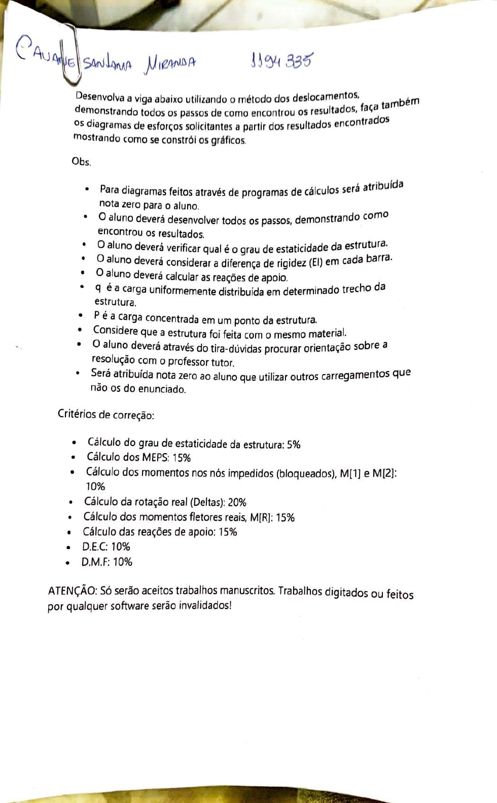 <p>Desenvolva a viga abaixo utilizando o método dos deslocamentos, t rnbérTl</p><p>demonstrando todos os passos de como encontrou os resultados, faça ª</p><p>d• 1 d contrados os 1agramas de esforços solicitantes a partir dos resu ta os en</p><p>mostrando como se constrói os gráficos.</p><p>Obs.</p><p>• , 1 á atribuída • Para diagramas feitos através de programas de calcu os ser</p><p>nota zero para o aluno.</p><p>• O aluno deverá desenvolver todos os passos, demonstrando corno</p><p>encontrou os resultados.</p><p>• O aluno deverá verificar qual é o grau de estaticidade da estrutura.</p><p>• O aluno deverá considerar a diferença de rigidez (EI) em cada barra.</p><p>• O aluno deverá calcular as reações de apoio.</p><p>• q éª carga uniformemente distribuída em determinado trecho da</p><p>estrutura.</p><p>• Pé a carga concentrada em um ponto da estrutura.</p><p>• .Considere que a estrutura foi feita com o mesmo material.</p><p>• O aluno deverá através do tira-dúvidas procurar orientação sobre ª</p><p>resolução com o professor tutor.</p><p>• Será atribuída nota zero ao aluno que utilizar outros carregamentos que</p><p>não os do enunciado.</p><p>Critérios de correção:</p><p>• Cálculo do grau de estaticidade da estrutura: 5%</p><p>• Cálculo dos MEPS: 15%</p><p>• Cálculo dos momentos nos nós impedidos (bloqueados), M[1] .e M[2]:</p><p>10%</p><p>• Cálculo da rotação real (Deltas): 20%</p><p>• Cálculo dos momentos fletores reais, M[RJ: 15%</p><p>• Cálculo das reações de apoio: 15%</p><p>• D.E.C: 10%</p><p>• D.M.F: 10%</p><p>ATENÇÃO: Só serão aceites trabalhos manuscritos. Trabalhos digitados ou feitos</p><p>por qualquer software serão invalidados!</p><p>ql-kN/m P-kN q2-kN/m y/2</p><p>EI JEJ EI D /</p><p>I<</p><p>xm</p><p>>I<</p><p>y Dl</p><p>/</p><p>>\<</p><p>zm</p><p>Dados:</p><p>q, = 8,0 kN/m; P = 62 kN ; q2 = 24,0 kN/m</p><p>x = 7,4 m; y = 8,5 m; z = 8,0 m.</p><p>&i 11.rJ</p><p>i,o rJ \ tYT\ J 4., t)_. ~TV }tm</p><p>l</p><p>.</p><p>\</p><p>1</p><p>í l</p><p>' ....</p><p>1</p><p>t</p><p>r F y '2.Sl'Y'l k 77,v,r;P;:</p><p>•</p><p>t</p><p>":'.} '\ rr<) g ,'5 ,..,-ri ~,o rrr-</p><p>J+</p><p>r f i f</p><p>.</p><p>d 3""" - ve -\JI/ Jn=3~ \Je='=f</p><p>3-· ::: 3, 3 ,.. ':J - e.; 3 L. º 1-1, pe, e.,W,c /l</p><p>~-:: 5 .. /3</p><p>-~</p><p>i</p><p>1</p><p>s~ ,</p><p>1 '</p><p>;,f~</p><p>}</p><p>-1</p><p>fi</p><p>--</p><p>I</p><p>N(j</p><p>l<~o</p><p>f</p><p>4'tec~</p><p>- .</p><p>Cü</p><p>'-= ()</p><p>l .</p><p>- ,- - _.,</p><p>l</p><p>.,</p><p>.</p><p>• A- l\~-----:---13 Jj</p><p>Ll. t~. Li</p><p>) t-______ _,,__ .</p><p>+ ,_4 ,.,..,.._</p><p>6\~~ 8(.</p><p>1</p><p>' [</p><p>1 r Í- / •</p><p>{</p><p>1</p><p>1</p><p>{</p><p>·--r-</p><p>1 .</p><p>,. Ciê#M</p><p>¼Ja.vA JJ1~</p><p>q/\t~ Cü l f</p><p>1</p><p>1</p><p>fr\c.~= 4t-1-</p><p>1 1</p><p>1 t.r;.fl ;; ~5 EJ. / ...l.</p><p>,</p><p>1</p><p>o</p><p>1 1</p><p>r</p><p>1</p><p>~ 0 == ln</p><p>1</p><p>d IT= O,i5 tr-</p><p>....L</p><p>1</p><p>' 1</p><p>ri b M: i *</p><p>jJc?jh 33)</p><p>~l-L l</p><p>r' 1 l</p><p>e.!: E'l í -</p><p>1</p><p>, l</p><p>1 '3, Ü /Y"t°)</p><p>1</p><p>1</p><p>1</p><p>~i o</p><p>i</p><p>t</p><p>• 1</p><p>1..</p><p>·- f f .</p><p>- -1</p><p>,-</p><p>l</p><p>!</p><p>_ _j</p><p>-·</p><p>- --------</p><p>))1~</p><p>f(\D</p><p>----------</p><p>1</p><p>\</p><p>1</p><p>i</p><p>)),~</p><p>i./(\A ::- 0 (j</p><p>l 1 1,</p><p>1 - ~I d,t'., - l3~,JL 3 1 i' ti VBW'-1 • 1 ,Ll:::</p><p>.,. I I b .. 210 1 O l I -\- \J é ef.7 ' 1 1 l-t-=- O</p><p>\1 i, e¼:-:.,.~ ,.Qí=i<),1.l :: t ,36, 5 8 ')</p><p>1 -1 1 1'/ - - --</p><p>1 1</p><p>VA~ f~J;?.:J', b~ l-- . . •·</p><p>i- -t •• 1 .• ·</p><p>•</p><p>1</p><p>Vc t ~5,3J .. Jg~~O-</p><p>I l</p><p>.1 \J e c:l.i.A, :: • Cj éi , 6 3 ' 1 ~-</p><p>Dt.c.. L\\"\\l l</p><p>r</p><p>-- - ___ .. ,</p><p>'</p><p>c9i.83 ,_;,_ ~I</p><p>~= •.~,93=</p><p>a,</p><p>1 ••</p><p>L.</p><p>..,--</p><p>1</p><p>r</p><p>1</p><p>:«7t)v</p><p>1</p><p>1</p><p>. - -l</p><p>1</p><p>t-</p><p>; __ !</p><p>1</p><p>JJ 1 f!Ar.)DA</p><p>'••-r-••M ,</p><p>1 1</p><p>1</p><p>r-</p><p>-- -- 1</p><p>-t----1· ·--· • .. -- -- -,</p><p>!</p><p>7</p><p>1</p><p>1</p>