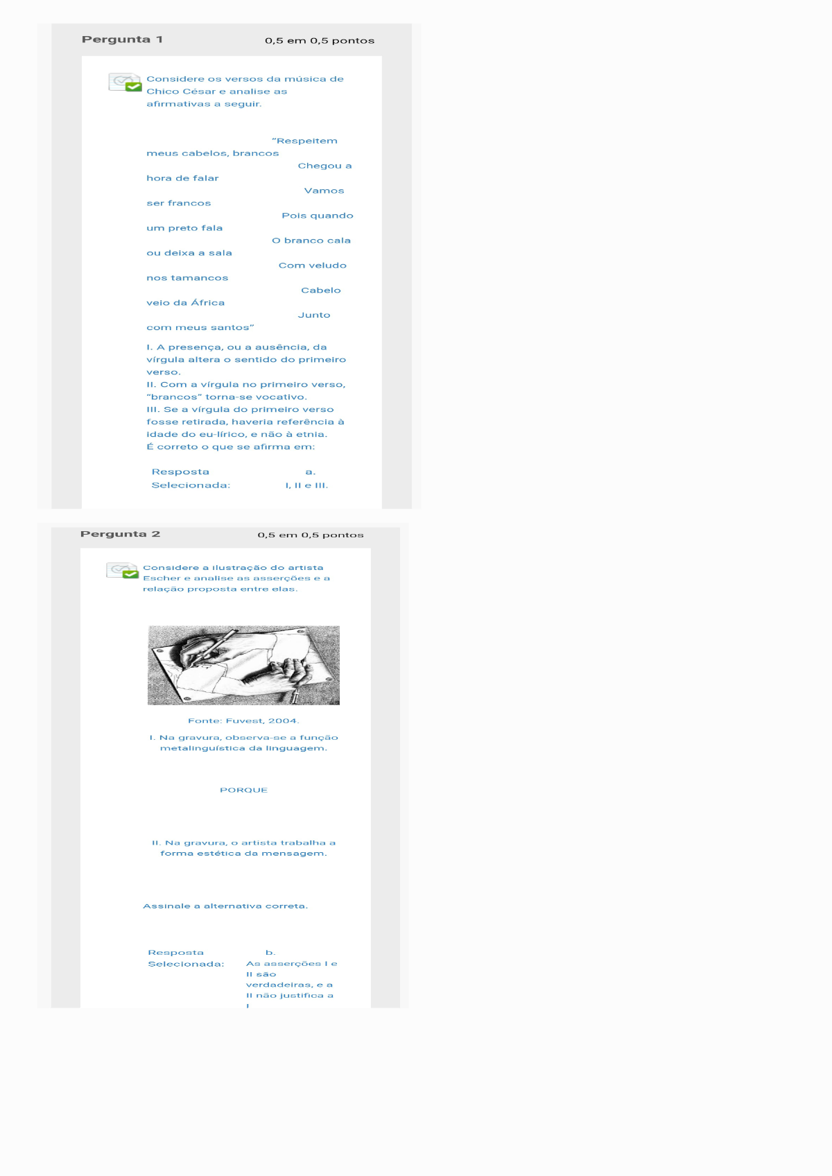 <p>Pergunta 1 0,5 em 0,5 pontos Considere os versos da música de Chico César e analise as afirmativas a seguir. "Respeitem meus cabelos, brancos Chegou a hora de falar Vamos ser francos Pois quando um preto fala branco cala ou deixa a sala Com veludo nos tamancos Cabelo veio da África Junto com meus santos" 1. A presença, ou a ausência, da vírgula altera sentido do primeiro verso. 11. Com a vírgula no primeiro verso, "brancos" torna-se vocativo. III. Se a vírgula do primeiro verso fosse retirada, haveria referência à idade do e não à etnia. É correto o que se afirma em: Resposta a. Selecionada: I, e III. Pergunta 2 0,5 em 0,5 pontos Considere a ilustração do artista Escher e analise as asserções e a relação proposta entre elas. Fonte: Fuvest, 2004. 1. Na gravura, observa-se a função metalinguistica da linguagem. PORQUE 11. Na gravura, artista trabalha a forma estética da mensagem. Assinale a alternativa correta. Resposta b. Selecionada: As asserções e 11 são e a 11 não justifica a</p><p>Pergunta 3 0,5 em 0,5 pontos Considere título jornalístico e analise as afirmativas. "Apresentador assume ter medo de morrer em entrevista" I. Há ambiguidade no título, pois entende-se que ele tem medo de morrer durante uma entrevista. II. Se a locução "em entrevista" fosse colocada após verbo "assume", problema do enunciado seria resolvido. III. A ambiguidade do título ocorre devido à polissemia da palavra "entrevista". É correto que se afirma em: Resposta b. Selecionada: le II. Pergunta 4 0,5 em 0,5 pontos Considere texto publicado na imprensa e analise as mais vez de morta central mata agressor no final do ara se nizar Saraogi roina da Texto: Em vez de ser morta há facadas, personagem central mata agressor a tiros no final do espetáculo para se A expressão "em vez de" é incorreta, deveria ser por "ao invés de" 11. correto é "a correto é "à IV. correto é "à tiros". É correto que se afirma apenas em: Resposta Selecionada: b.</p><p>Pergunta 5 0,5 em 0,5 pontos Considere texto a seguir e analise as afirmativas. "Ao chegar ao ancoradouro, recebeu Alzira Alves Filha um colar indígena feito de escamas de pirarucu e frutos do mar, que estava acompanhada de um grupo do Movimento Evangélico Unido." (Folha de S.Paulo, 12/02/92) I. texto pertence ao gênero textual notícia e apresenta estrutura II. Há um erro de regência verbal no texto. III. Observa-se falta de clareza, provocada pelo mau posicionamento da oração adjetiva. É correto que se afirma em: Resposta e. Selecionada: III, apenas. Pergunta 6 0,5 em 0,5 pontos Considere o texto escrito em um anúncio publicitário de um carro da categoria SUV. "Evite dirigir fora da estrada. Você pode não querer mais voltar para ela." Os dois períodos poderiam ser ligados por uma conjunção sem alteração do sentido pretendido pelo publicitário. Assinale a alternativa que apresenta a conjunção possível. Resposta C. Selecionada: Pois.</p><p>Pergunta 7 0,5 em 0,5 pontos Considere período e analise as "Ana estava muito cansada, por isso resolveu arrumar a casa inteira." uso da conjunção inadequada provoca incoerência no enunciado apresentado. A conjunção que une as orações do período deveria ser substituída por como "entretanto". III. Para unir as duas orações do período, deveria ser usado pronome É correto que se afirma em: Resposta C. Selecionada: Pergunta 8 0,5 em 0,5 pontos Observe a peça publicitária a seguir e analise as asserções e a relação proposta entre elas. BHAMRA CVEREJA PSLEIN VEZES BEBE E ACHA QUE ESTÁ TUDO EM ORDEM. MAS NÃO ou SE BEBER, NÃO DIRIJA. ambev 1. objetivo do anúncio é mostrar que quem bebe comete, sem perceber, erros ortográficos. PORQUE 11. A troca de letras nas palavras da peça publicitária alerta para fato de que álcool altera a percepção do consumidor</p><p>I. o objetivo do anúncio é mostrar que quem bebe comete, sem perceber, erros ortográficos. PORQUE II. A troca de letras nas palavras da peça publicitária alerta para o fato de que o álcool altera a percepção do consumidor. Assinale a alternativa correta. Resposta d. Selecionada: A asserção I é falsa. Pergunta 9 Considere o texto e analise as "O desenvolvimento de tecnologias de comunicação permitem que uma pessoa converse com outra em um país distante, na qual ocorre intercâmbio cultural, podendo aprender novos idiomas e costumes." 1. Na primeira oração, há um erro de concordância verbal: correto é "permite". 11. uso do elemento coesivo "na qual" está correto. III. Em "podendo aprender novos idiomas e costumes", há problema na construção sintática, pois falta o sujeito correto da oração. É correto o que se afirma em: Resposta d. Selecionada: III.</p><p>Pergunta 10 0,5 em 0,5 pontos Considere trecho, publicado em um jornal há alguns anos e analise as afirmativas. "Amantes dos antigos bolachões penam não para encontrar os discos, que ficam a cada dia mais raros. A dificuldade aparece também na hora de trocar a agulha ou levar toca-discos para concerto." primeiro período encontra-se fragmentado, pois não há continuidade da oração. 11. Há um erro ortográfico na palavra "concerto". III. texto é claro, coeso e bem estruturado. É correto que se afirma somente em: Resposta e. Selecionada:</p>