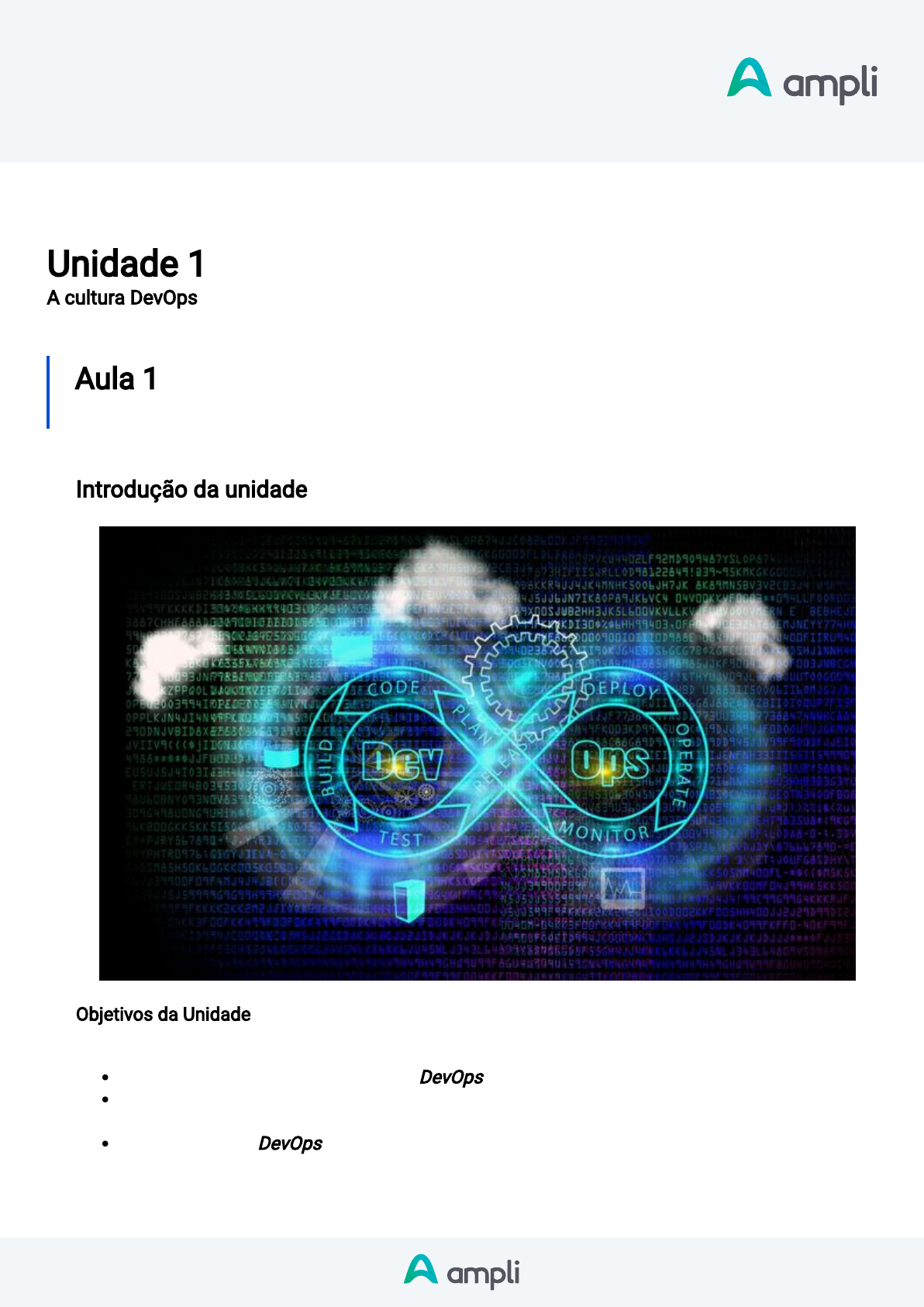 <p>Disciplina</p><p>Infraestrutura Ágil</p><p>Unidade 1</p><p>A cultura DevOps</p><p>Aula 1</p><p>A cultura DevOps</p><p>Introdução da unidade</p><p>Objetivos da Unidade</p><p>Ao �nal desta Unidade, você será capaz de:</p><p>analisar os fundamentos da cultura DevOps e da infraestrutura ágil;</p><p>discutir sobre os conceitos, ferramentas, evolução e importância no desenvolvimento de</p><p>softwares na atualidade;</p><p>apontar como a DevOps mudou a forma de pensar softwares.</p><p>Olá, estudante! Boas vindas!</p><p>Disciplina</p><p>Infraestrutura Ágil</p><p>A cultura digital moldou nossas práticas, costumes e formas de interação social. Era esperado</p><p>que o mundo dos negócios sofreria também um grande impacto com as transformações</p><p>oriundas do digital. Para atender a toda essa demanda de interação homem-máquina, houve um</p><p>crescimento exponencial no desenvolvimento de sistemas computacionais, sobretudo em</p><p>aplicativos simples, que atendam a demandas pontuais do cotidiano.</p><p>Esse crescimento exigiu maior agilidade e qualidade, já que a concorrência também aumentou e</p><p>a exigência por melhores experiências. O que se percebia era uma estrutura apartada, na qual os</p><p>pro�ssionais responsáveis pela operação desconheciam os processos da engenharia de</p><p>software, e os desenvolvedores, por sua vez, não tinham real noção das nuances envolvidas na</p><p>implementação de uma solução.</p><p>Sendo assim, o mercado de desenvolvimento de software passou a ter uma mentalidade</p><p>diferenciada, focada no usuário e em práticas ágeis que satis�zessem a vontade imediata do</p><p>cliente sem perder a qualidade. Para que essa carência fosse suprida, movimentos oriundos da</p><p>infraestrutura ágil desenvolveram uma organização de trabalho, a qual, de tão complexa, passou</p><p>a ser chamada de cultura, o DevOps.</p><p>Esta unidade lhe ajudará a conhecer os fundamentos da cultura DevOps e da infraestrutura ágil:</p><p>conceitos, ferramentas, evolução e importância no desenvolvimento de softwares na atualidade,</p><p>e a entender e fundamentar como a DevOps mudou a forma de pensar softwares, a padronização</p><p>da infraestrutura ágil e as formas de monitoramento e otimização de diferentes SO (sistemas</p><p>operacionais) e servidores.</p><p>Vamos conhecer essa cultura, as técnicas e as práticas que enfatizam o trabalho cooperativo</p><p>das equipes de desenvolvimento e operações. Essa envolvente “�loso�a”, que está ganhando o</p><p>mundo e vem se fortalecendo como método nas maiores empresas de desenvolvimento do</p><p>mundo.</p><p>Introdução da aula</p><p>Disciplina</p><p>Infraestrutura Ágil</p><p>Qual é o foco da aula?</p><p>Nesta aula, você irá estudar os principais conceitos da cultura DevOps.</p><p>Objetivos gerais de aprendizagem</p><p>Ao �nal desta aula, você será capaz de:</p><p>identi�car o per�l do pro�ssional inserido na cultura DevOps e como ele se adequa ao</p><p>mercado de trabalho;</p><p>apontar as vantagens da cultura DevOps;</p><p>analisar os conceitos da cultura DevOps, sua história e o impacto da transformação digital</p><p>a partir da união de ferramentas e da mudança de mentalidade na produção de softwares.</p><p>Situação-problema</p><p>Olá, estudante!</p><p>Disciplina</p><p>Infraestrutura Ágil</p><p>O conjunto de práticas, costumes e formas de interação social realizadas por meio da tecnologia</p><p>nos possibilitou uma nova forma de nos relacionarmos com o mundo. A interação homem-</p><p>máquina (IHC) é, hoje, uma realidade. Atividades rotineiras, como planejar uma viagem, fazer</p><p>uma compra, ler um livro, pensar um lazer com a família, dirigir-se até um determinado destino,</p><p>por exemplo, já são comumente facilitadas pelo uso de programas e/ou sistemas</p><p>computacionais. Software é o termo genérico usado para descrever esses programas.</p><p>Com uma cultura cada vez mais voltada para o digital, as empresas tiveram que se adequar às</p><p>novas realidades e passaram a produzir softwares para tratar de problemas diversos. Existem</p><p>softwares para analisar desempenho de setor, faturamento, �uxo de caixa, funcionários,</p><p>investimentos, etc. É de se esperar que, com tanta demanda, a área de desenvolvimento tenha</p><p>crescido exponencialmente.</p><p>O problema é que esse processo acontecia de forma desregrada e, muitas vezes, os</p><p>desenvolvedores não conseguiam dar conta de tanto trabalho. A entrega de softwares tornou-se</p><p>um problema em diversas empresas, e grande parte disso ocorre por conta da má distribuição de</p><p>funções entre as equipes.</p><p>A DevOps surge para automatizar os processos de desenvolvimento e de infraestrutura, criando</p><p>uma nova cultura de trabalho que facilita a capacidade de uma empresa em desenvolver e</p><p>distribuir aplicativos ou serviços de qualidade e em alta velocidade.</p><p>Focando em automação, pode-se criar uma política de trabalho colaborativo, de</p><p>compartilhamento de ferramentas e conhecimentos, que facilita o trabalho em equipe e cria uma</p><p>cultura de cooperação mútua.</p><p>Para contextualizar sua aprendizagem, imagine que você é um trainee em uma empresa de</p><p>desenvolvimento de software com padrões tradicionais de modelo de desenvolvimento em</p><p>cascata e hierarquia Top Down. A empresa trabalha com processos sequenciais, um longo</p><p>período para o planejamento, todos os custos e os cronogramas são bem de�nidos desde o</p><p>começo, tarefas são distribuídas e as equipes fazem todo o trabalho para que outra equipe o</p><p>complete até que a produção seja feita.</p><p>Há algum tempo, você tenta sugerir a mudança de mindset. Já argumentou que o mercado e as</p><p>transformações digitais pedem uma abordagem mais ágil, mas, como a empresa ainda é um</p><p>sucesso no mercado, o presidente, seu chefe, ainda não viu 